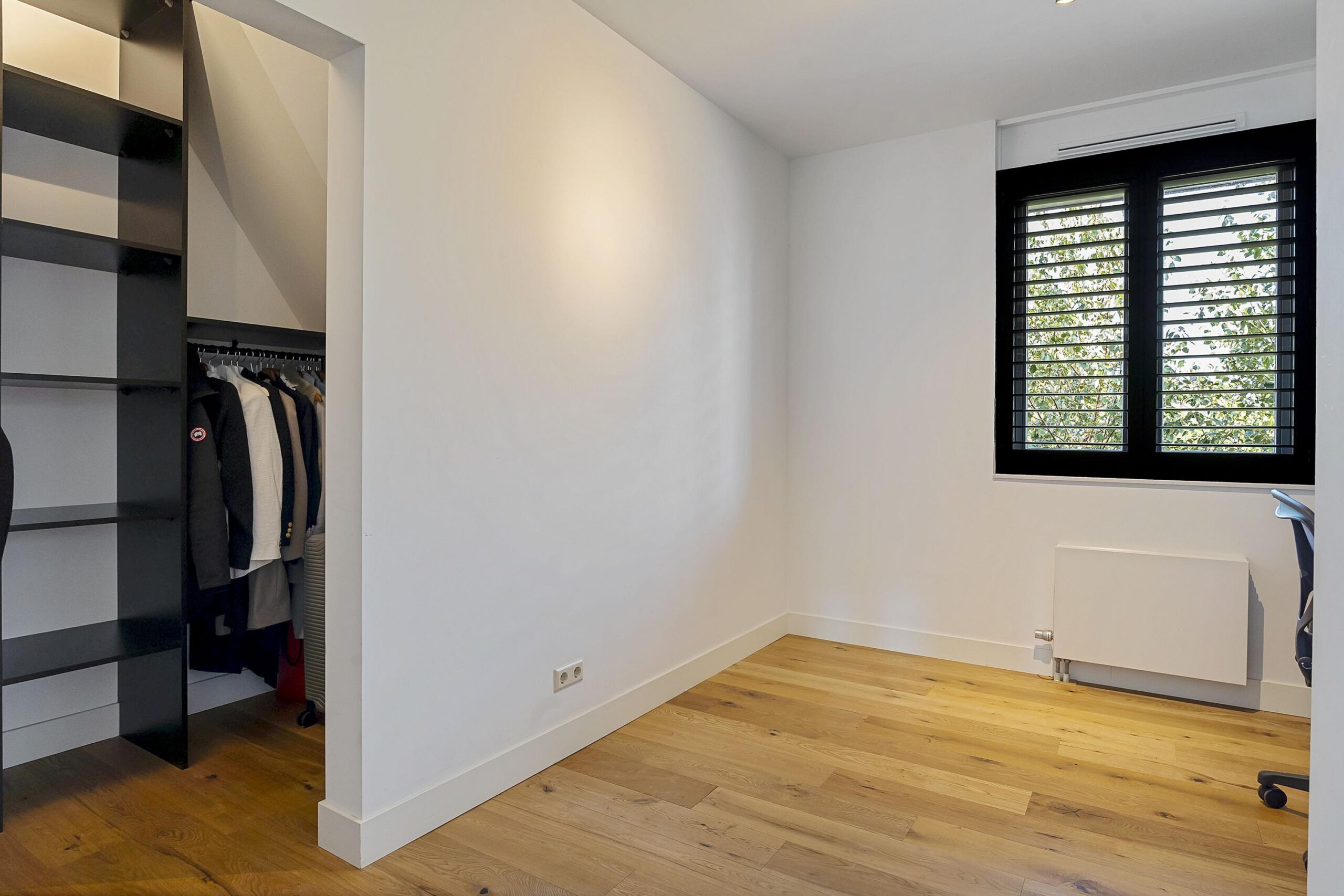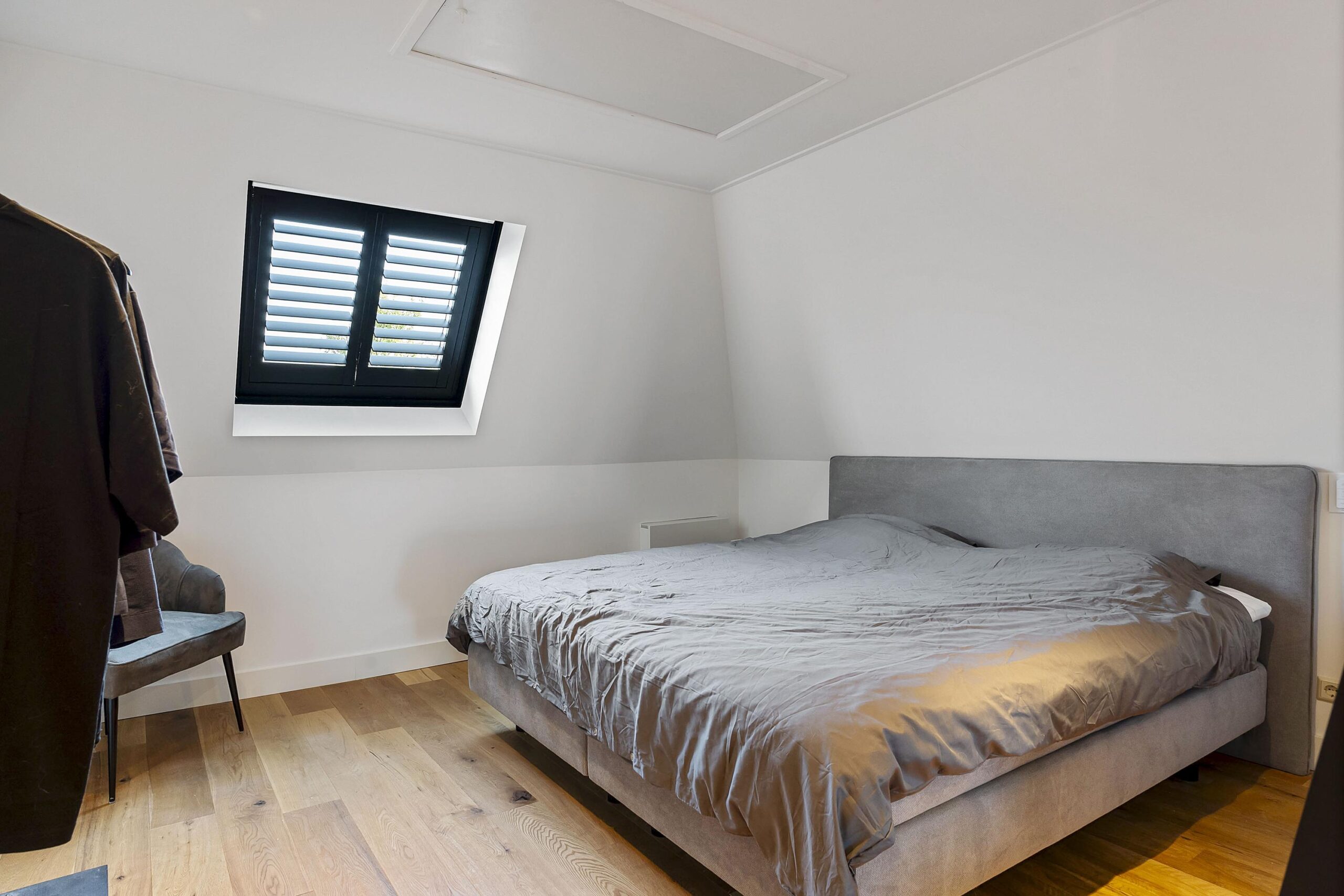 Via de stijlvolle overloop bereik je de luxe badkamer, die is uitgerust met een royale inloopdouche, ligbad, vrij hangend toilet en een elegante wastafel. Aan de achterzijde van de woning bevindt zich de riante master bedroom, compleet met een ruime walk-in closet en airco voor optimaal comfort. Slaapkamer 2, gelegen aan de voorzijde, beschikt over een vaste (inloop)kast, terwijl de ruime derde slaapkamer, met dakkapel en dakramen, een prachtige lichtinval en extra ruimte biedt.