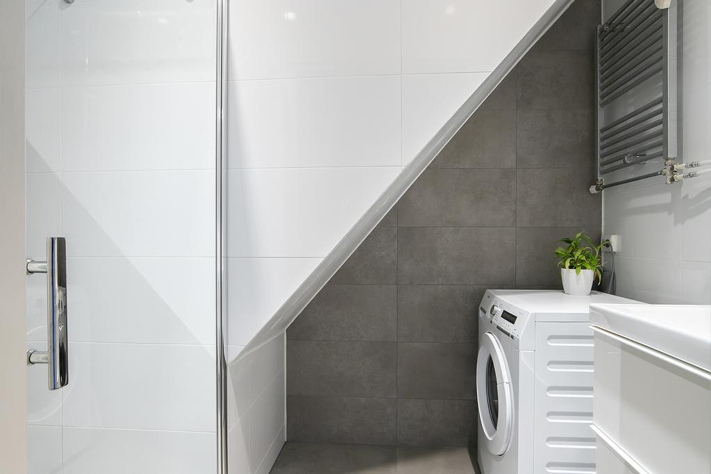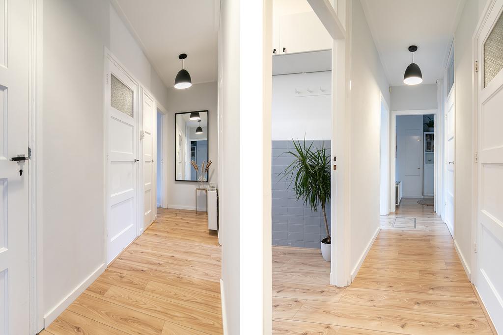 Het appartement heeft een bijzonder ruim voorportaal, er is bijvoorbeeld ruimte om de fietsen te stallen of om een uitgebreide garderobe te maken. Vanuit de entreehal is er toegang tot de woonkamer, de keuken, slaapkamer 1, slaapkamer 2 en het separate toilet met fonteintje.