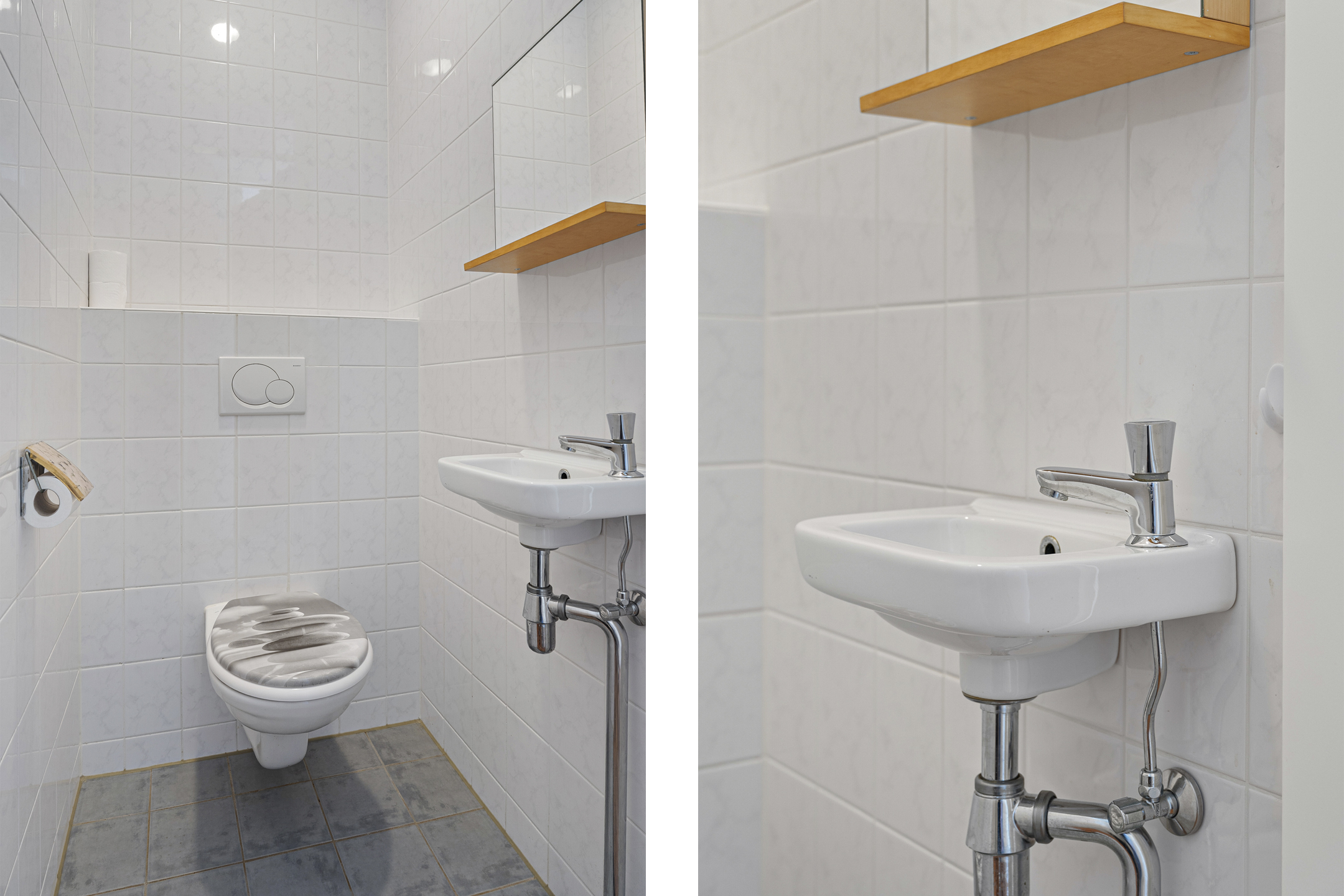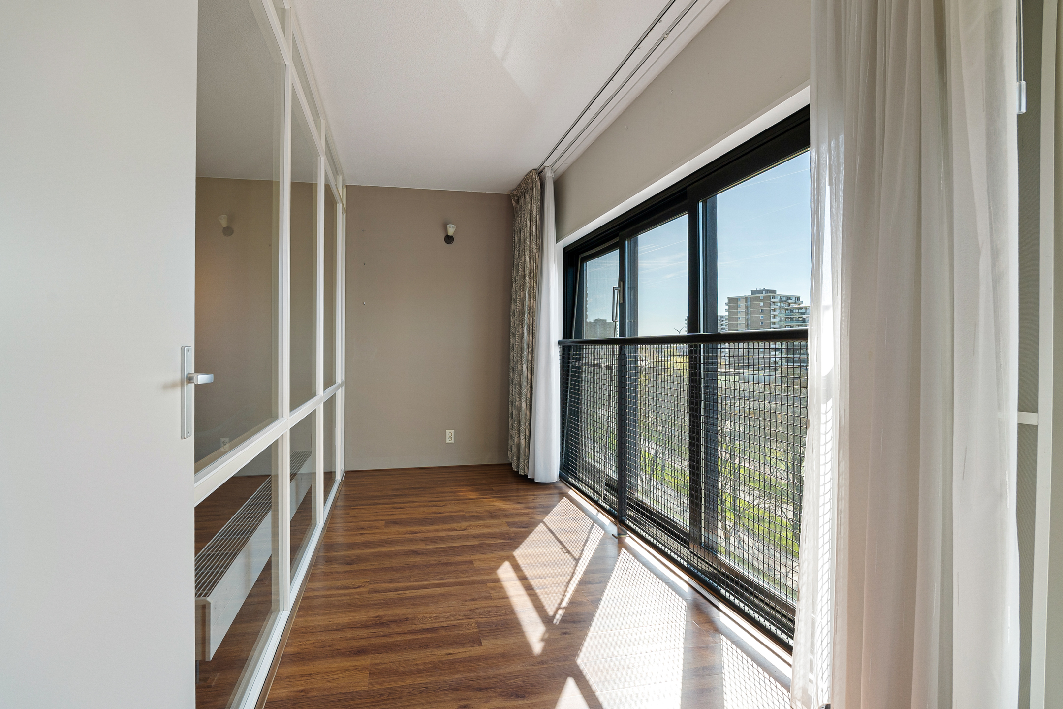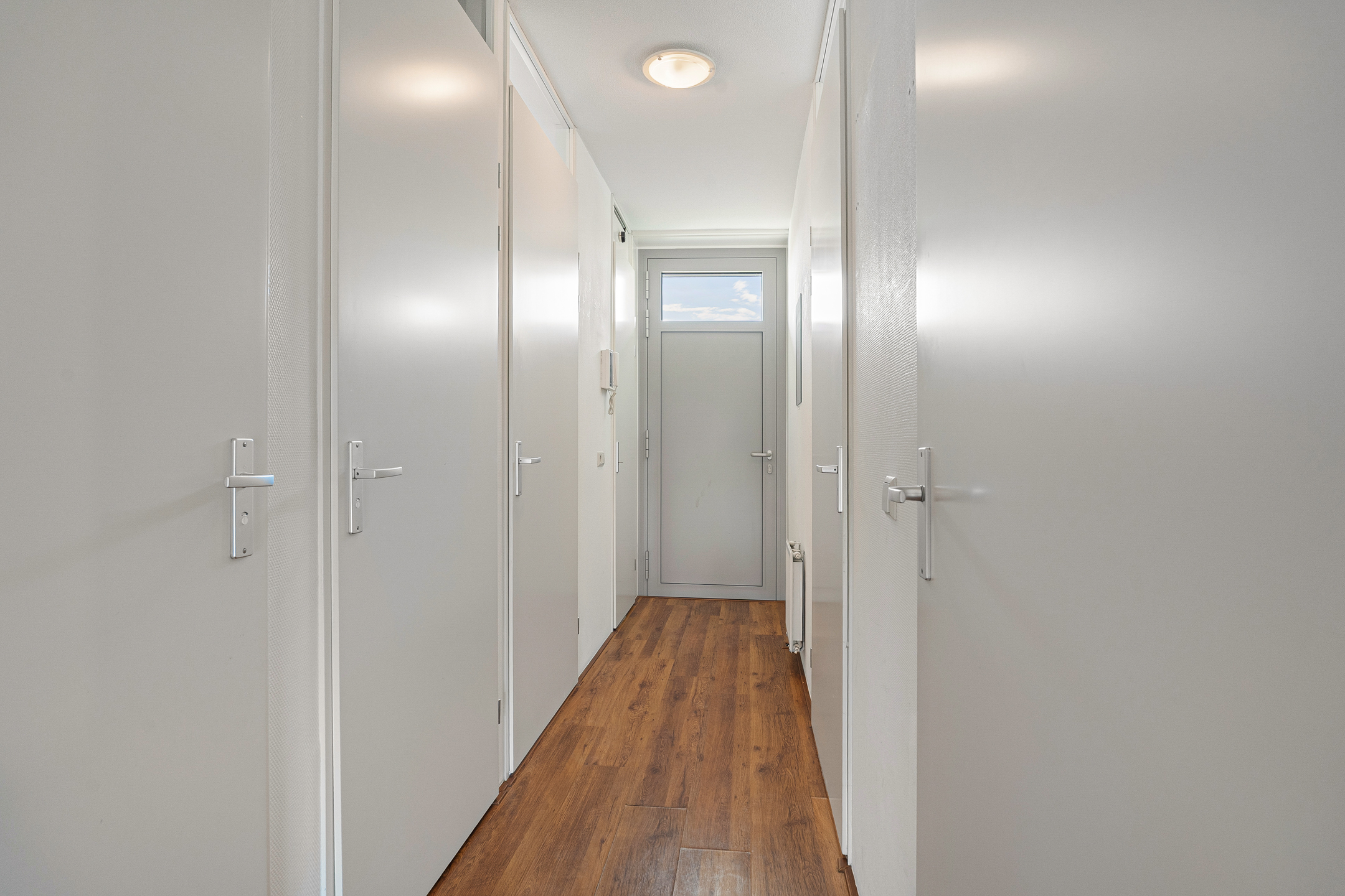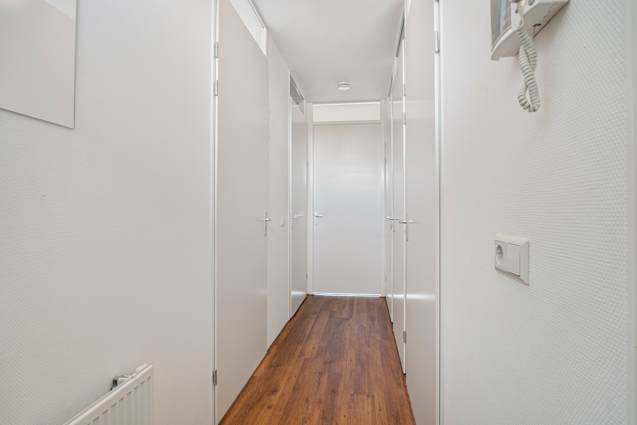 Aangrenzend aan de hal bevinden zich de twee slaapkamers, de badkamer en het separate toilet. De slaapkamers zijn praktisch ingedeeld en bieden diverse gebruiksmogelijkheden; je beschikt over twee kamers, waarvan één zich uitstekend leent als werk- of studeerkamer.