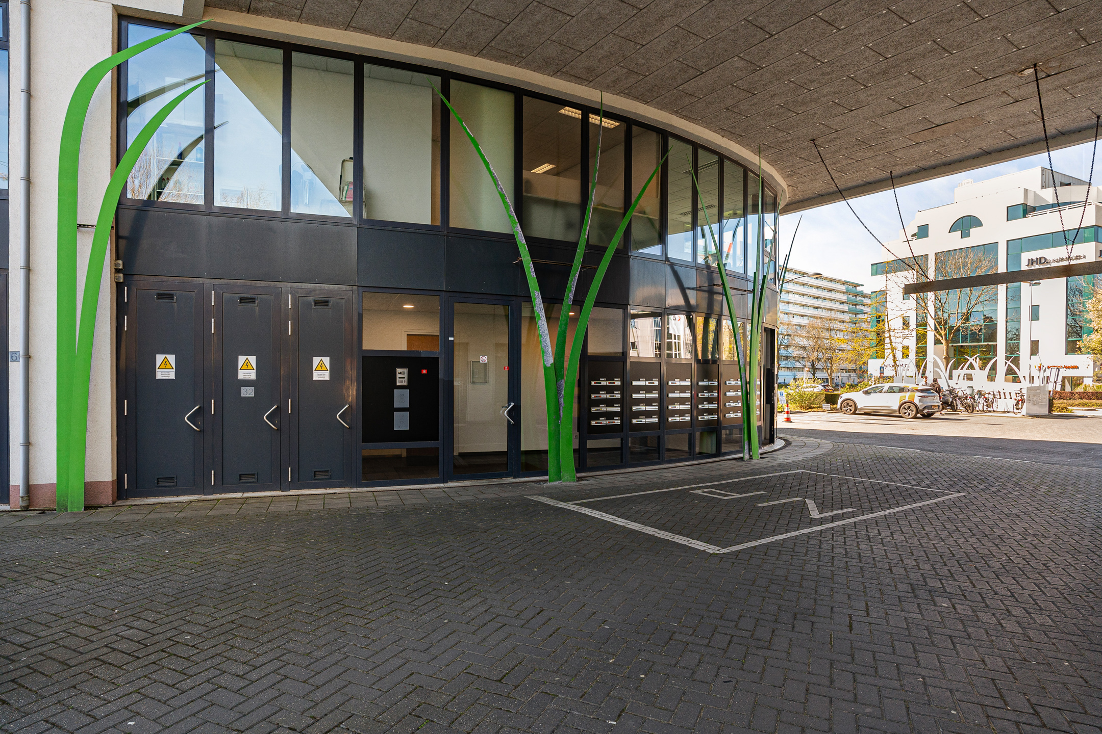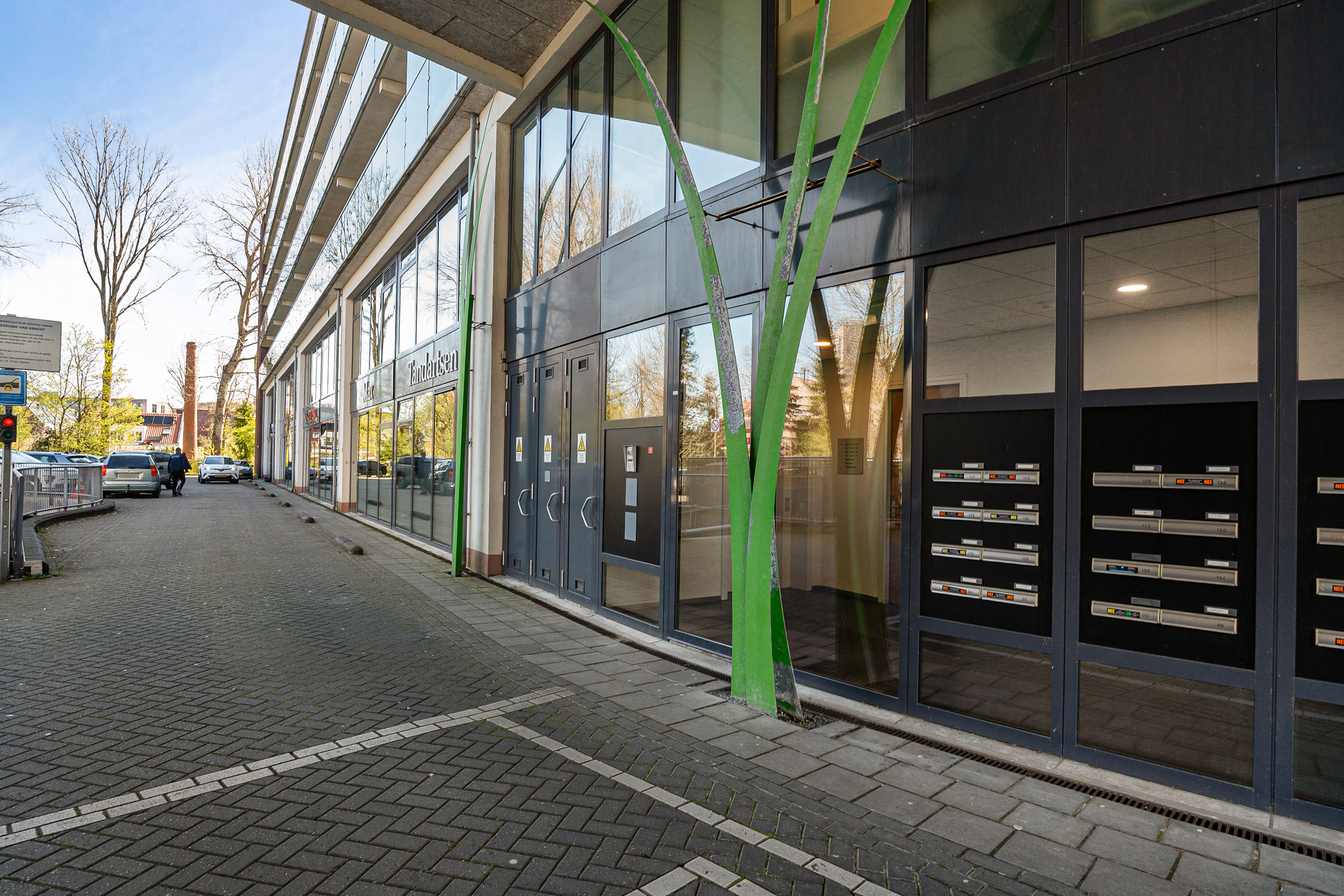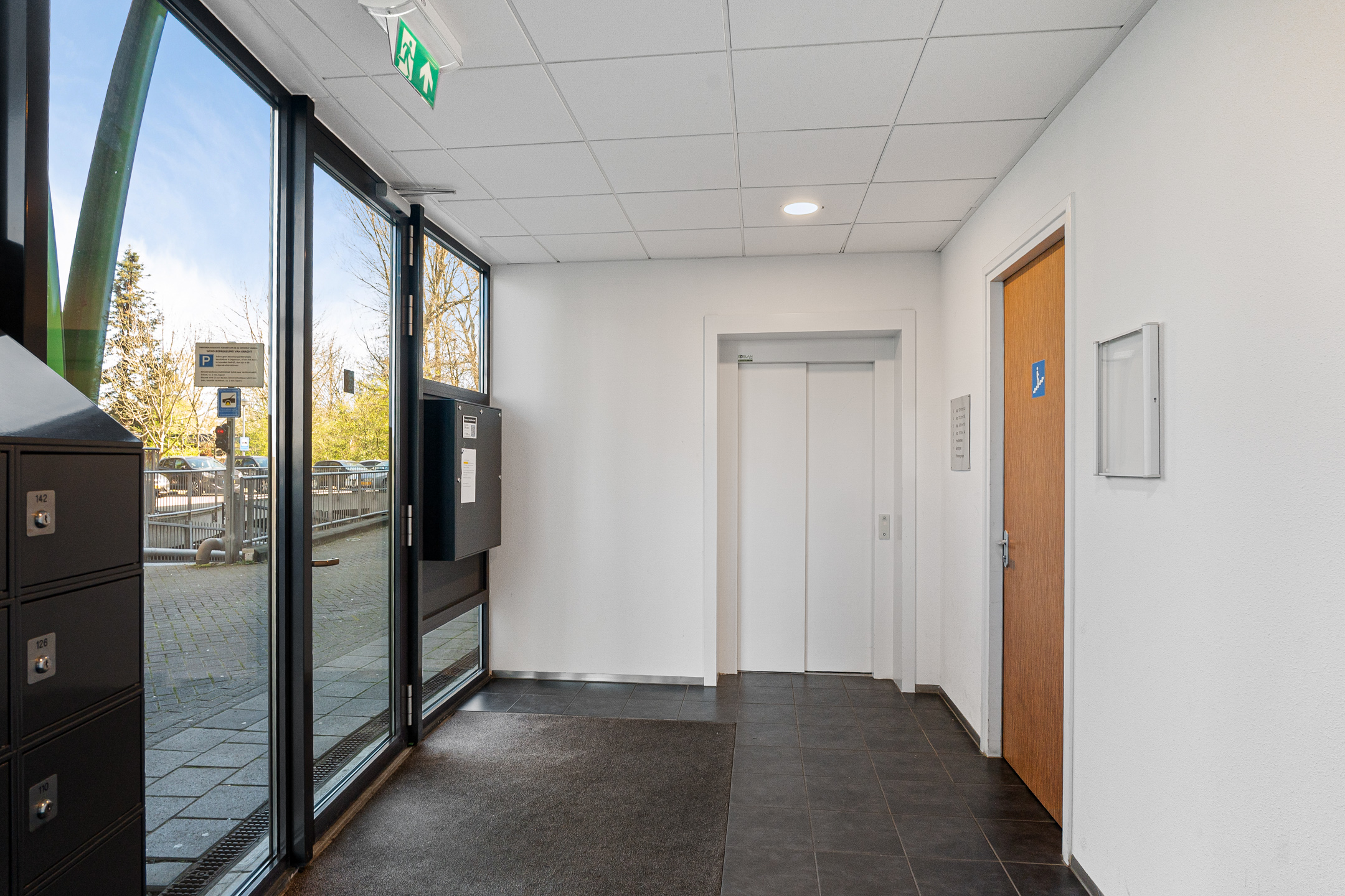 Je komt het complex binnen via een nette centrale entree met brievenbussen en toegang tot de lift en het trappenhuis.