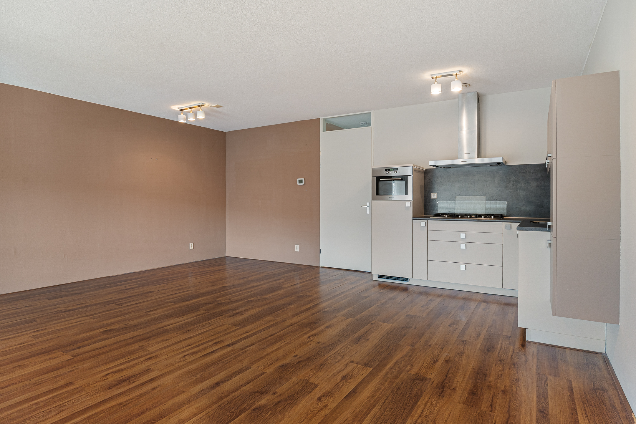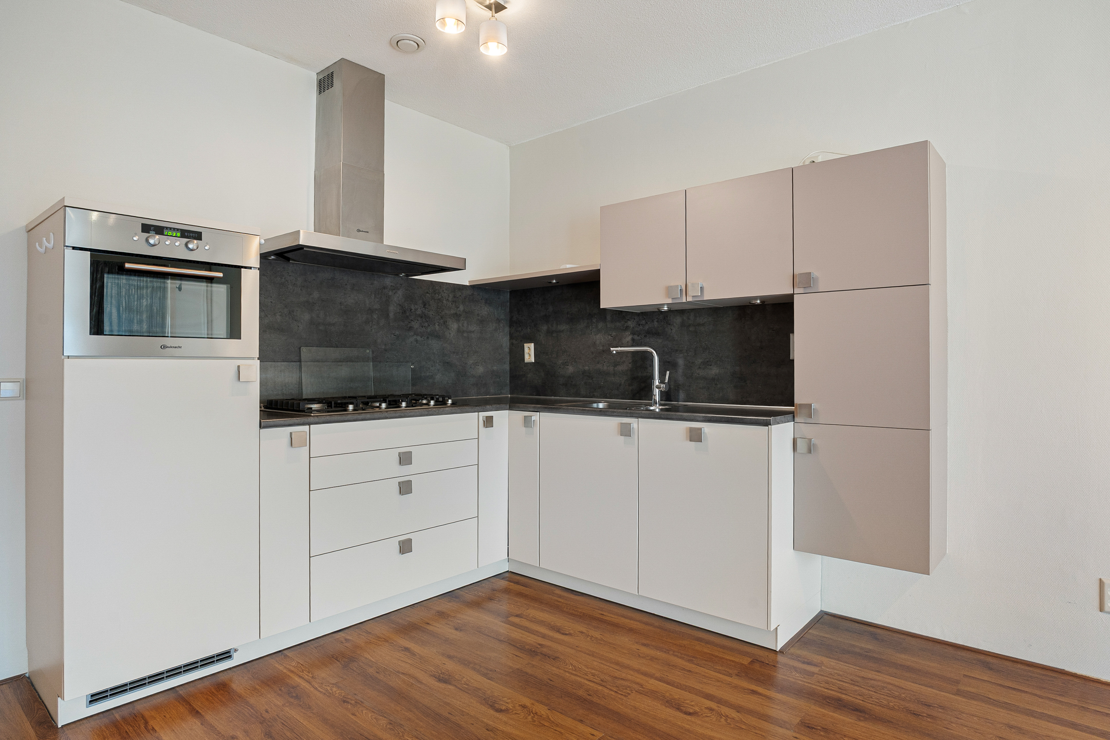 De woonkamer is opvallend licht dankzij de grote raampartijen en staat in open verbinding met de keuken. De keuken is uitgevoerd in een L-opstelling en geplaatst in 2018. Je beschikt hier over diverse inbouwapparatuur, waaronder een Bauknecht oven en een AEG vaatwasser (2020). Koken doe je op gas.