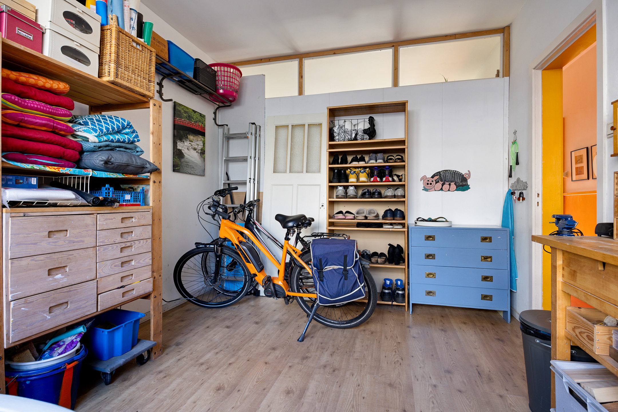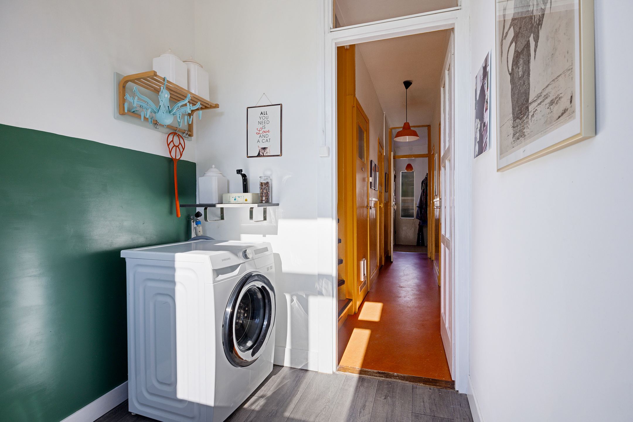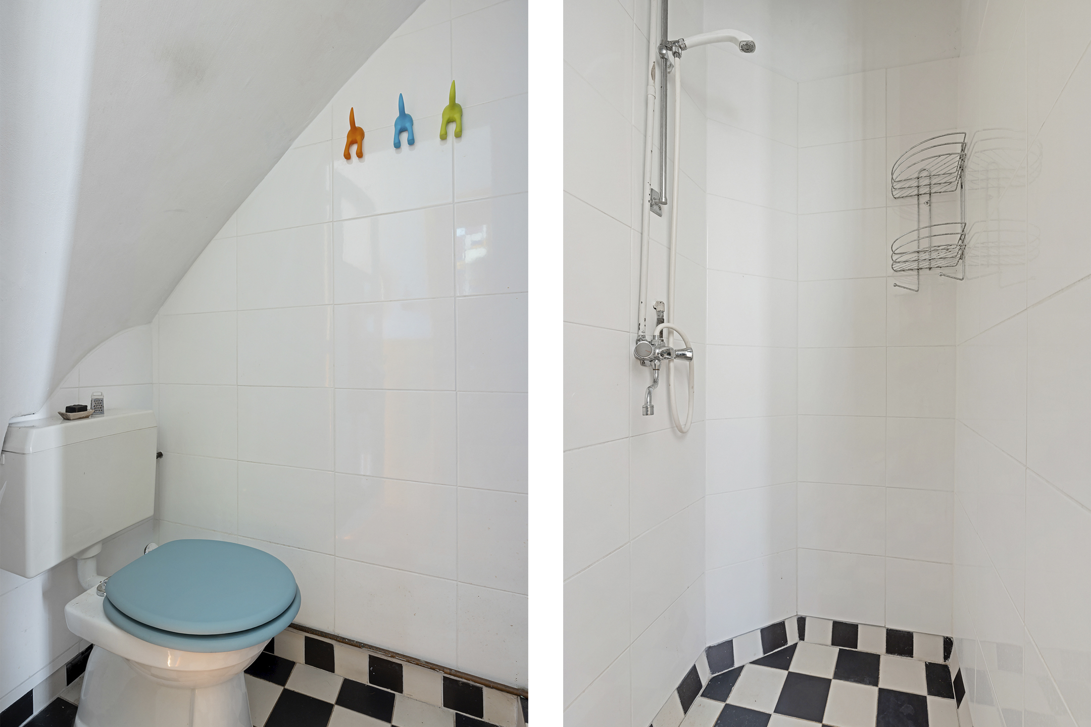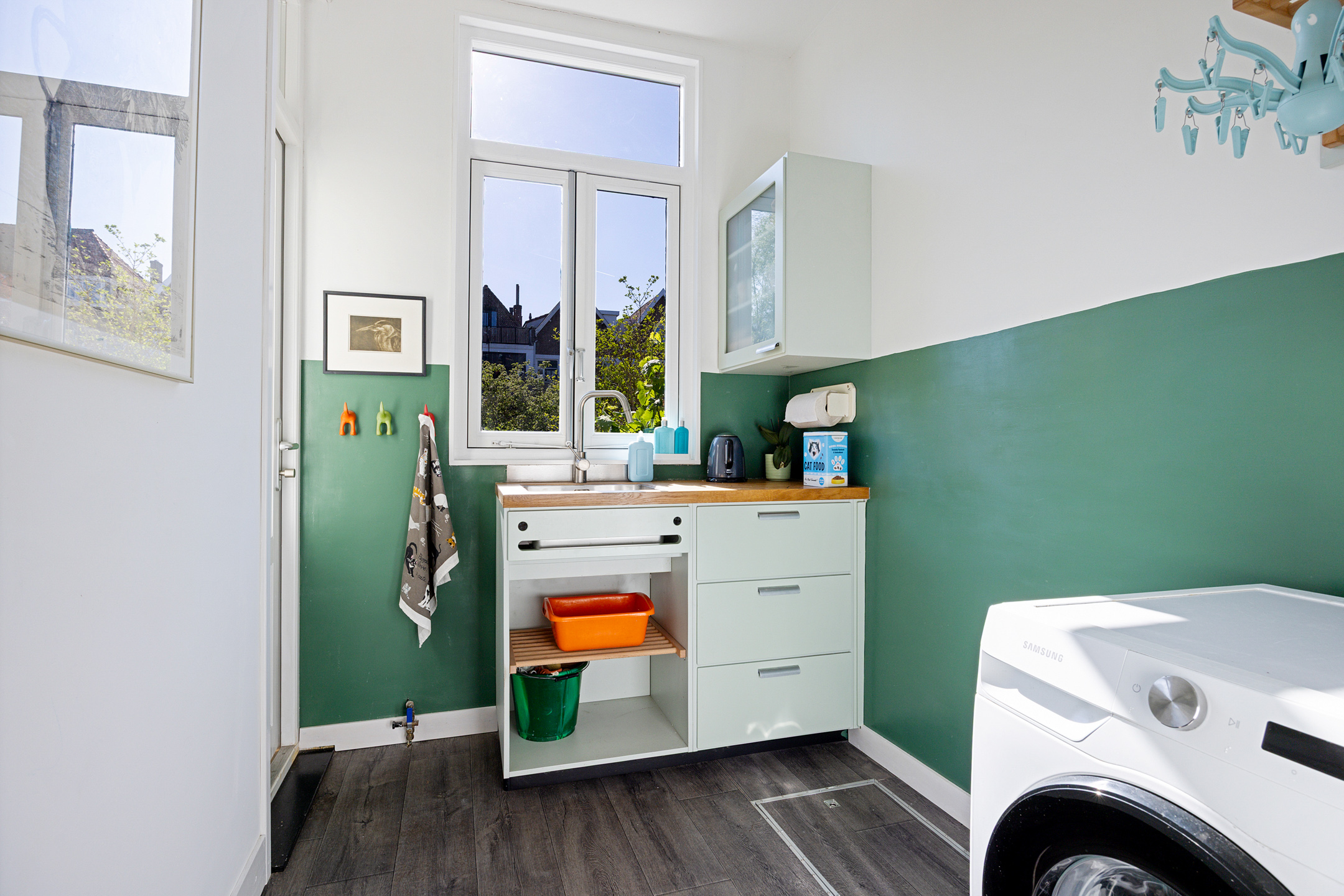 Aansluitend bevindt zich de praktische bijkeuken met “Piet Zwart” design keukenblok, wasmachine-aansluiting en aparte toegang tot de tuin. Ook is op deze verdieping een tweede badkamer aanwezig, voorzien van douche en toilet. Ideaal voor gasten of grotere gezinnen.