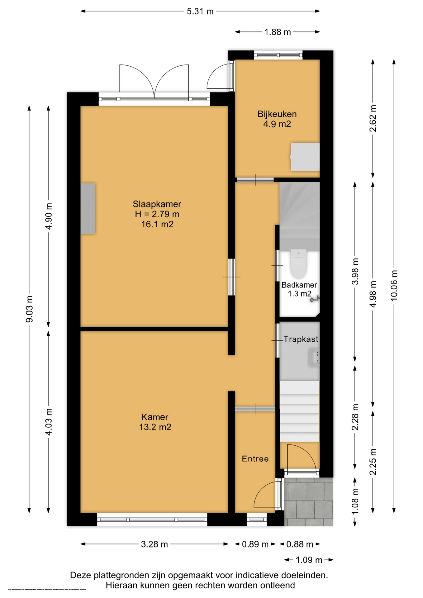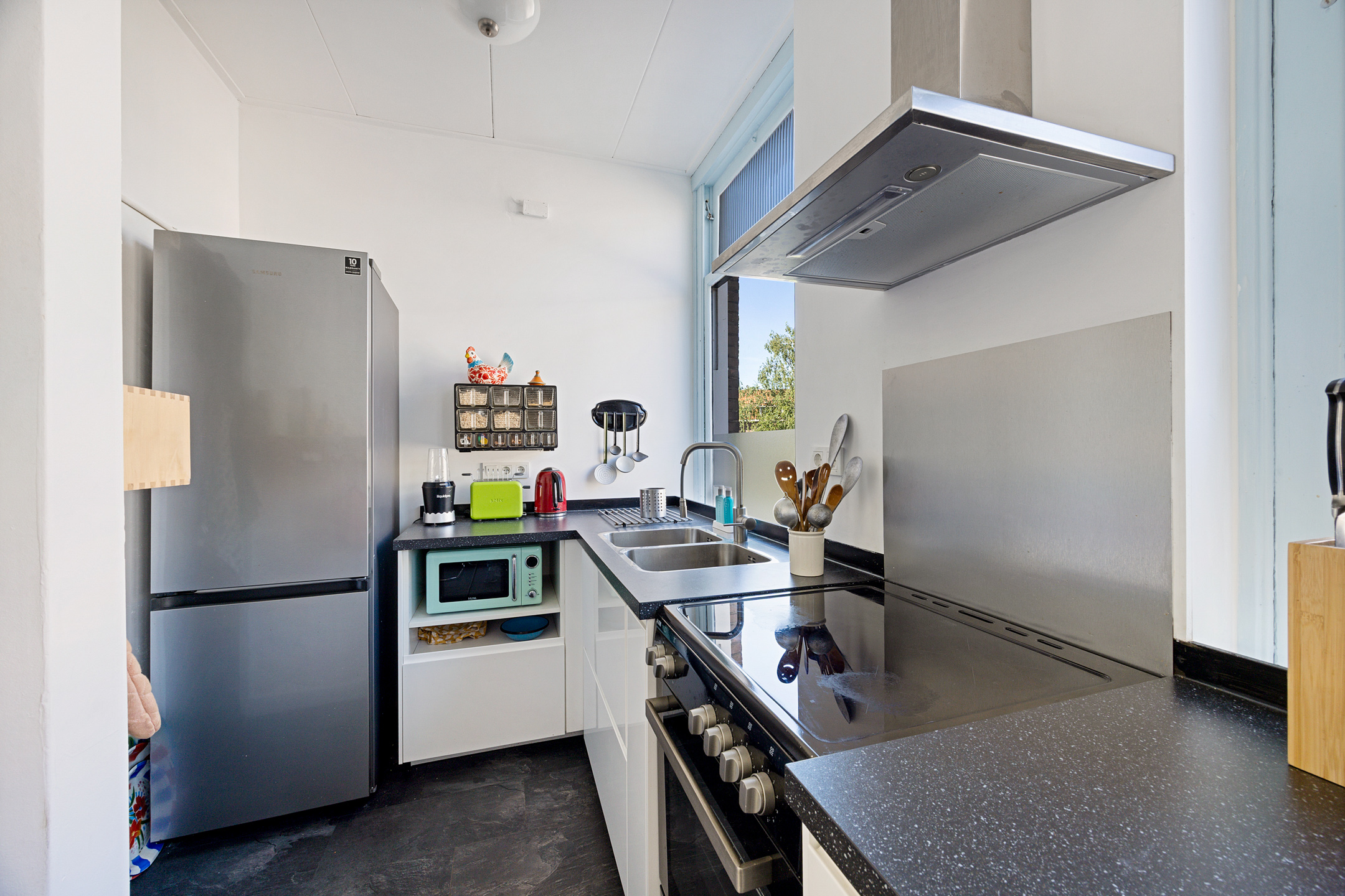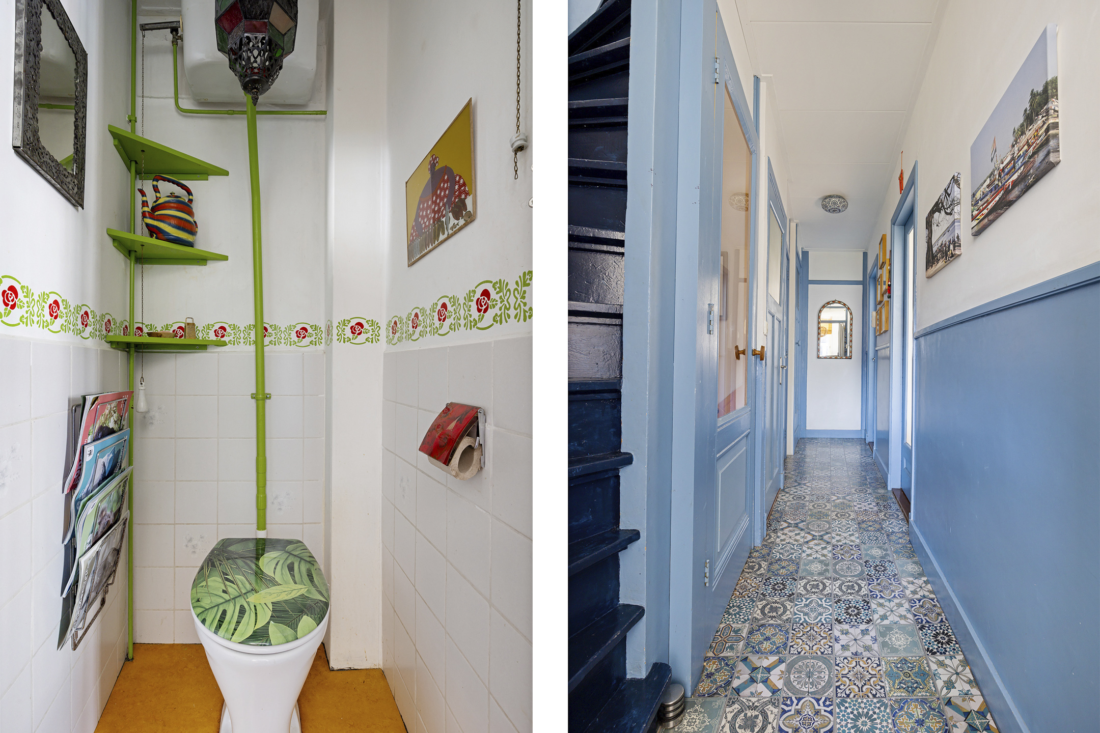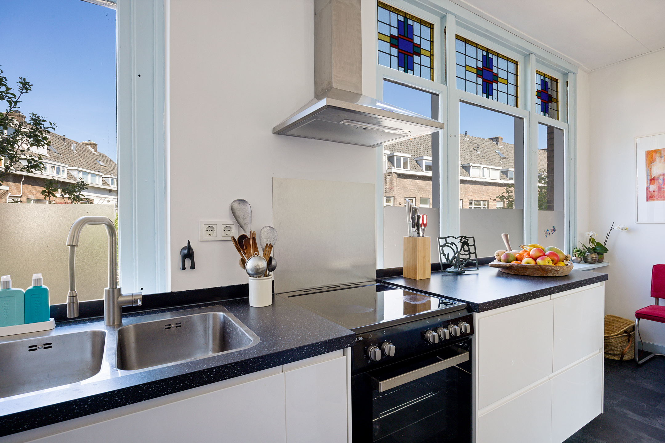 Aansluitend bevindt zich de praktische bijkeuken met “Piet Zwart” design keukenblok, wasmachine-aansluiting en aparte toegang tot de tuin. Ook is op deze verdieping een tweede badkamer aanwezig, voorzien van douche en toilet. Ideaal voor gasten of grotere gezinnen.