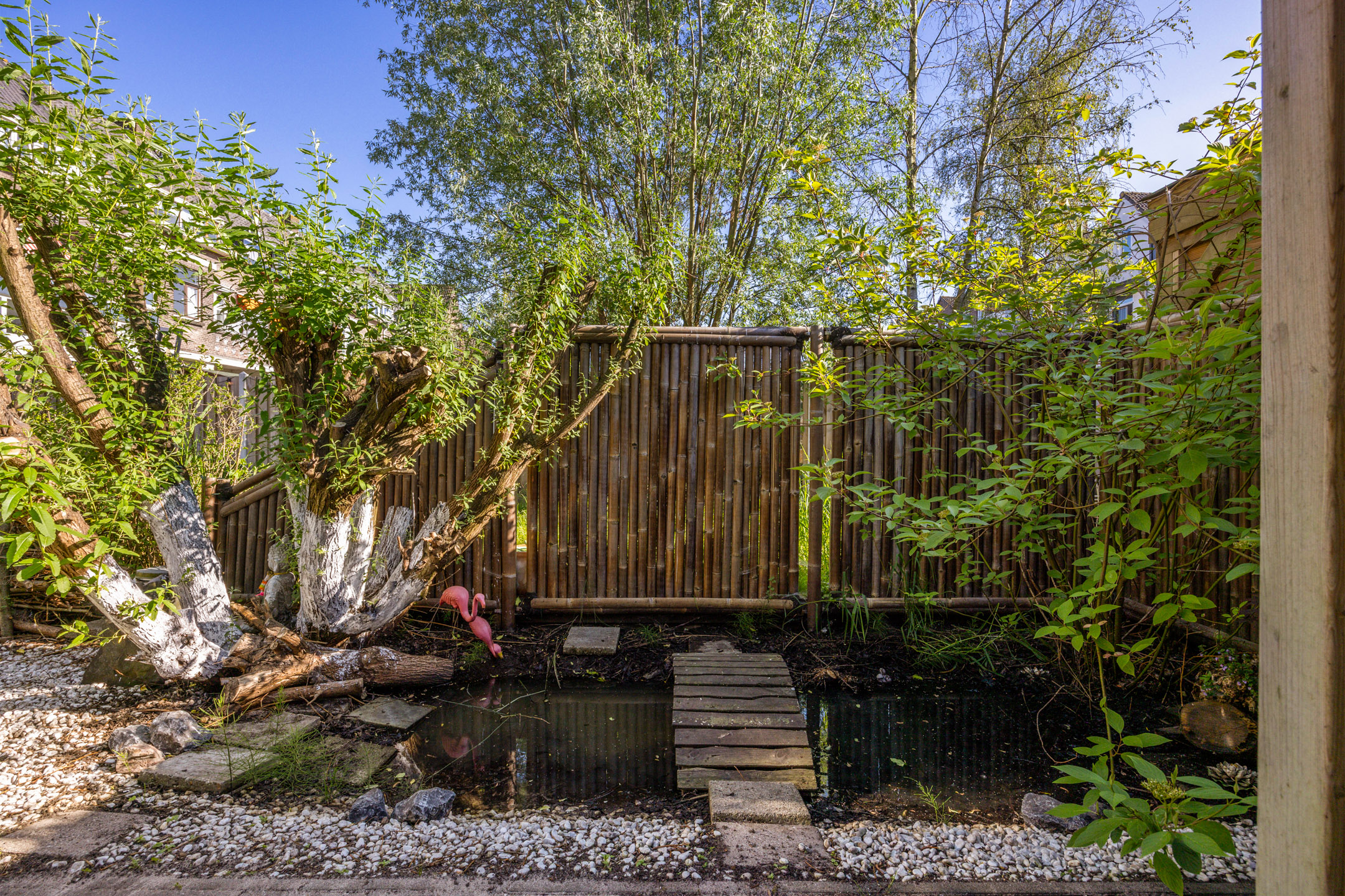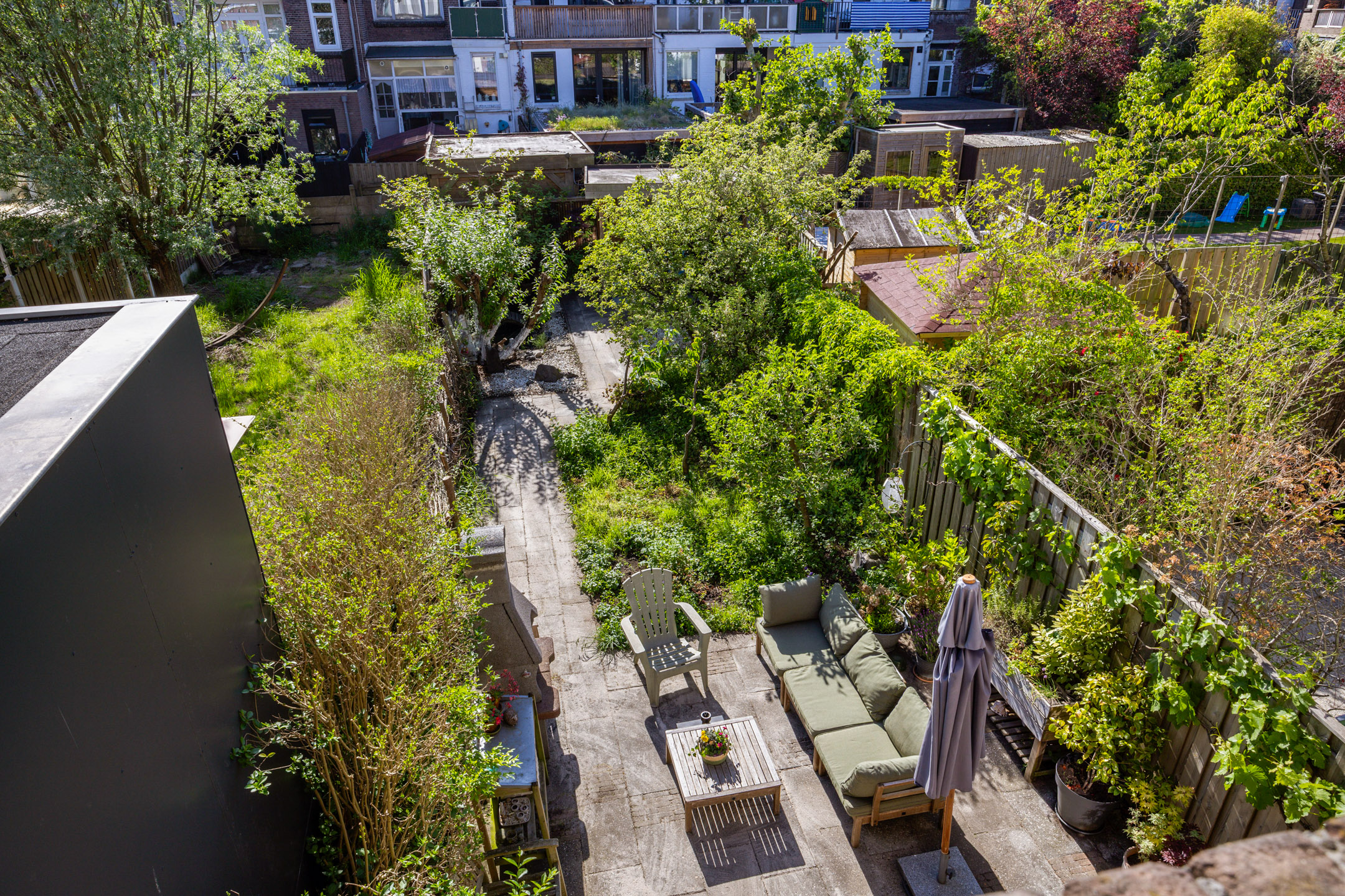 De diepe groene achtertuin met overkapping gelegen op het zuidwesten biedt volop zon en mogelijkheden. Er is meer dan genoeg ruimte voor een loungeplek, eettafel én bijvoorbeeld speelruimte door de diepte van bijna 17 meter. Echt uniek in de stad!