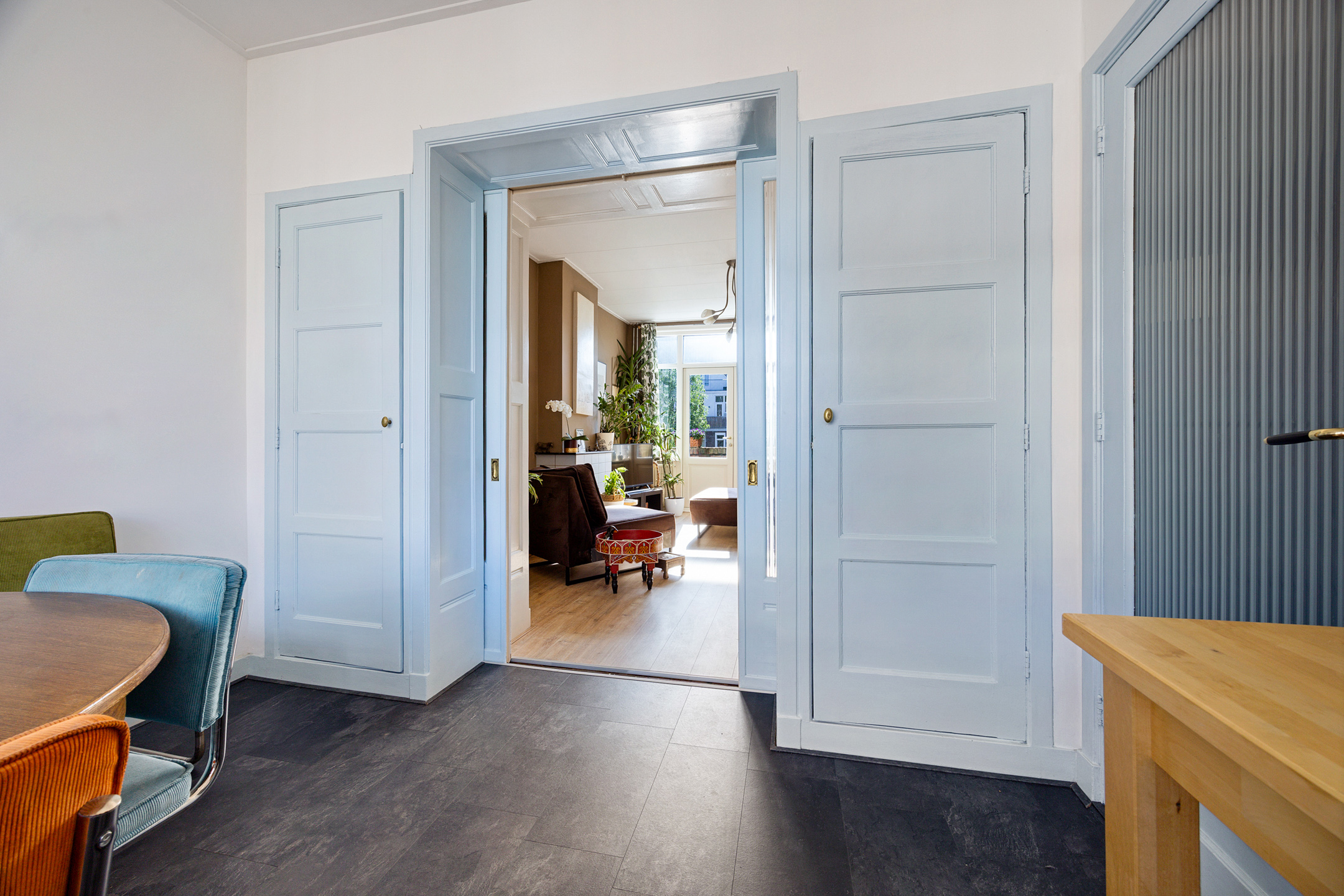 De keuken en woonkamer aan (de achterzijde) worden gescheiden door de originele en suite deuren en dubbele kasten. De woonkamer beschikt over openslaande deuren naar het balkon, waar kan worden genoten van de avondzon.