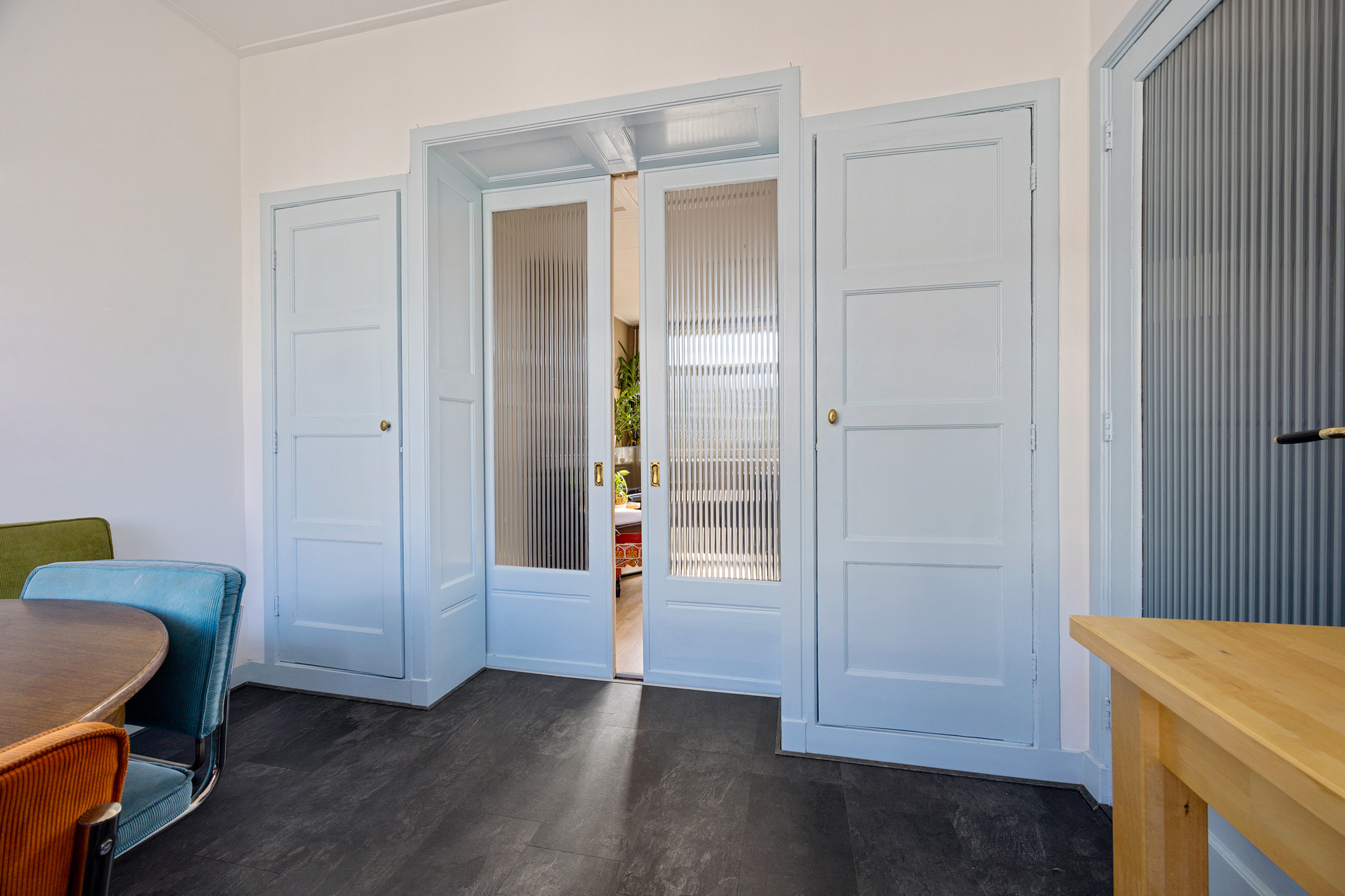 Eigen entree met ruim tochtportaal. Aan de voorzijde bevindt zich een kamer die momenteel dienstdoet als hobbyruimte, maar zich ook uitstekend leent als slaapkamer of thuiswerkplek. Aan de achterzijde ligt een tweede woonkamer, ideaal als rustige werk- of slaapkamer met openslaande deuren naar de tuin.