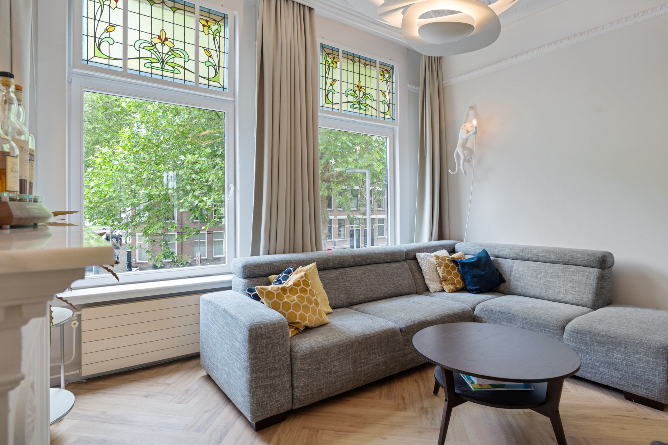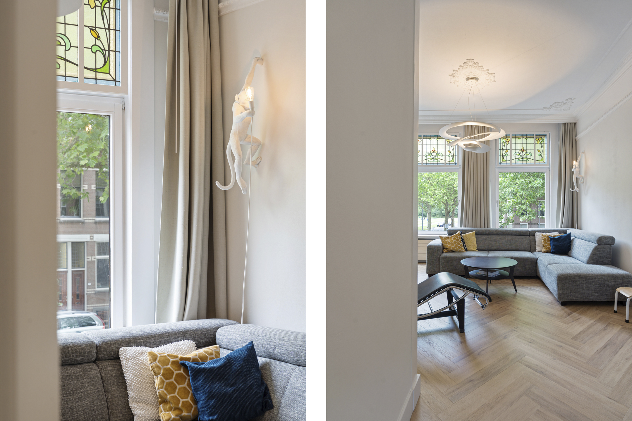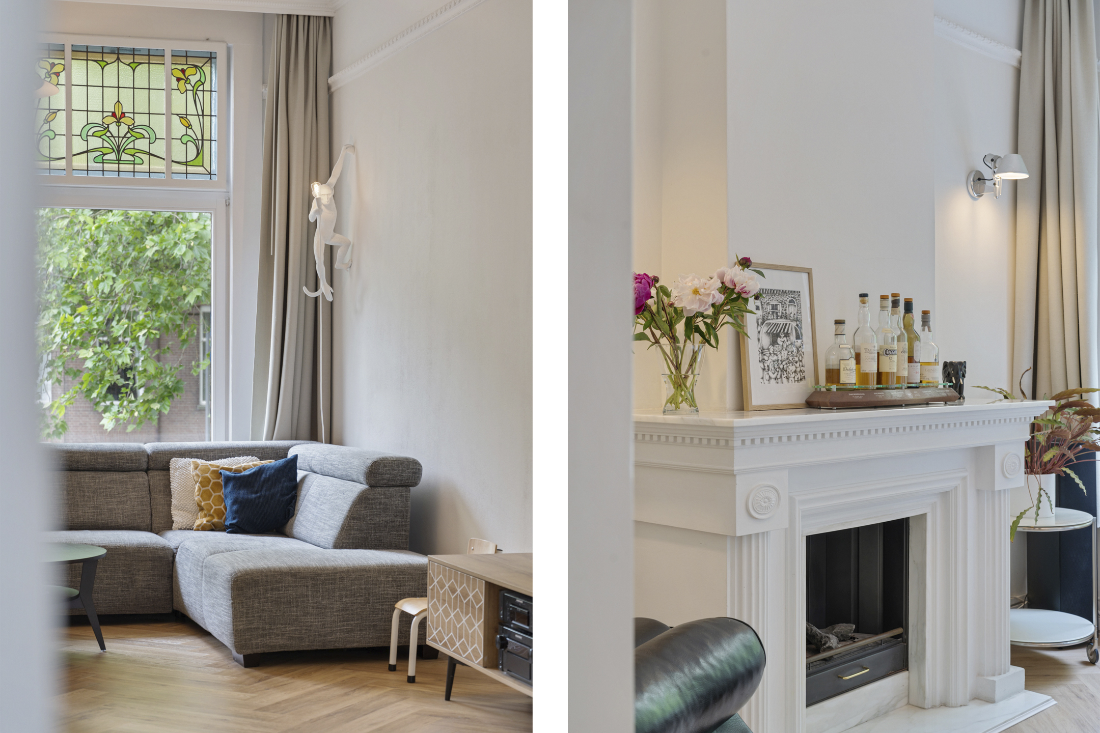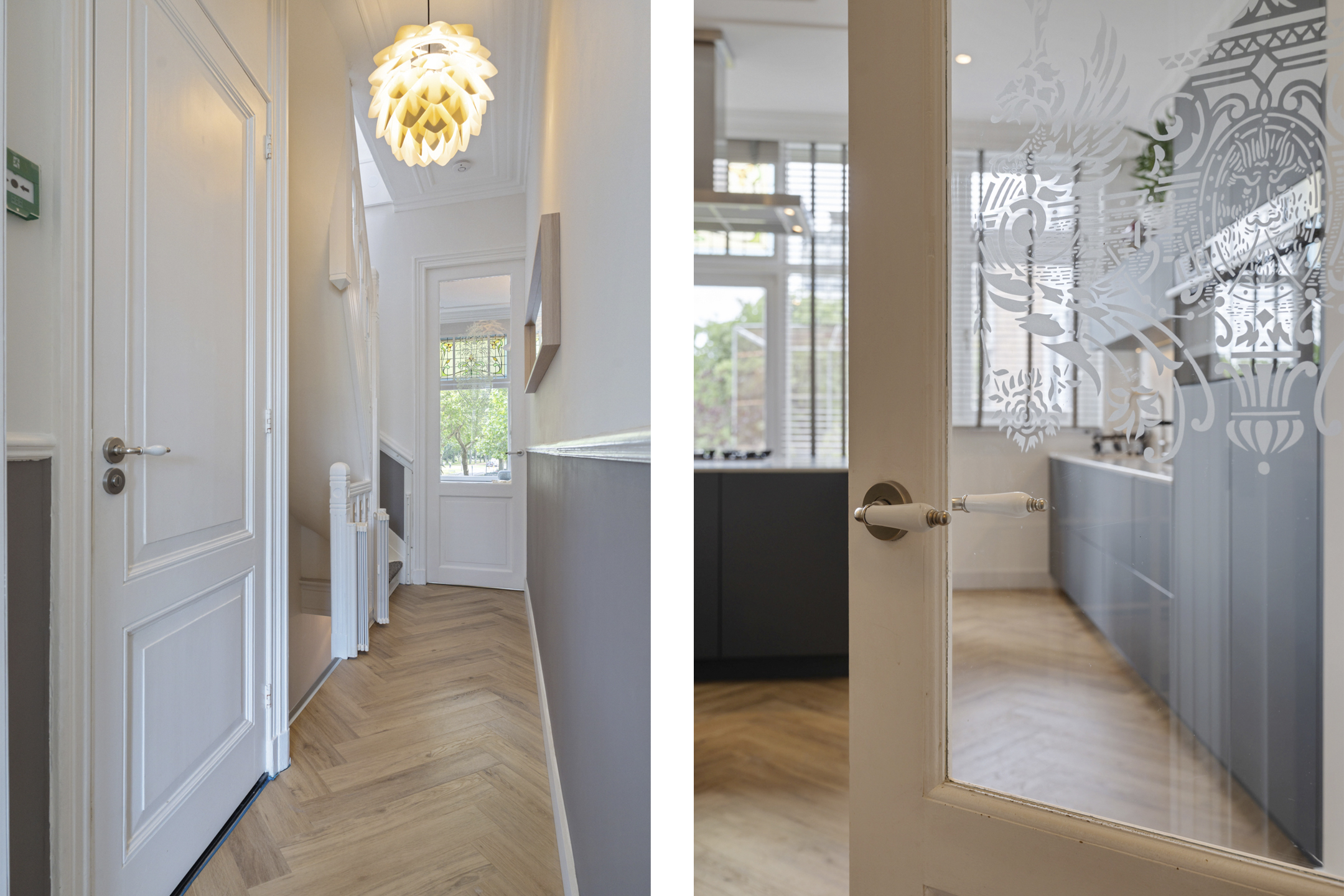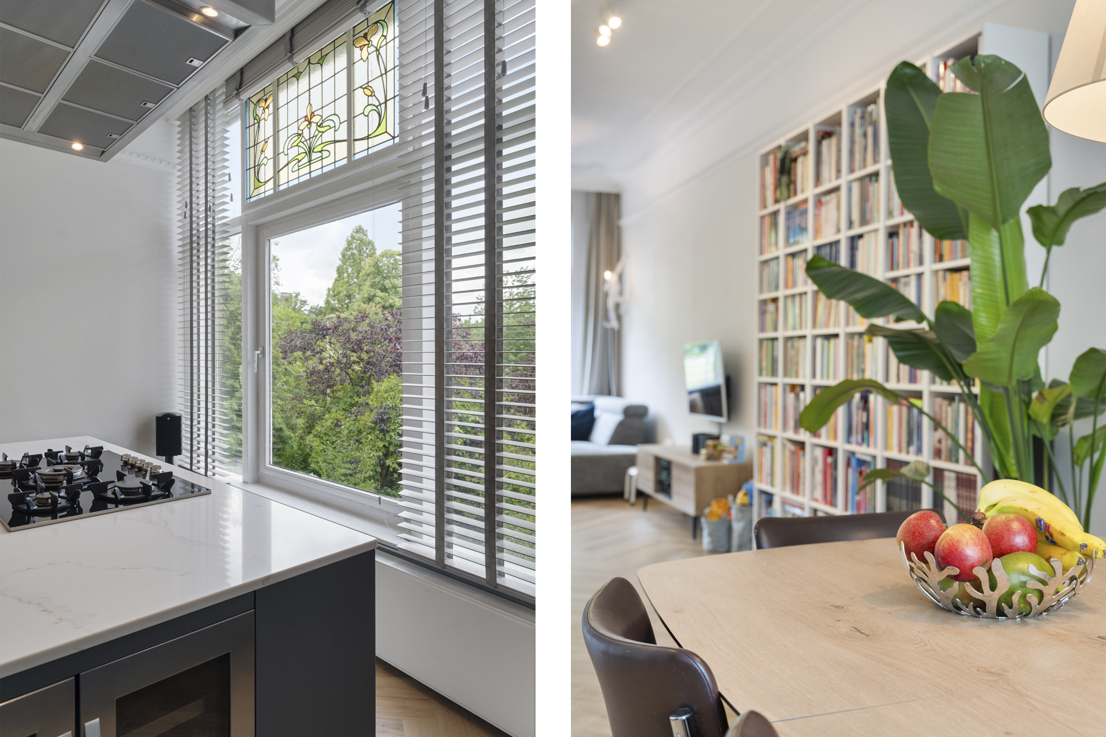 Grote raampartijen zorgen voor veel licht, terwijl het glas-in-lood bovenraam extra karakter toevoegt.