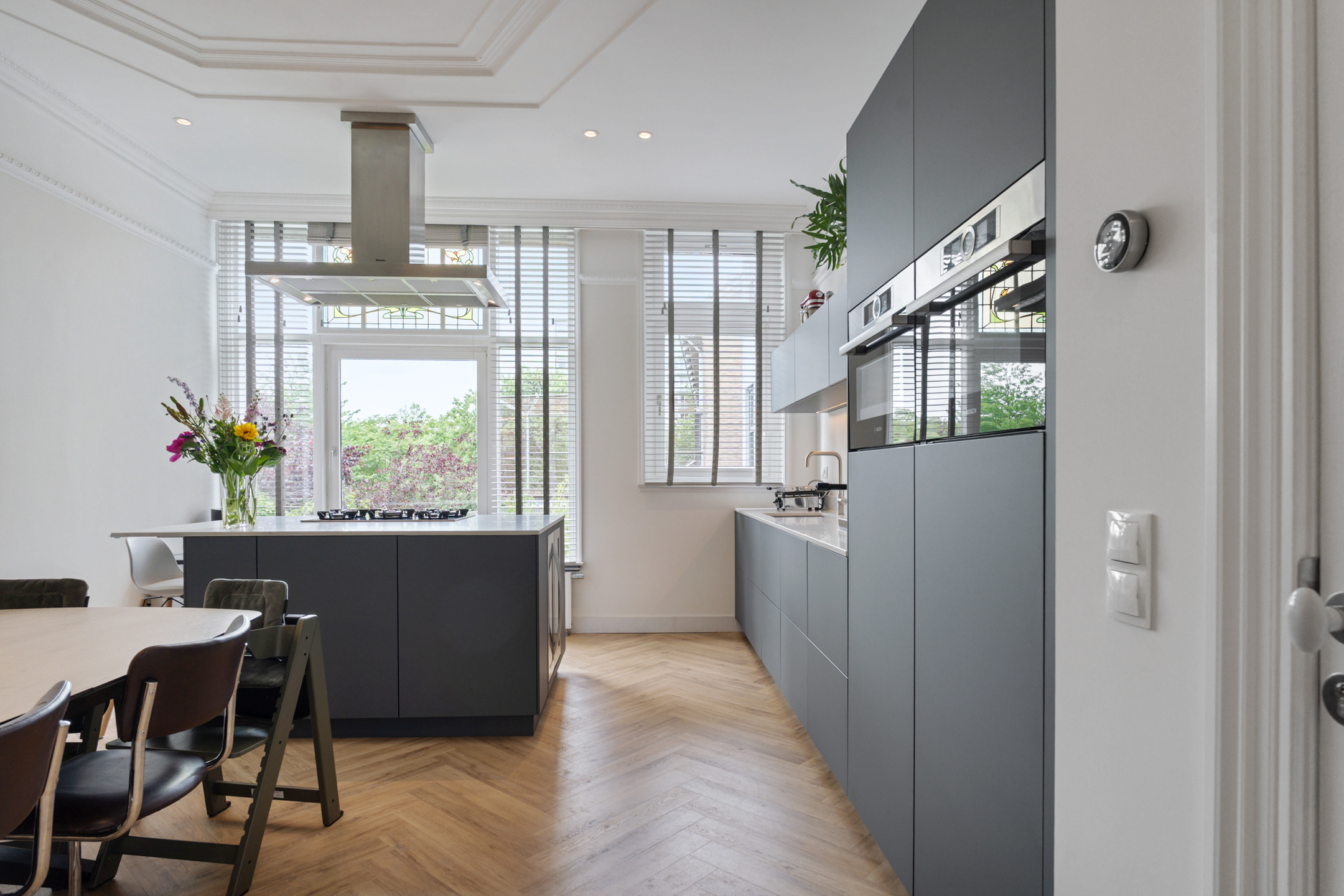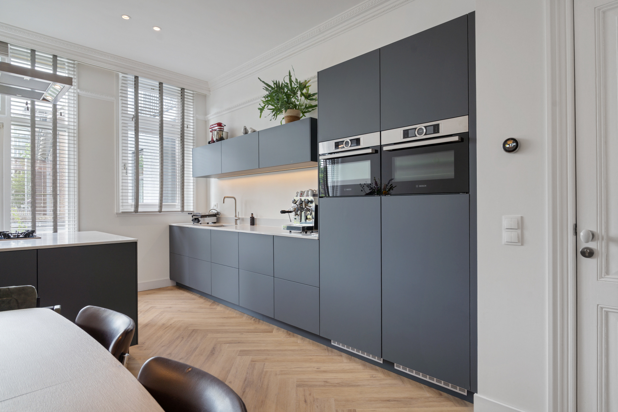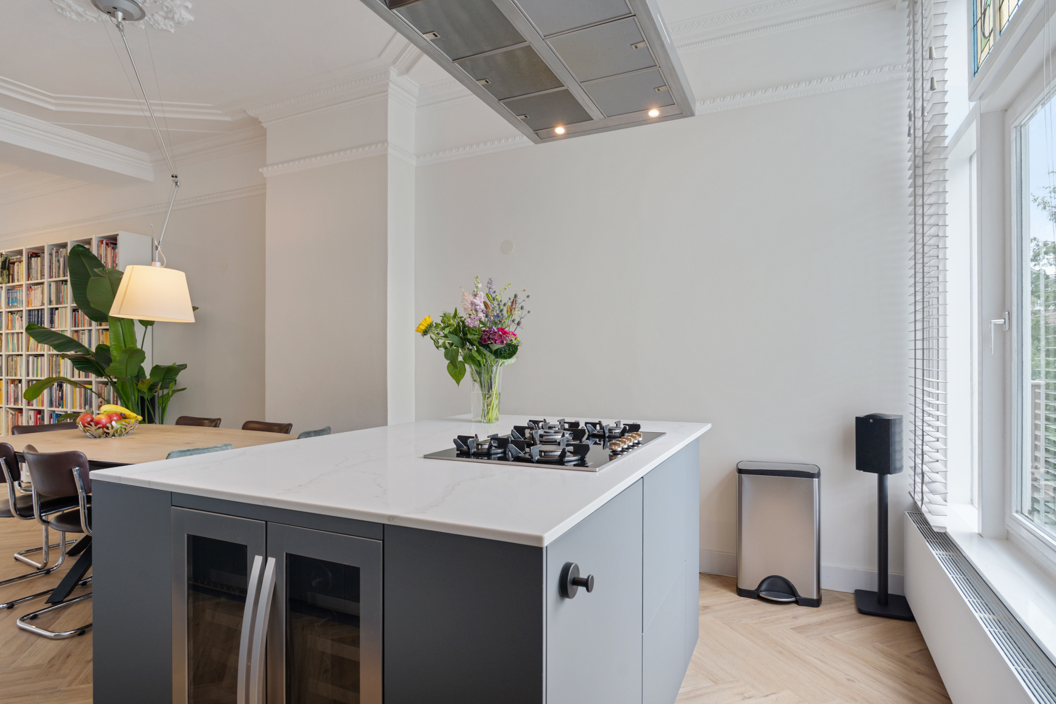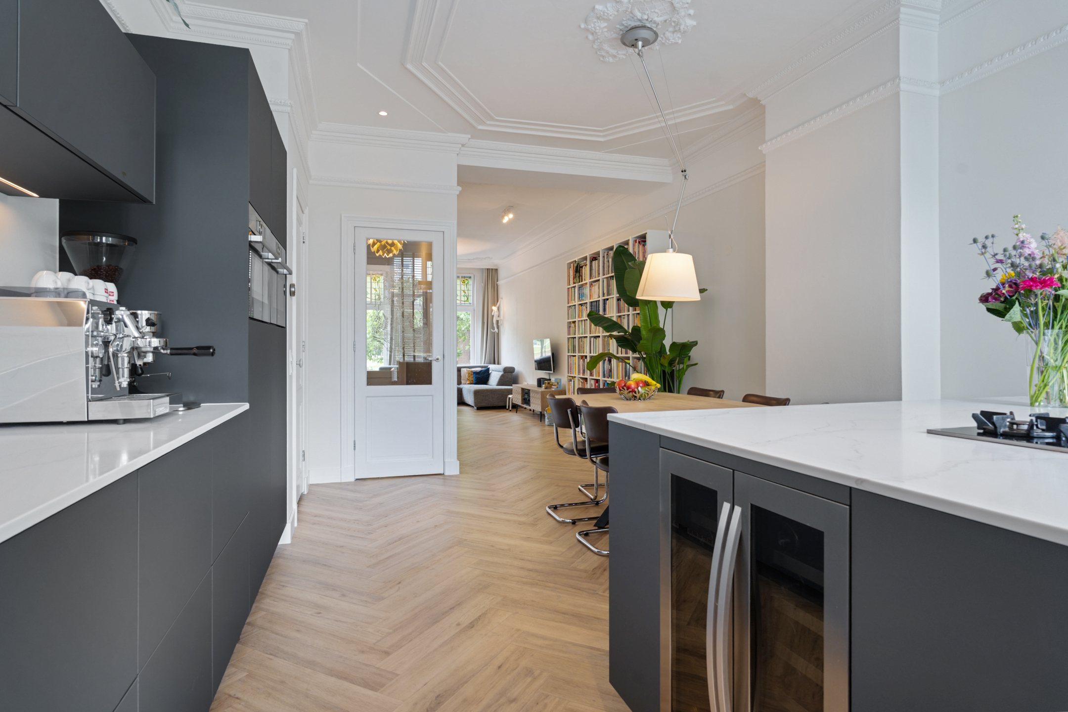 Aan de achterzijde vind je de open keuken, die in alles luxe en functionaliteit uitstraalt. Het royale kookeiland is de spil van de ruimte, perfect voor koken én samenzijn. De keuken is compleet uitgerust met onder andere een gasfornuis, dubbele wijnklimaatkast, combi-stoomoven, combimagnetron, vaatwasser, koelkast en vriezer.