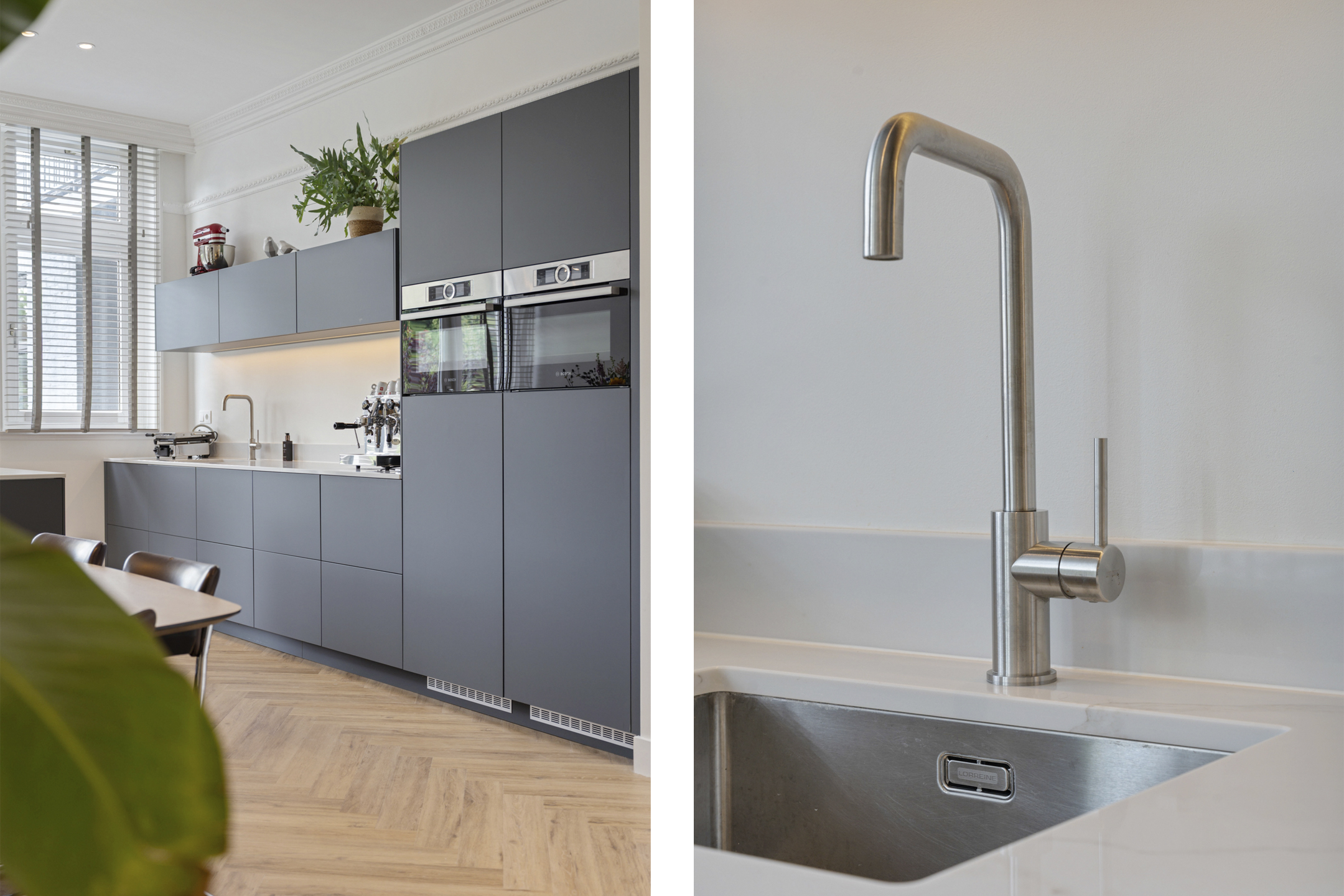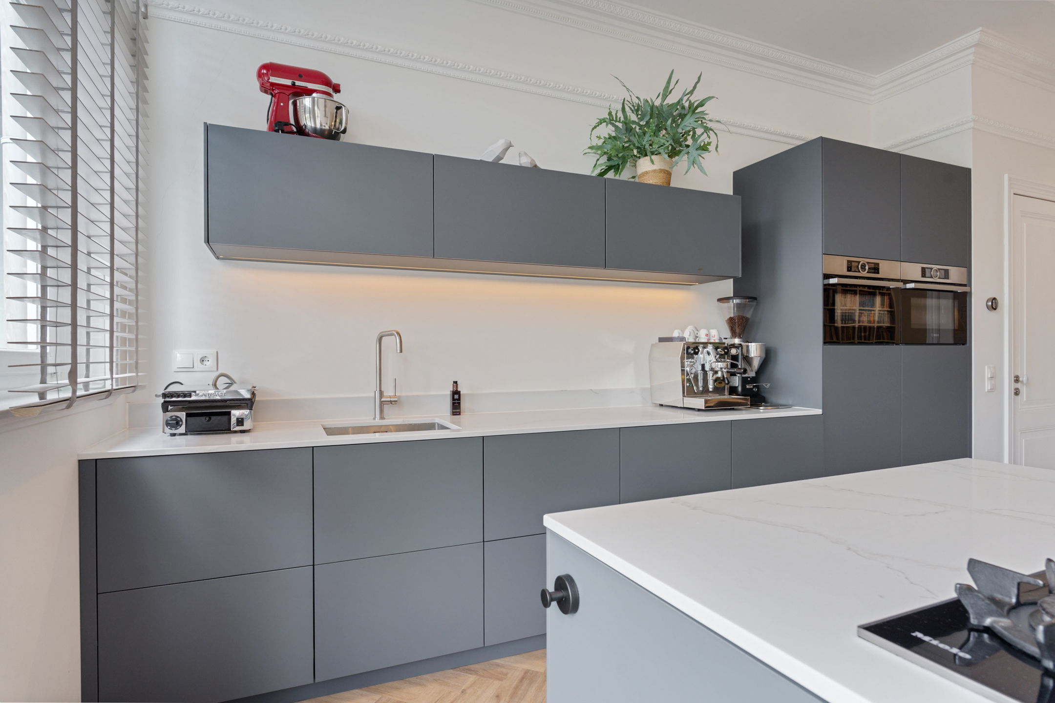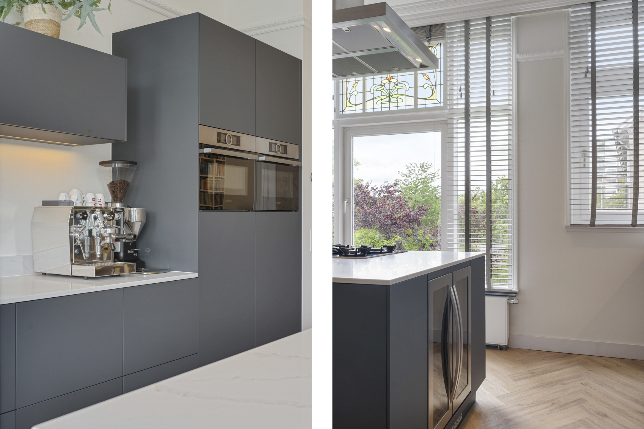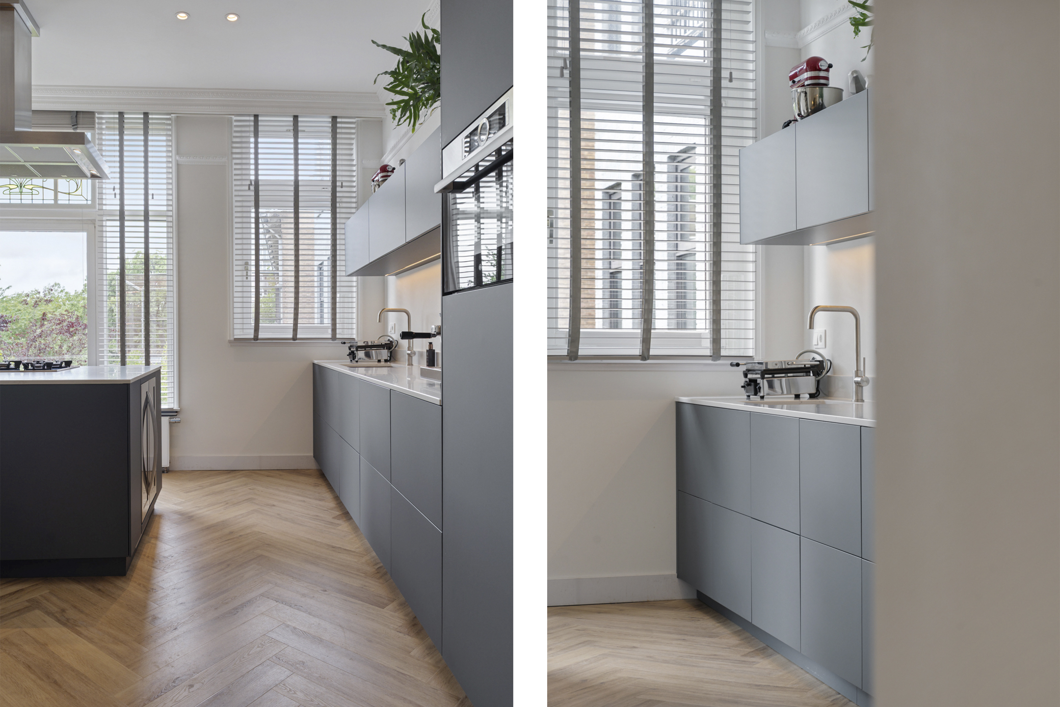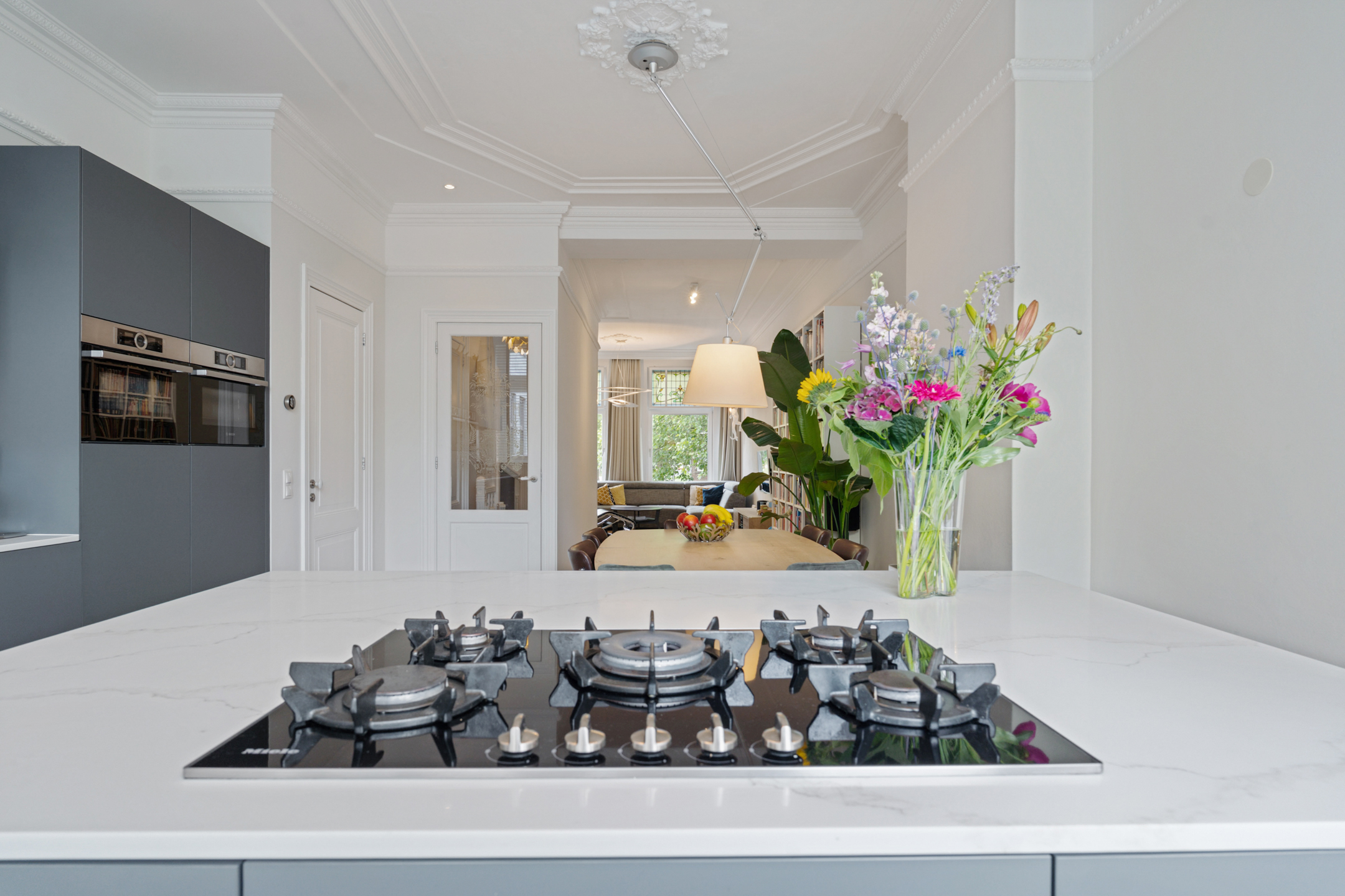 Aan de achterzijde vind je de open keuken, die in alles luxe en functionaliteit uitstraalt. Het royale kookeiland is de spil van de ruimte, perfect voor koken én samenzijn. De keuken is compleet uitgerust met onder andere een gasfornuis, dubbele wijnklimaatkast, combi-stoomoven, combimagnetron, vaatwasser, koelkast en vriezer.