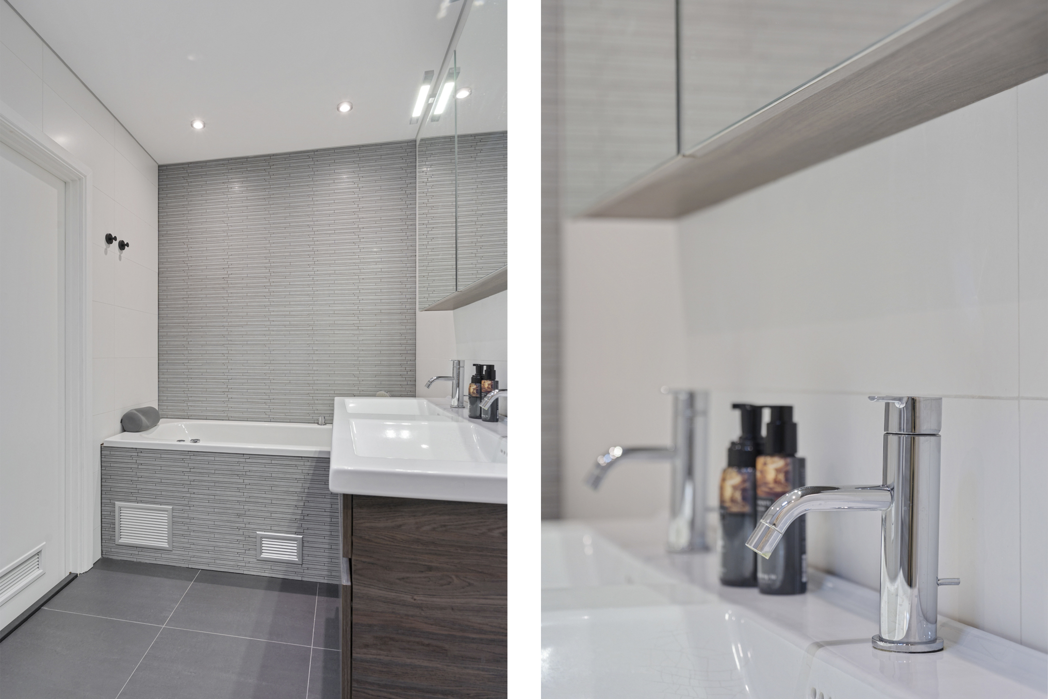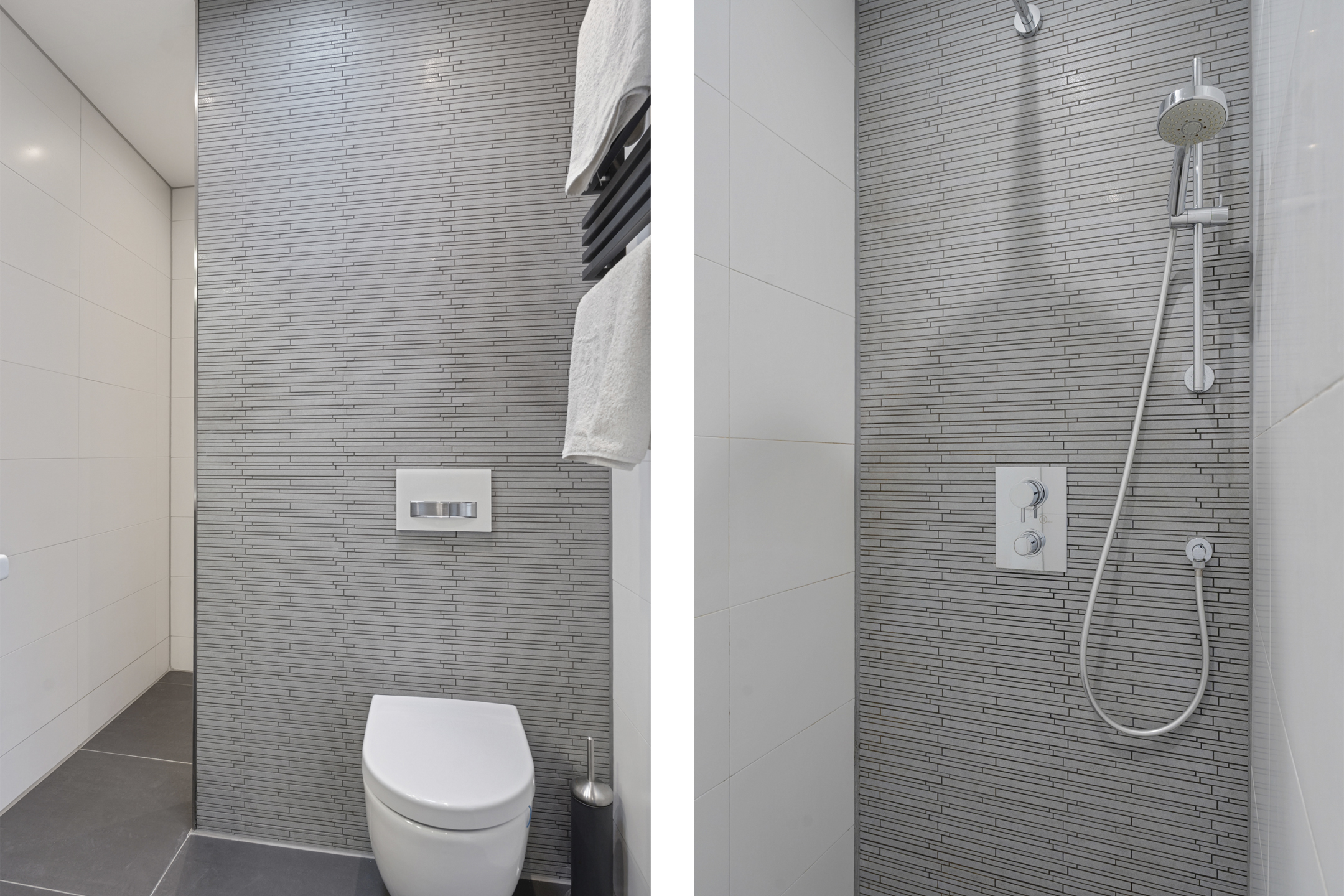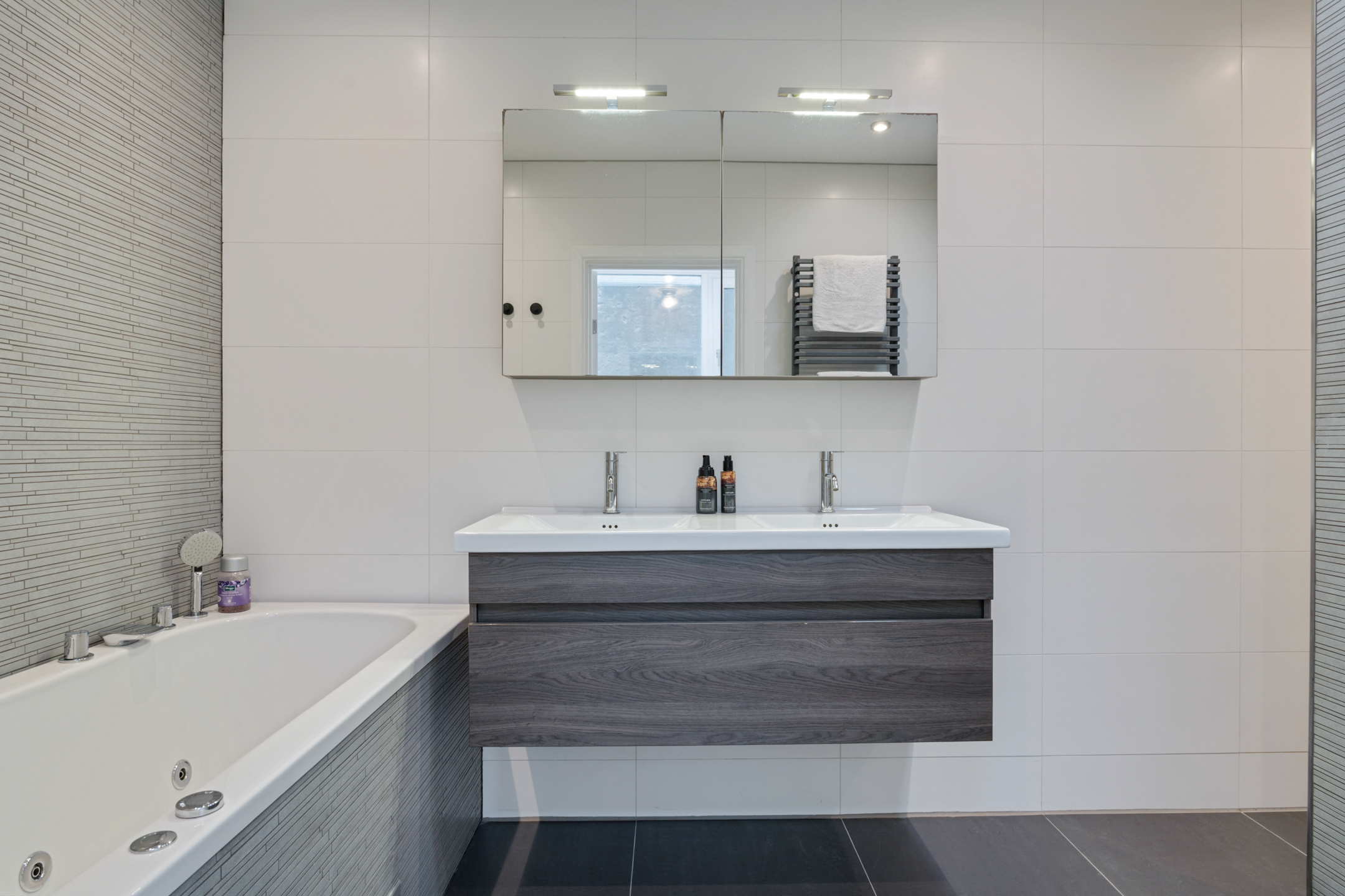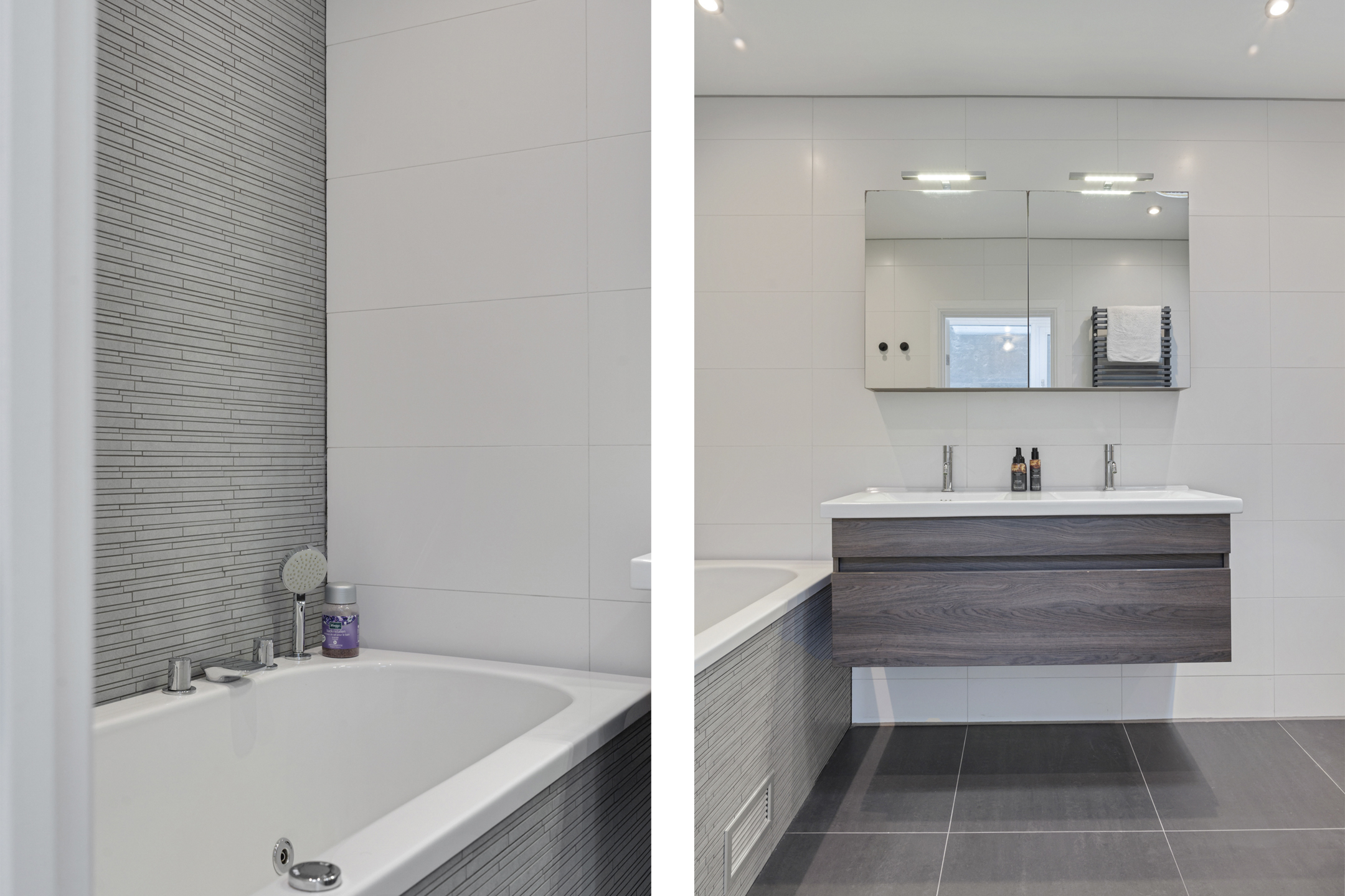 Centraal op de verdieping vind je de moderne badkamer. Volledig betegeld en voorzien van een inloopdouche, ligbad met bubbelfunctie, wandcloset, dubbele wastafel, designradiator en inbouwspots – alles is hier tot in detail verzorgd. Tegenover de badkamer is een praktische inbouwkast met aansluitingen voor je wasmachine en droger.