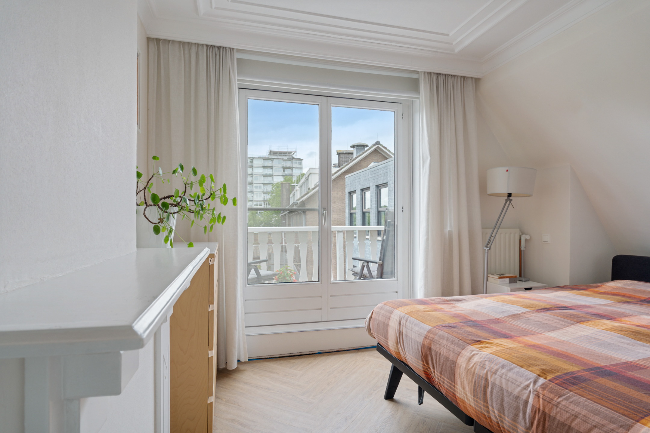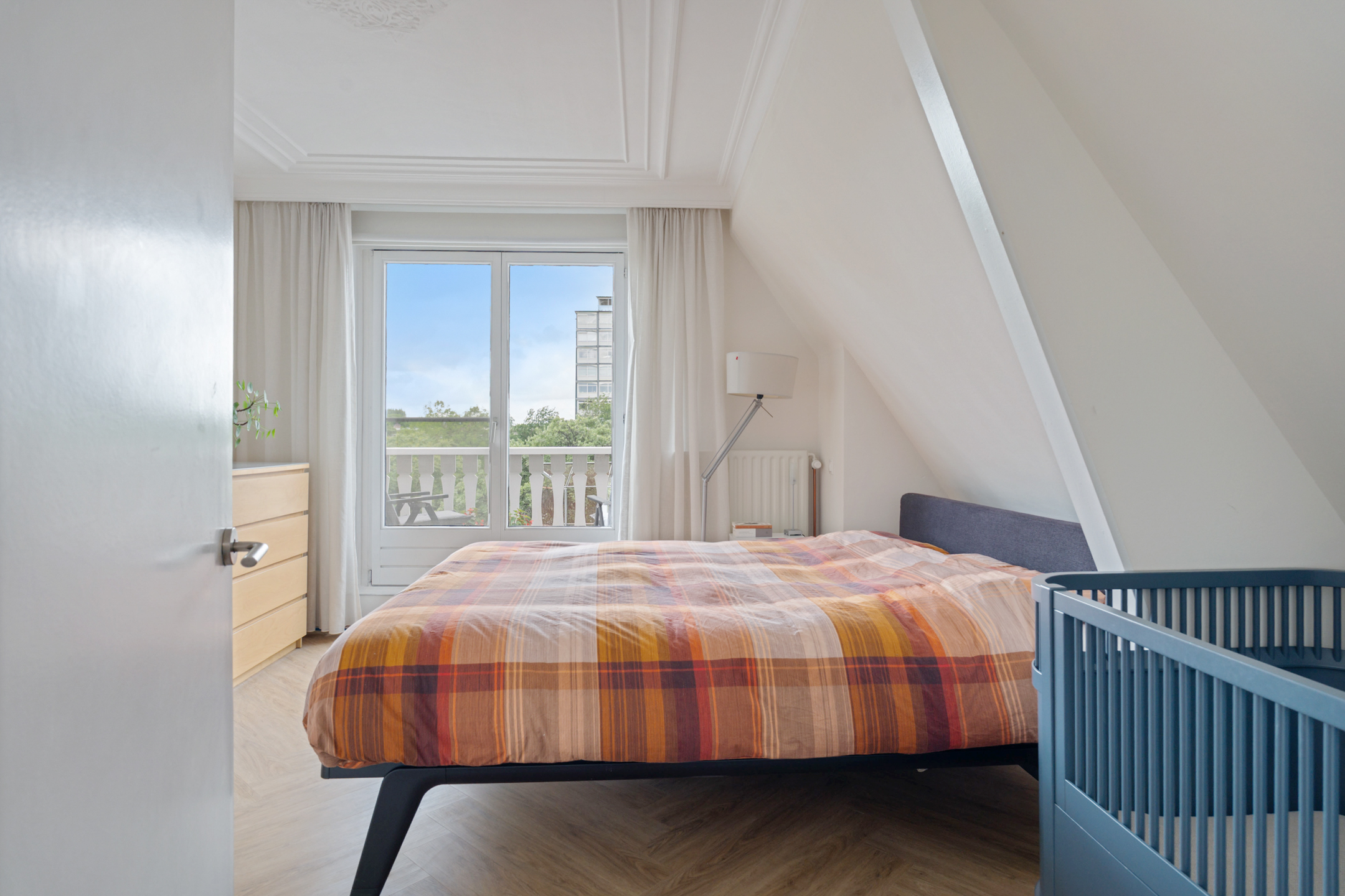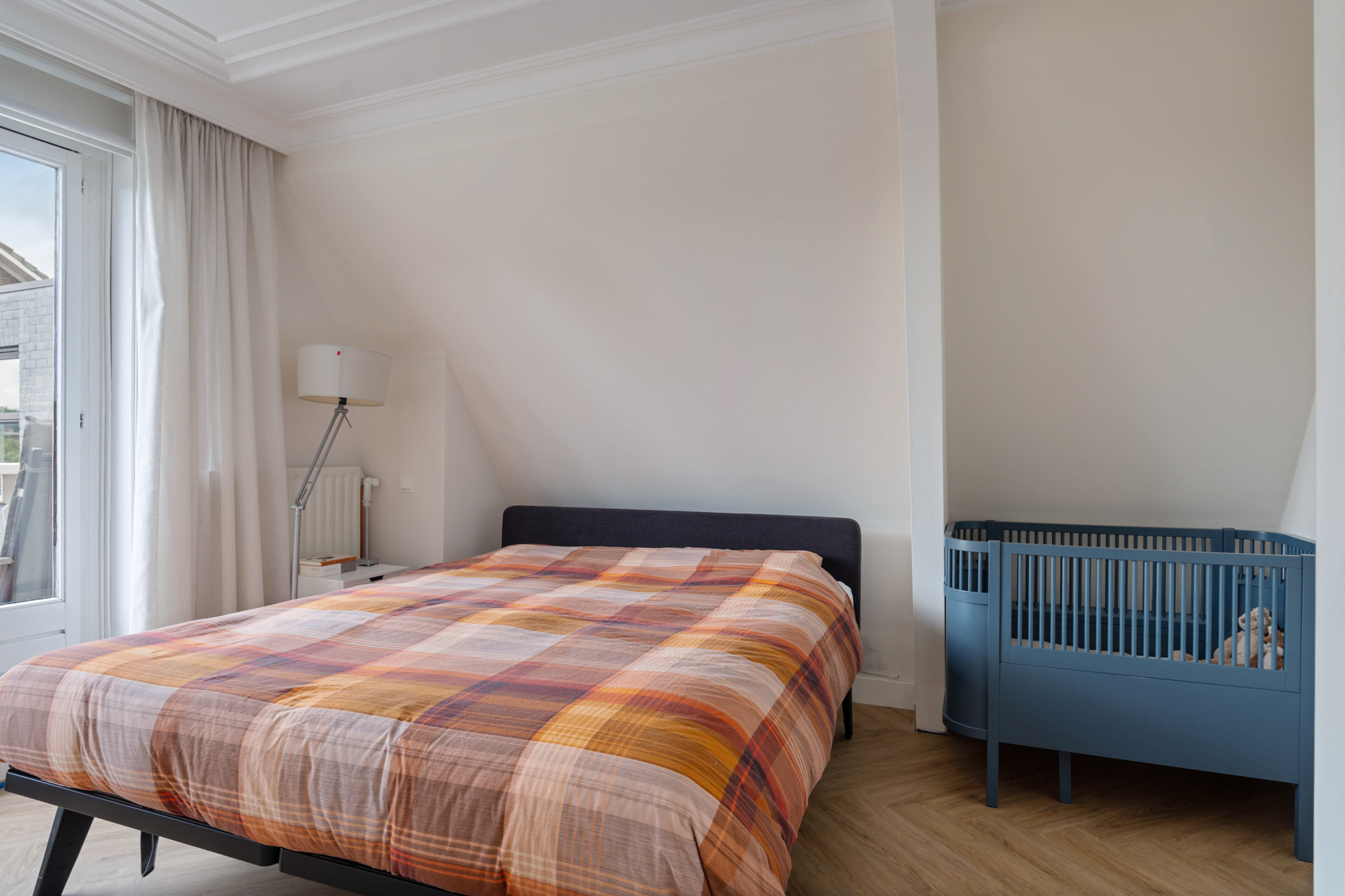 De bovenverdieping is ruimtelijk en licht dankzij een dakkoepel en een dakkapel met grote ramen. Aan de voorzijde bevindt zich de eerste slaapkamer, voorzien van een grote kast en verrassend veel ruimte. De tweede slaapkamer ligt aan de rustige achterzijde en biedt direct toegang tot een royaal balkon van circa 4,30 meter op het westen.