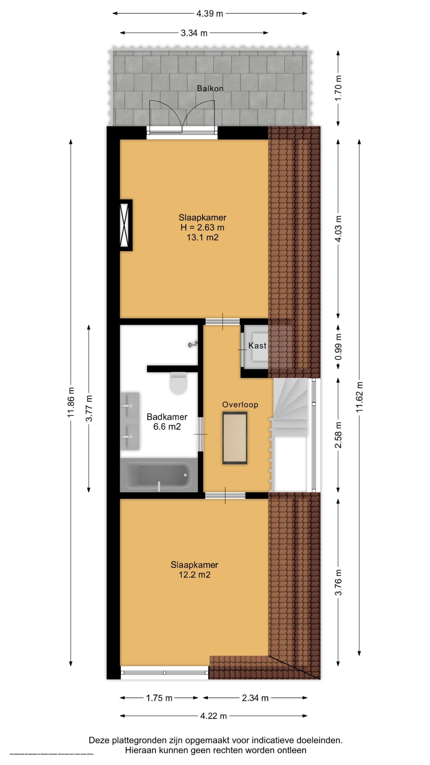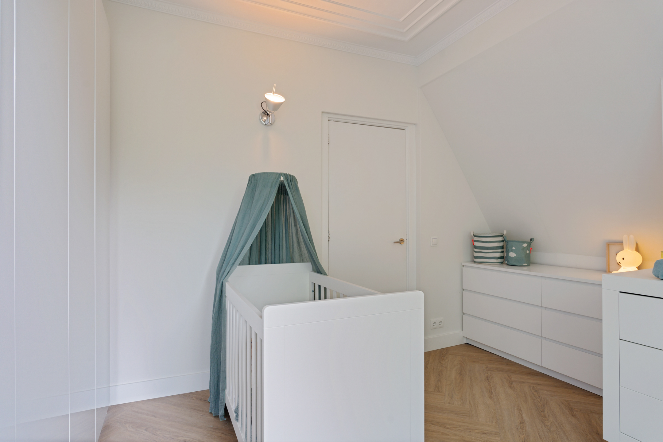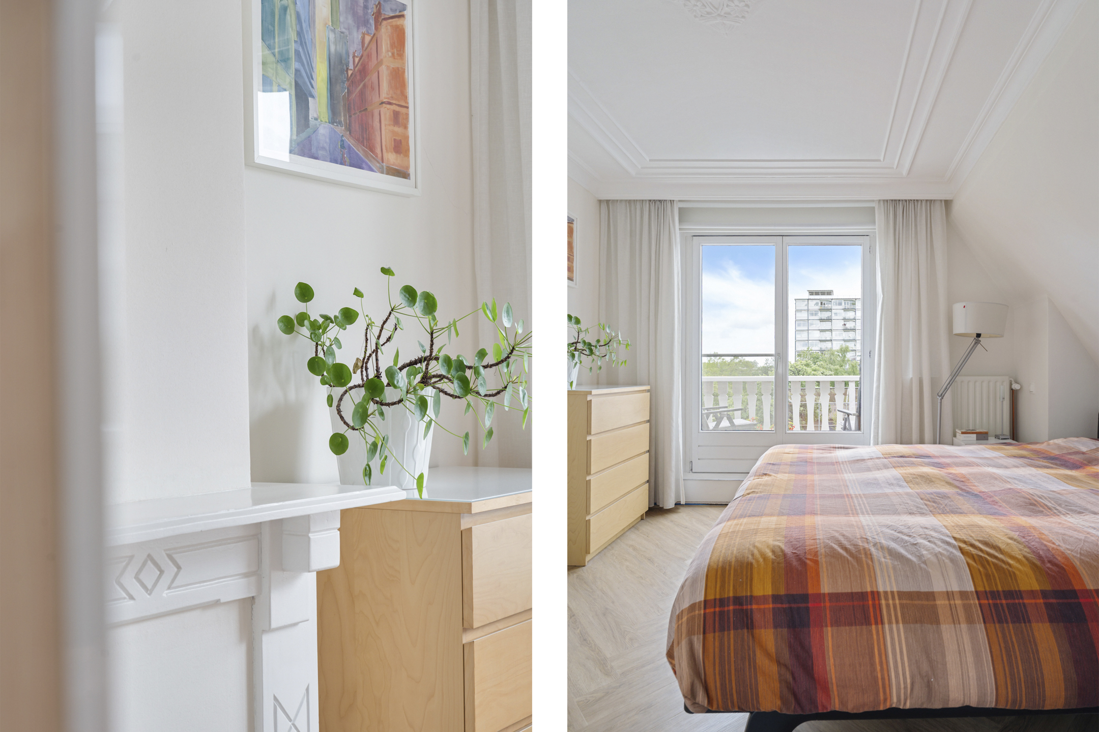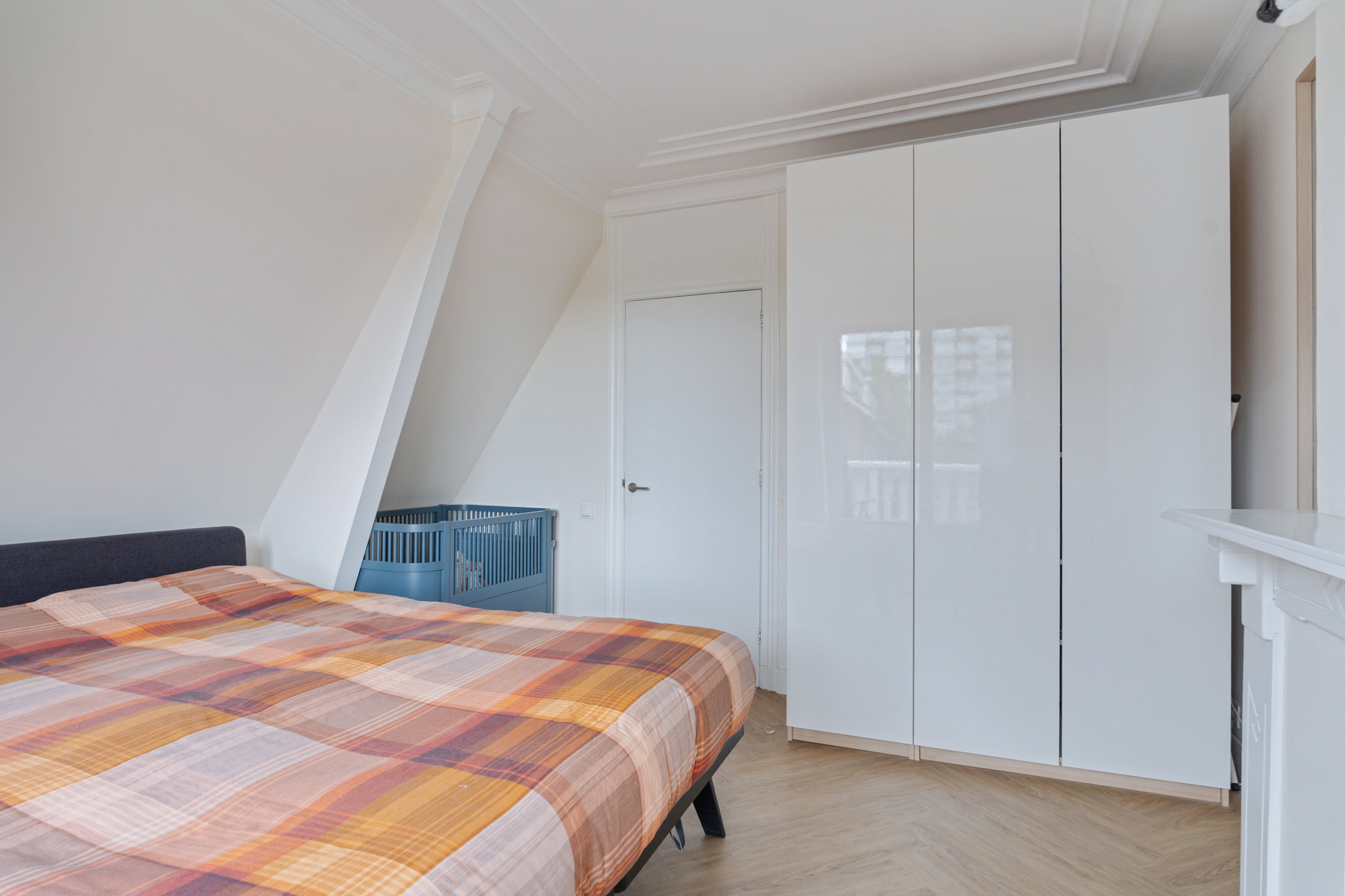 De bovenverdieping is ruimtelijk en licht dankzij een dakkoepel en een dakkapel met grote ramen. Aan de voorzijde bevindt zich de eerste slaapkamer, voorzien van een grote kast en verrassend veel ruimte. De tweede slaapkamer ligt aan de rustige achterzijde en biedt direct toegang tot een royaal balkon van circa 4,30 meter op het westen.