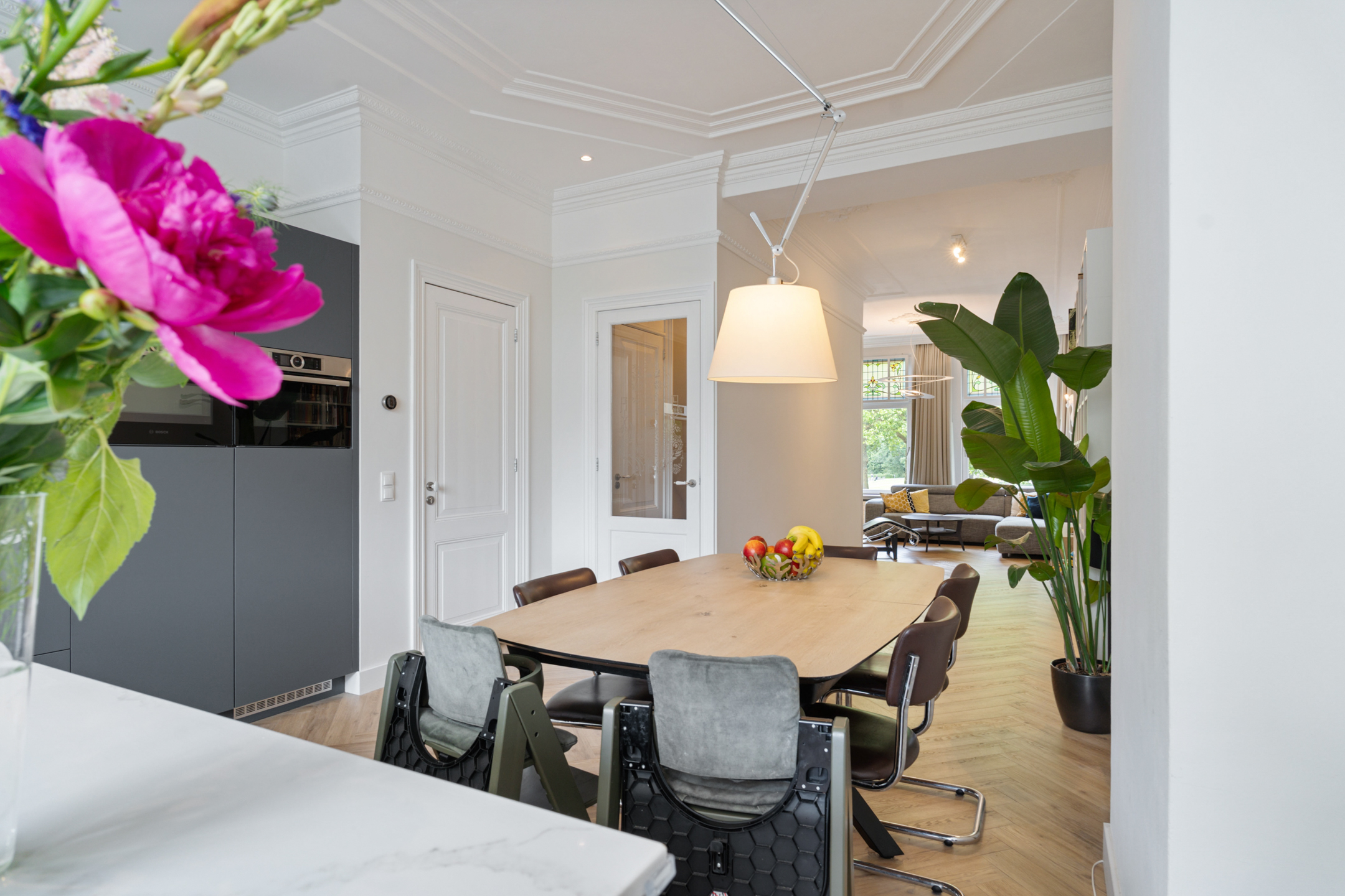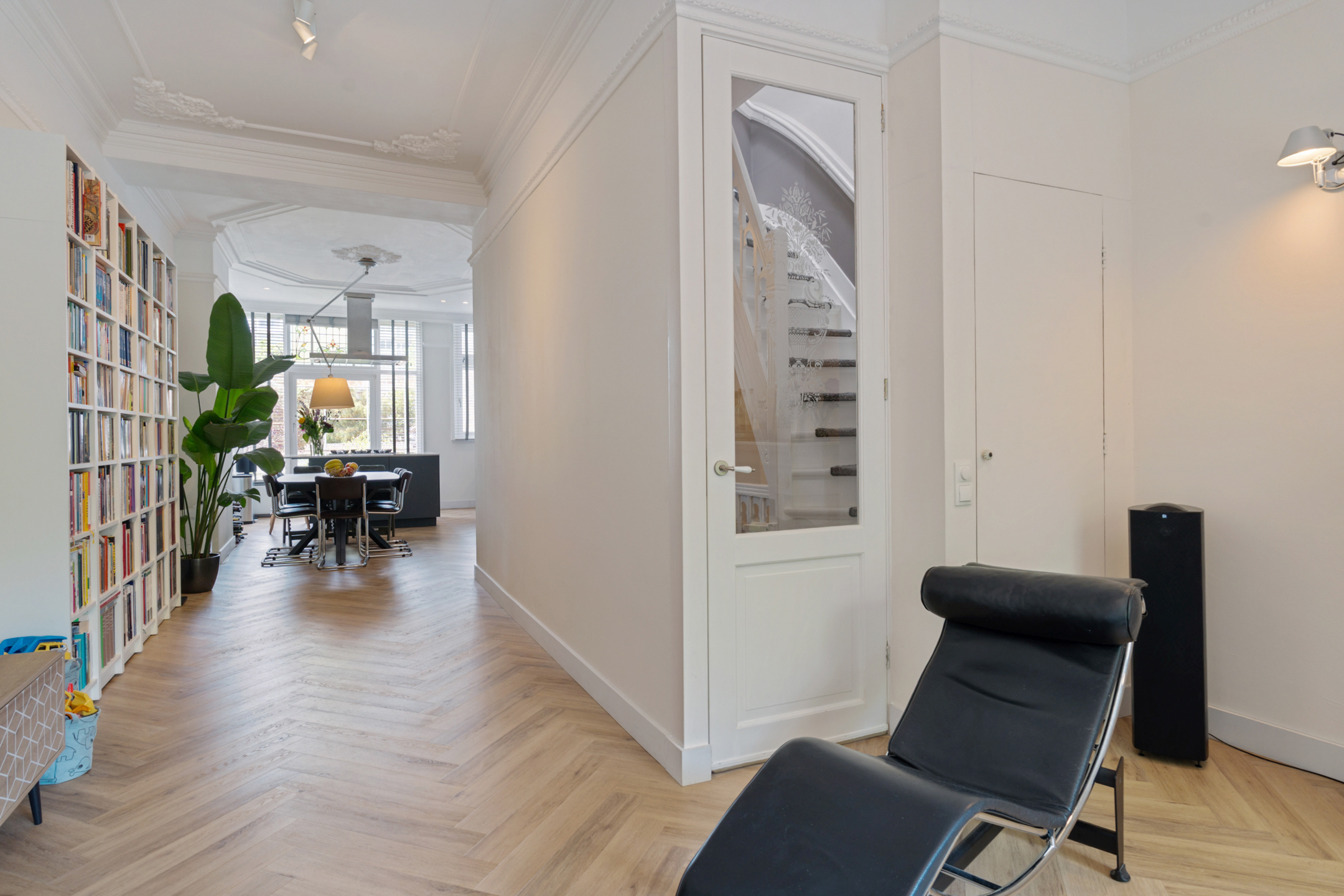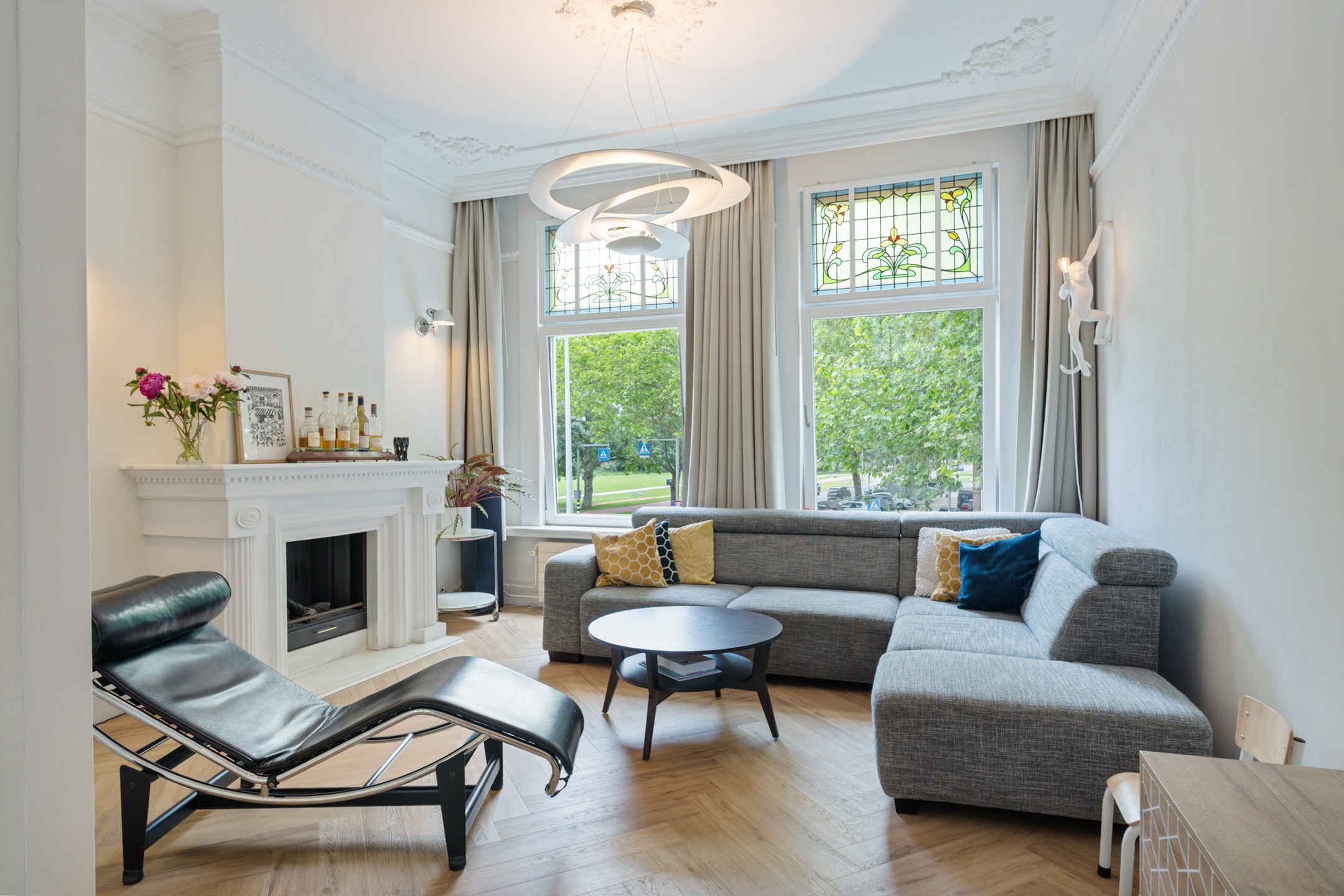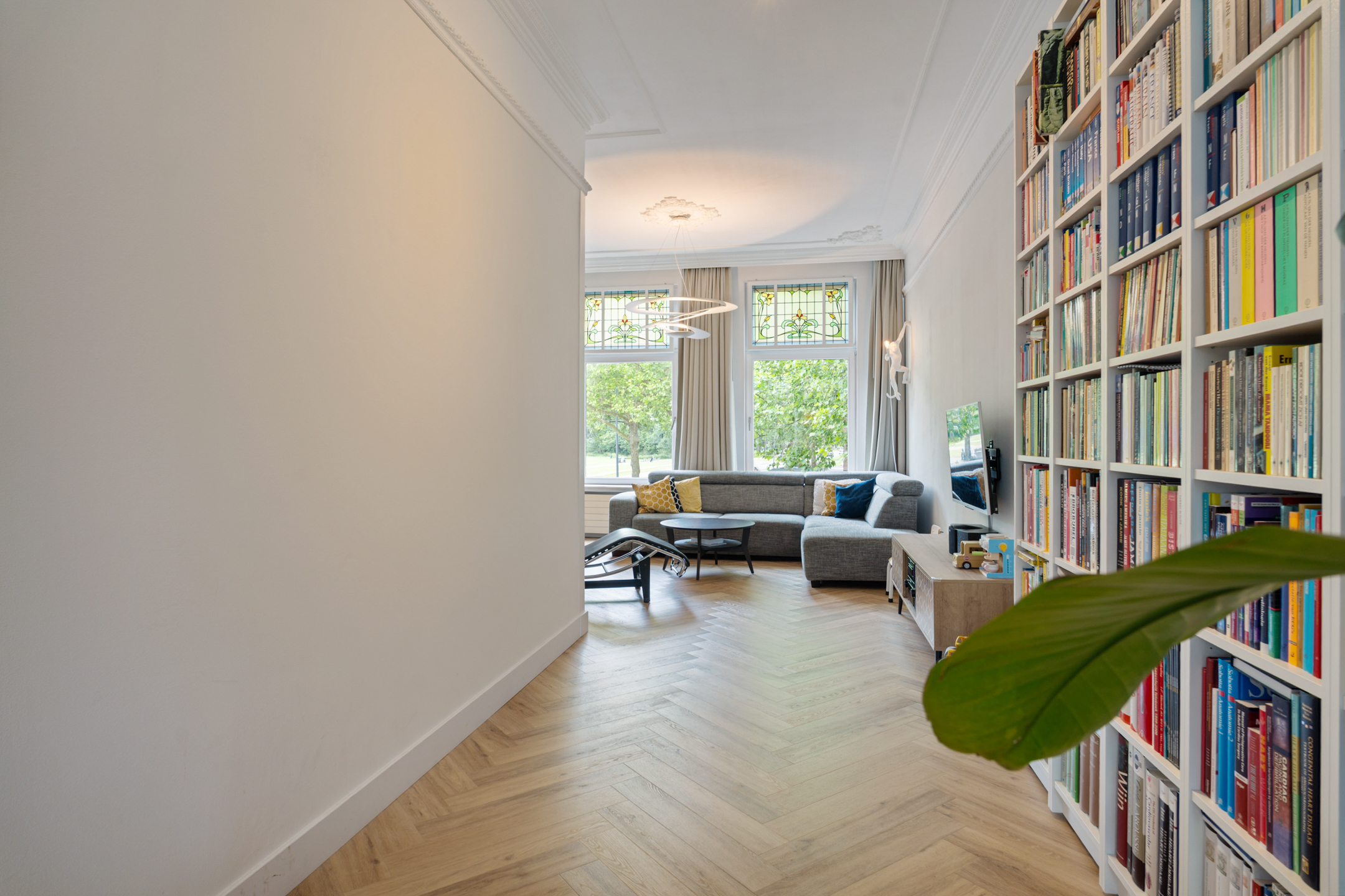 Aan de voorzijde ligt de sfeervolle woonkamer, waar hoge plafonds met ornamenten, glas-in-loodramen en een charmante haard direct in het oog springen. Het uitzicht op de Kralingse Plas maakt deze ruimte extra bijzonder – een plek om iedere dag van te genieten.