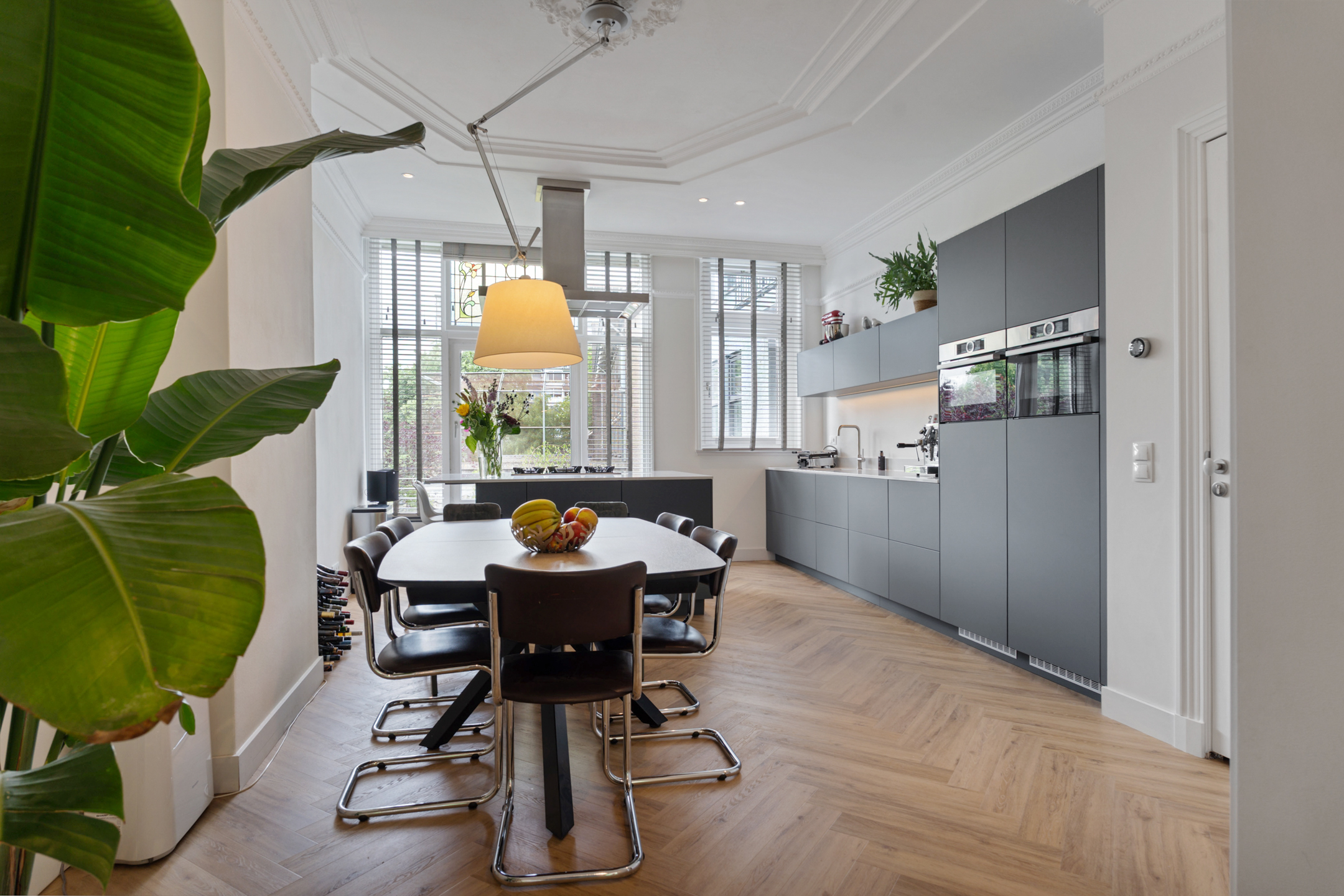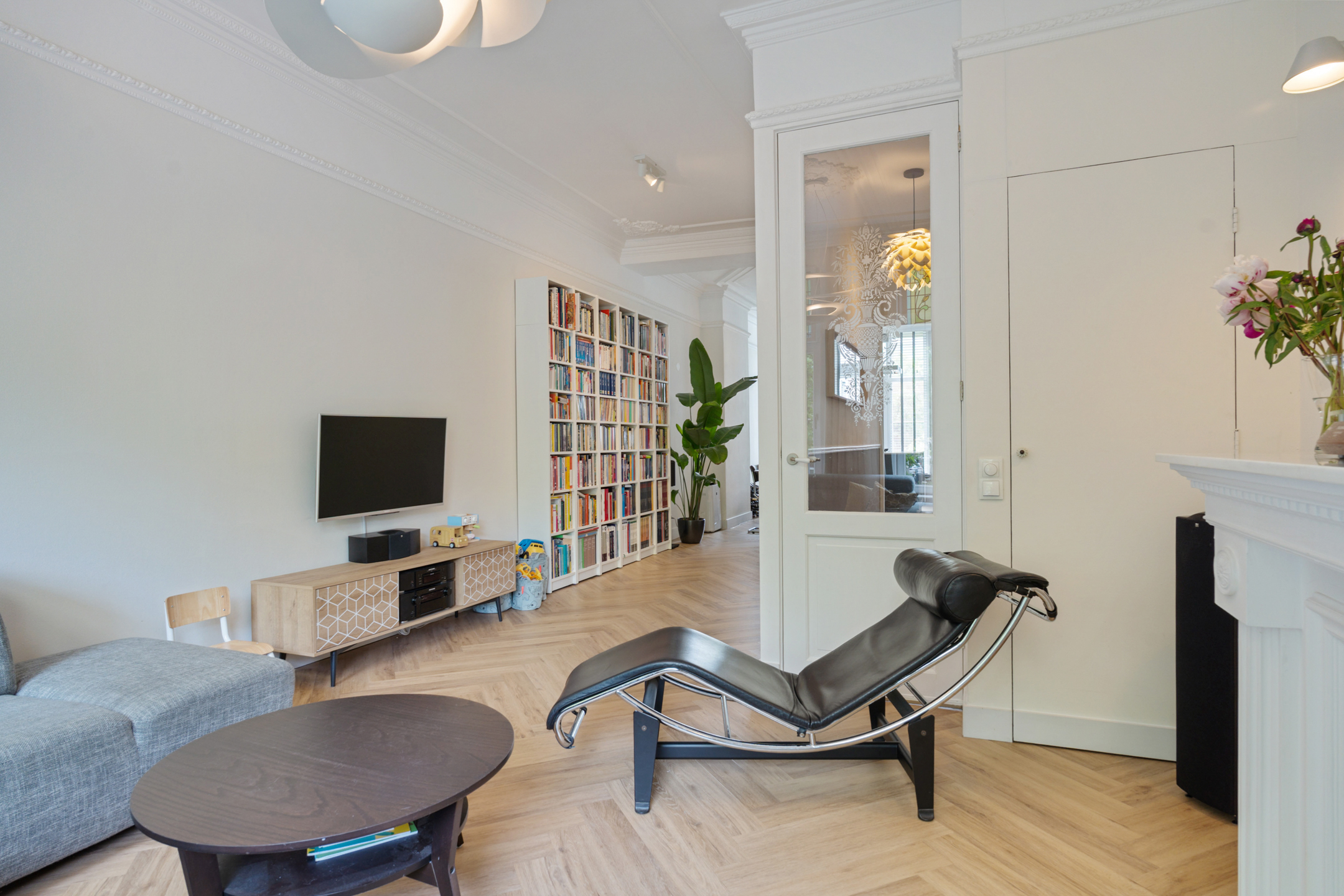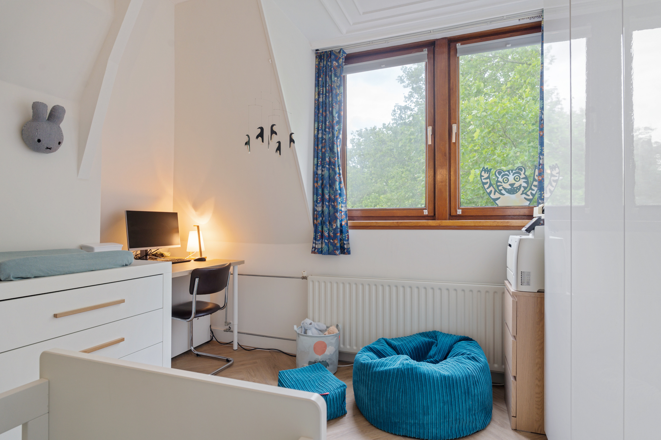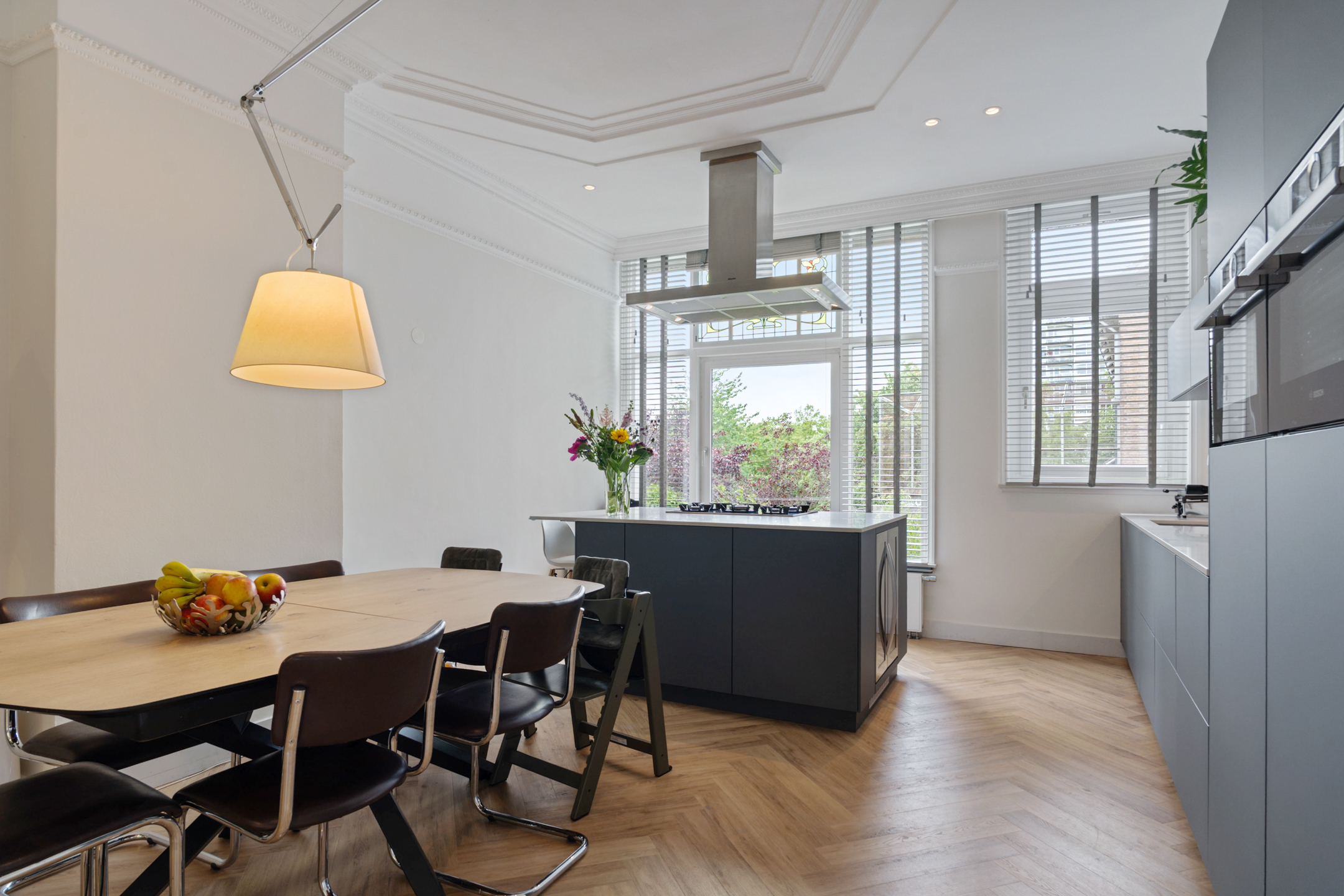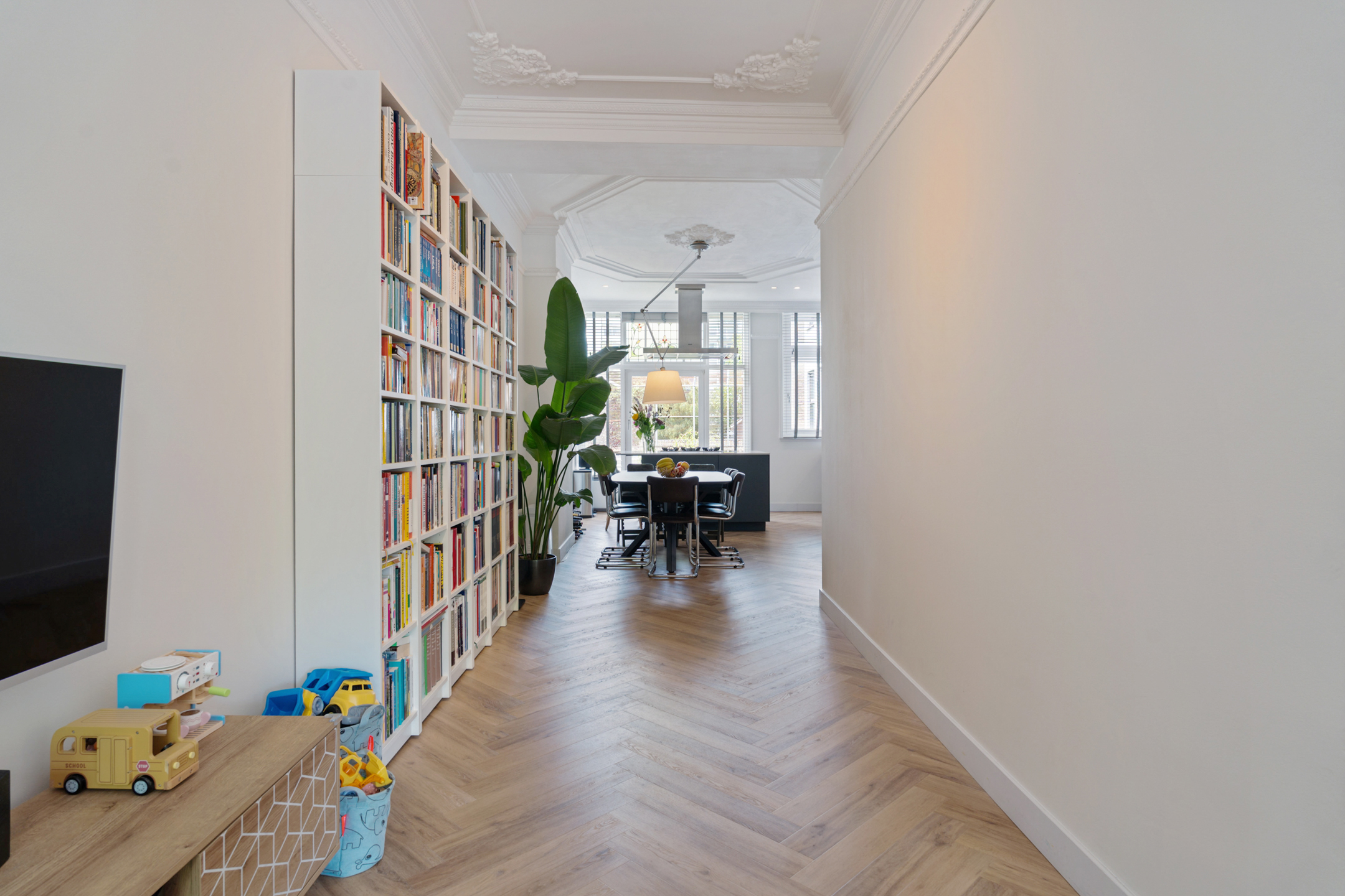 Aan de voorzijde ligt de sfeervolle woonkamer, waar hoge plafonds met ornamenten, glas-in-loodramen en een charmante haard direct in het oog springen. Het uitzicht op de Kralingse Plas maakt deze ruimte extra bijzonder – een plek om iedere dag van te genieten.