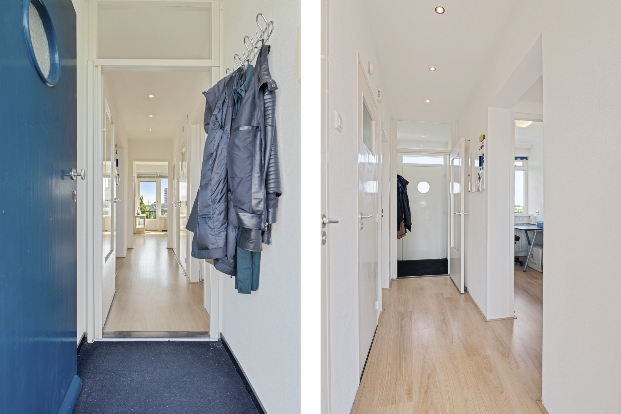 Via het tochtportaal stap je binnen in de centrale hal met toegang tot alle vertrekken. De ruime woonkamer aan de achterzijde is extra licht doordat een voormalige slaapkamer erbij is betrokken. Er is een aparte zit- en eethoek gecreëerd, met een extra raam aan de zijkant – een voordeel van het hoekappartement.