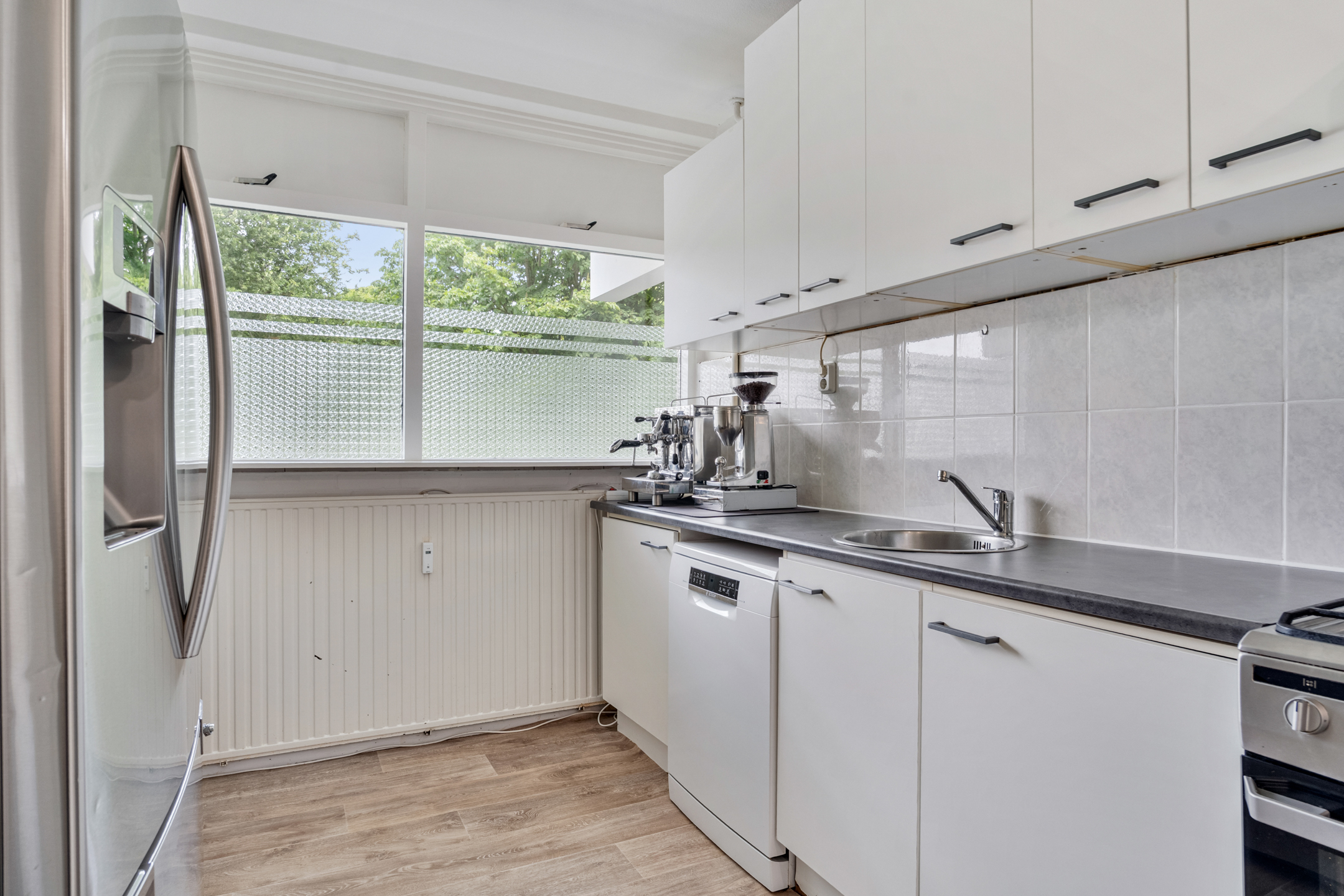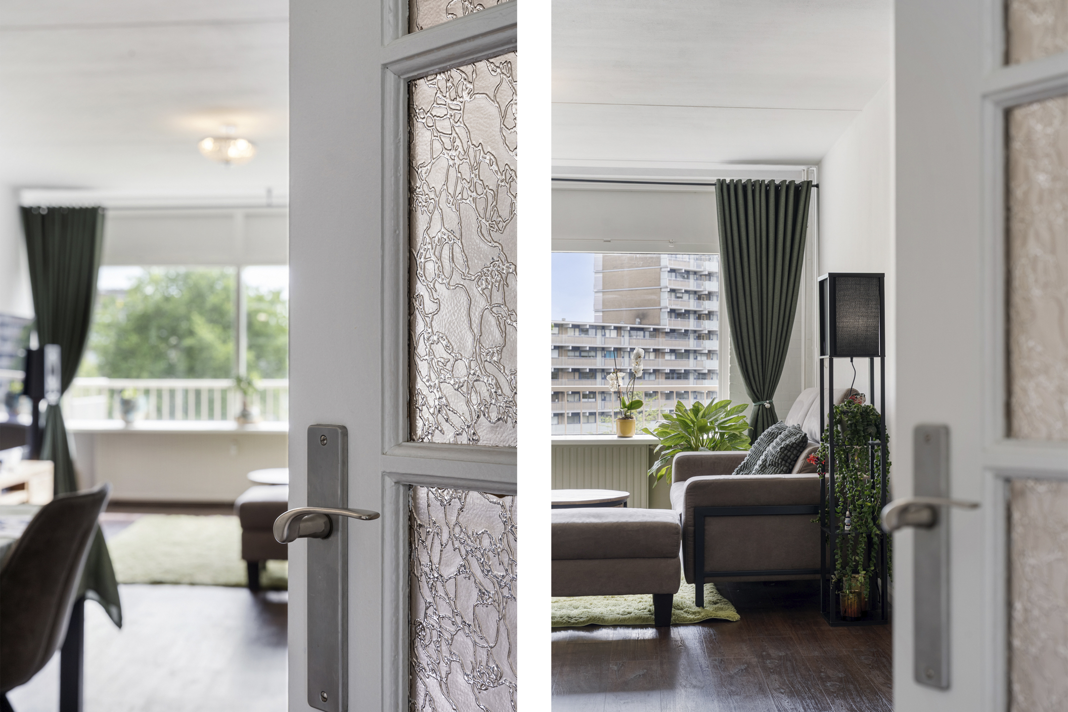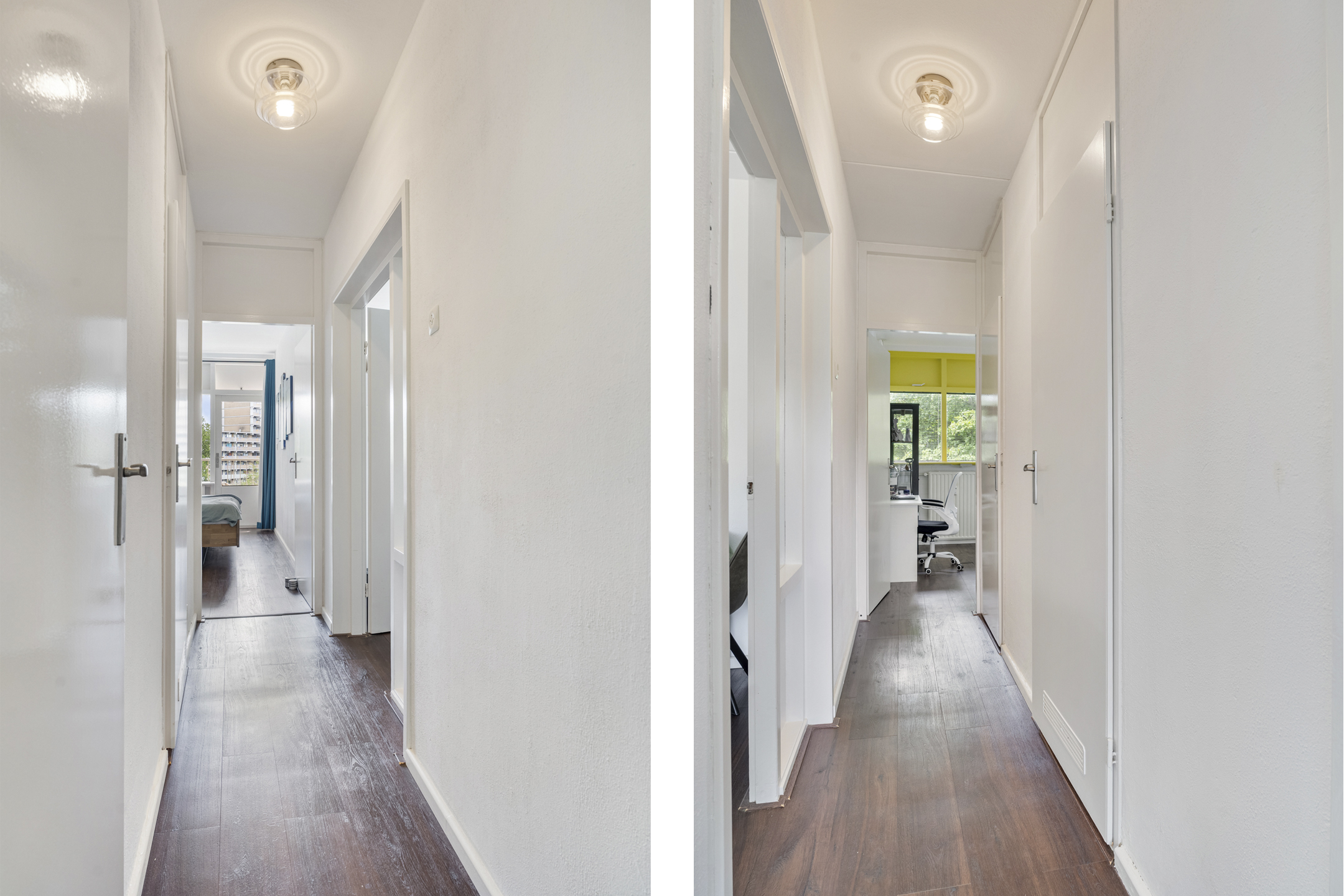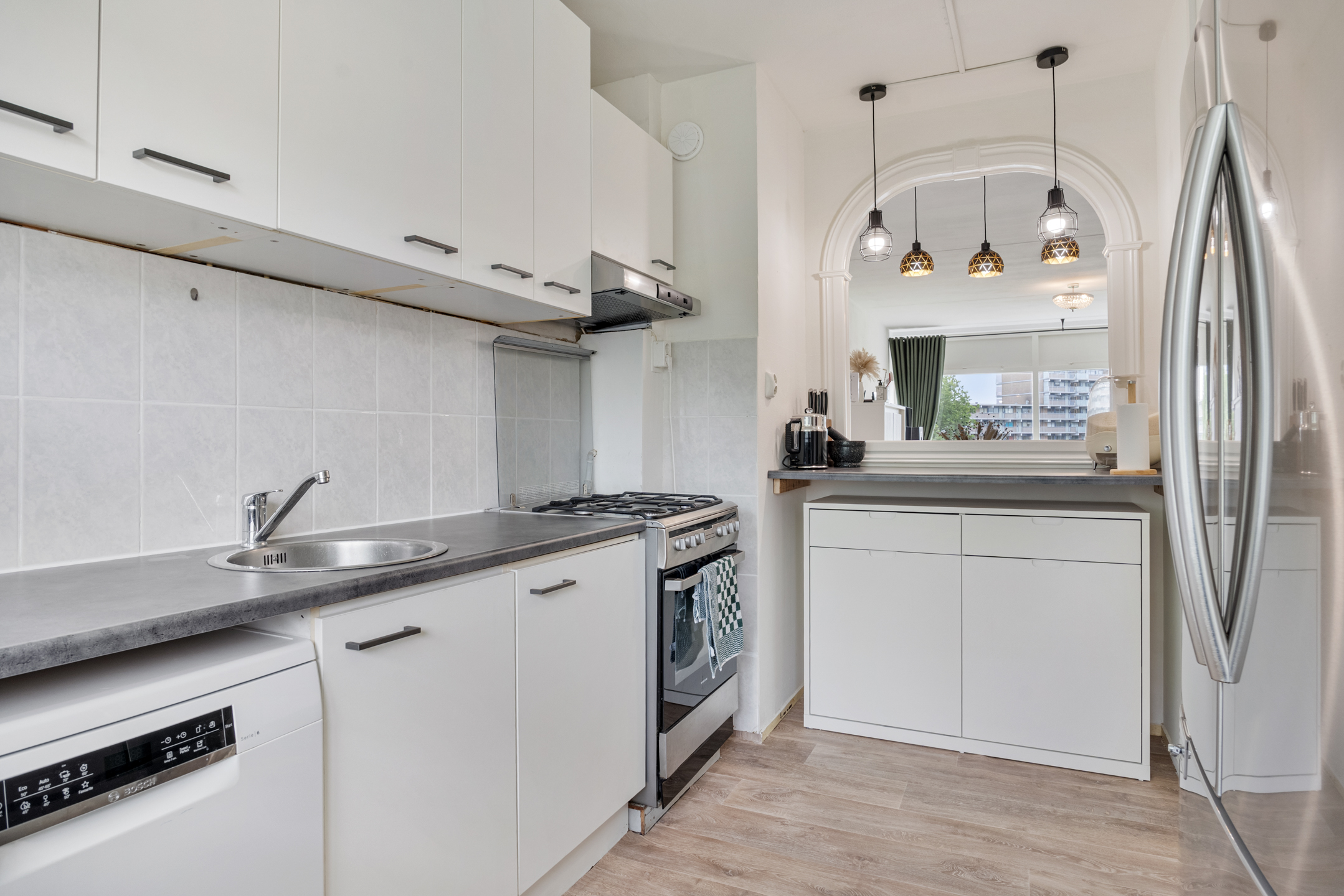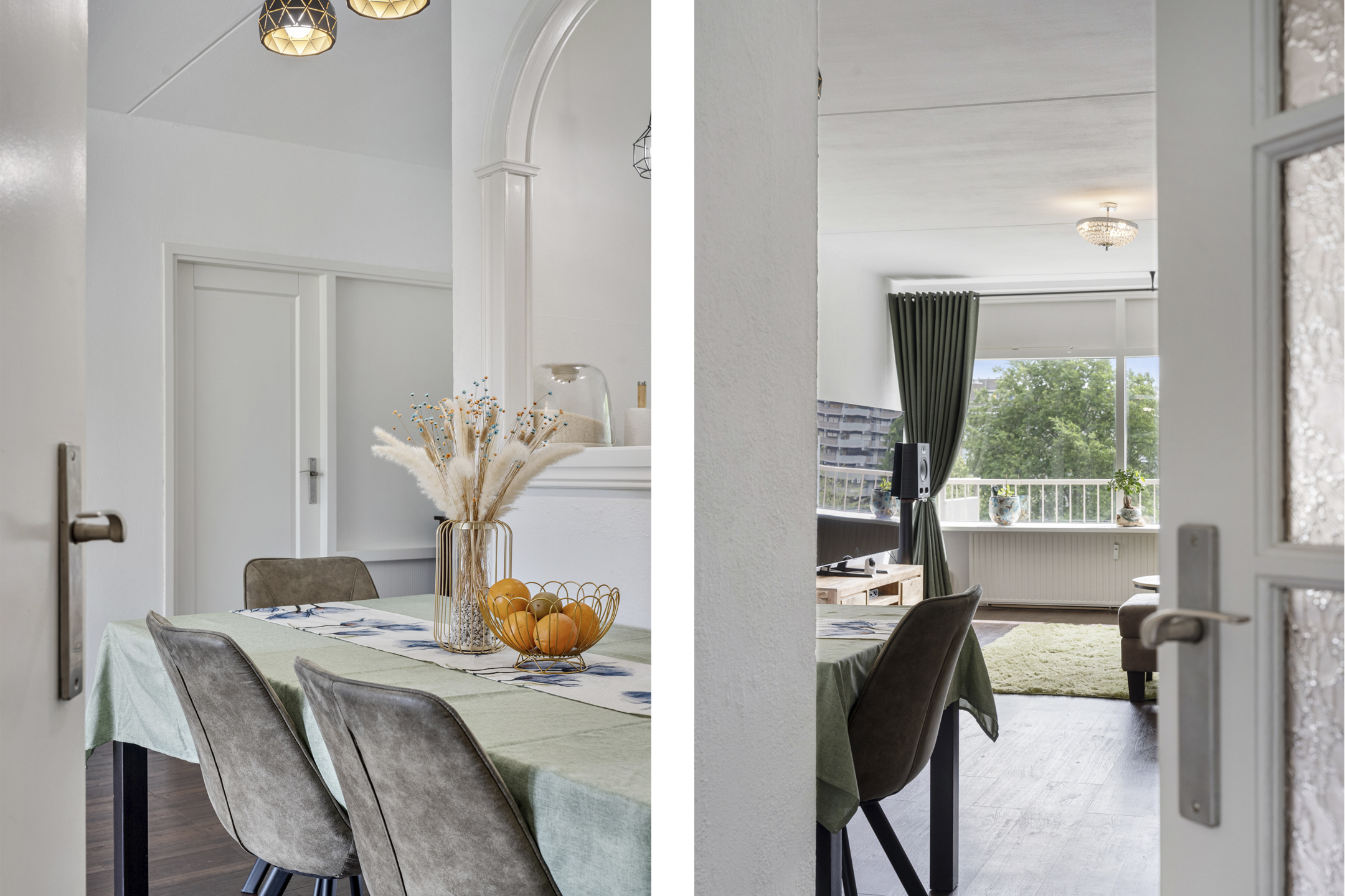 De entreehal van het appartement is voorzien van een meterkast en intercom. De keuken ligt aan de voorzijde en is praktisch ingericht, met voldoende werk- en bergruimte. De royale woon-/eetkamer bevindt zich aan de achterzijde en baadt in het licht dankzij de grote ramen. Vanuit hier kijk je uit op het groen en heb je toegang tot één van de drie slaapkamers.