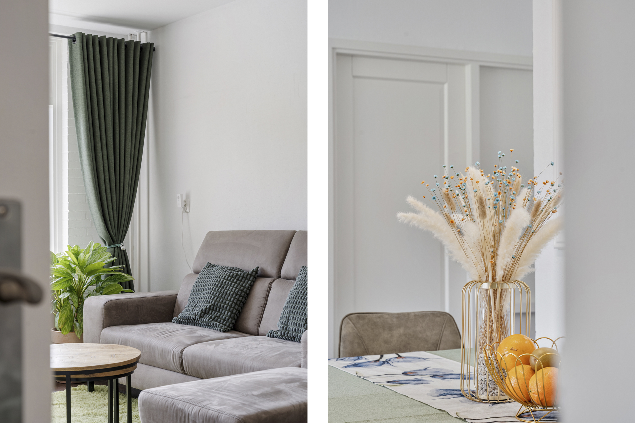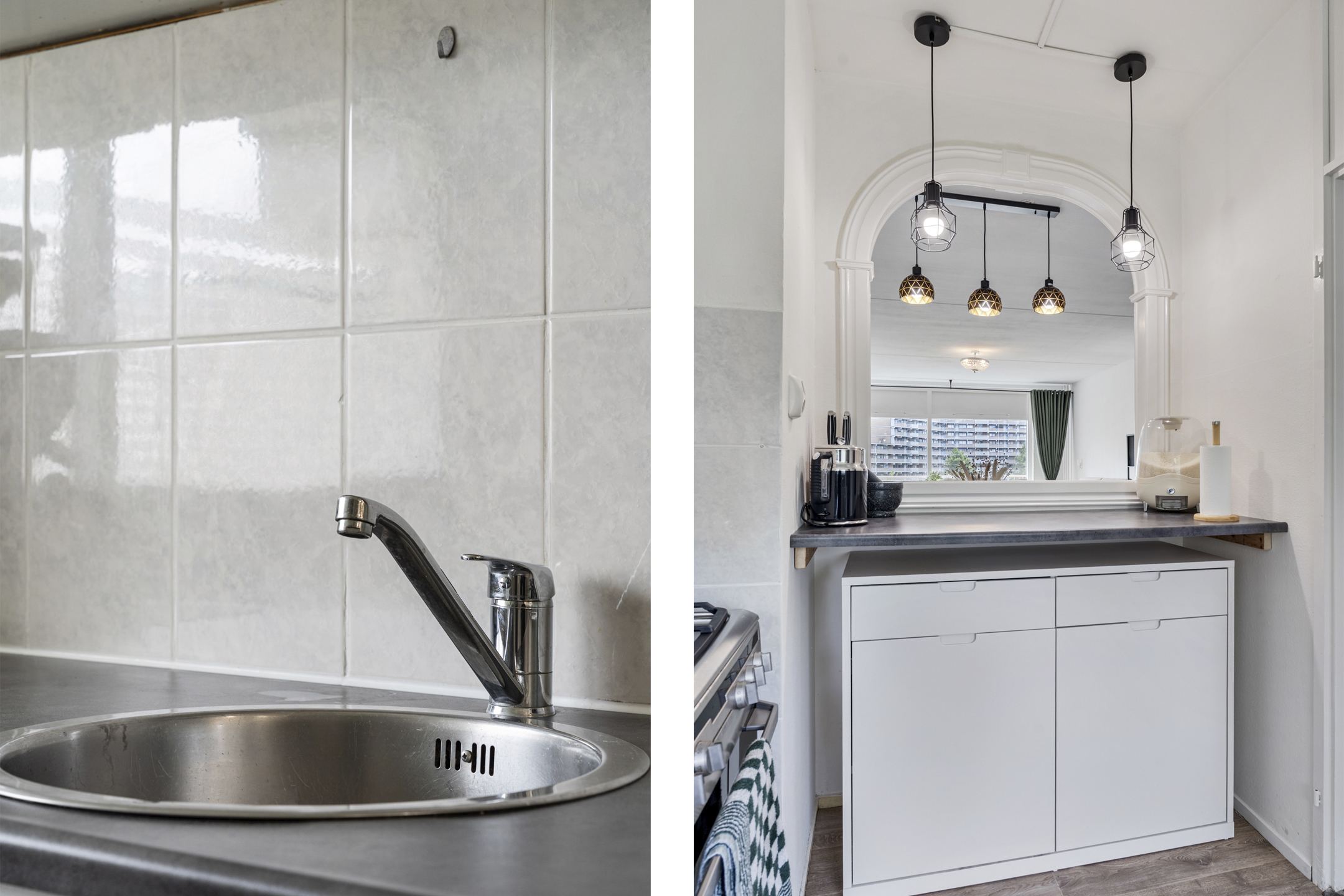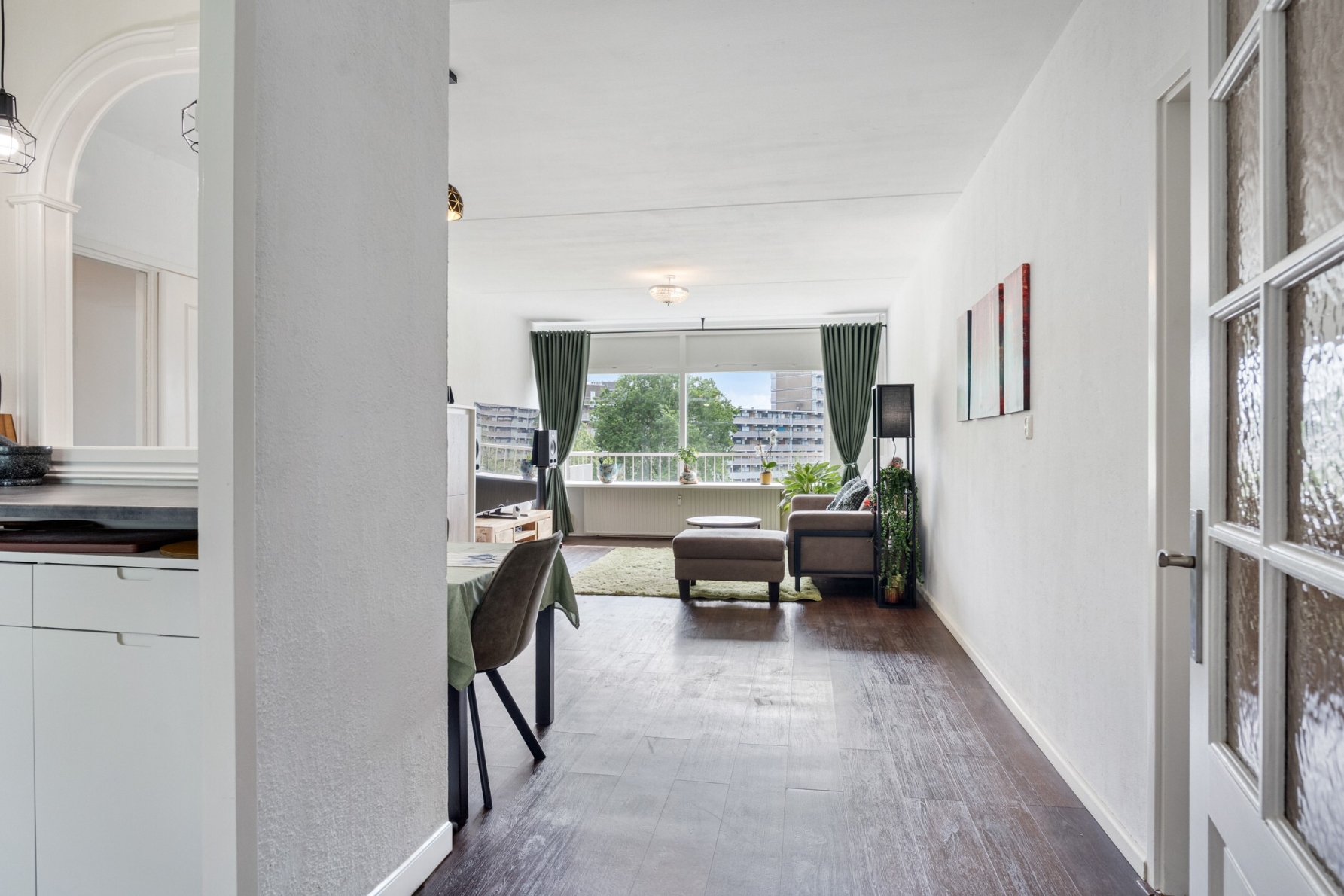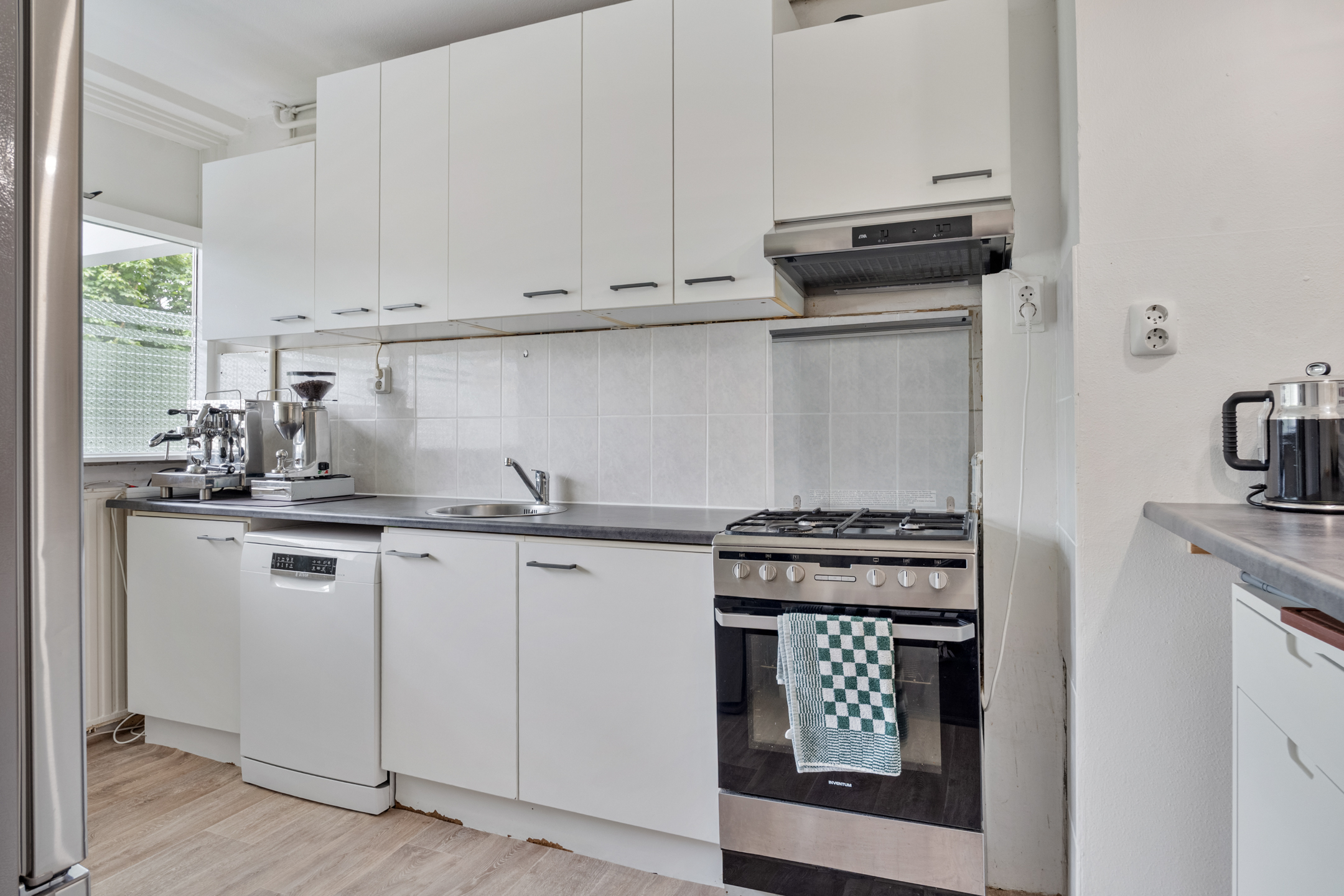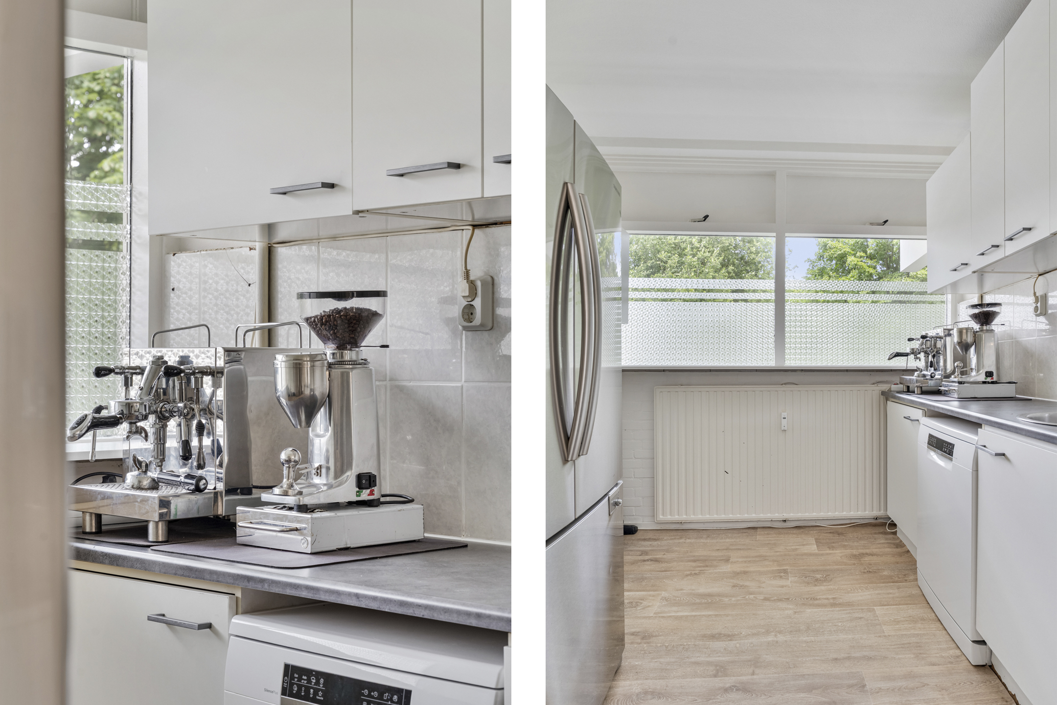 De entreehal van het appartement is voorzien van een meterkast en intercom. De keuken ligt aan de voorzijde en is praktisch ingericht, met voldoende werk- en bergruimte. De royale woon-/eetkamer bevindt zich aan de achterzijde en baadt in het licht dankzij de grote ramen. Vanuit hier kijk je uit op het groen en heb je toegang tot één van de drie slaapkamers.