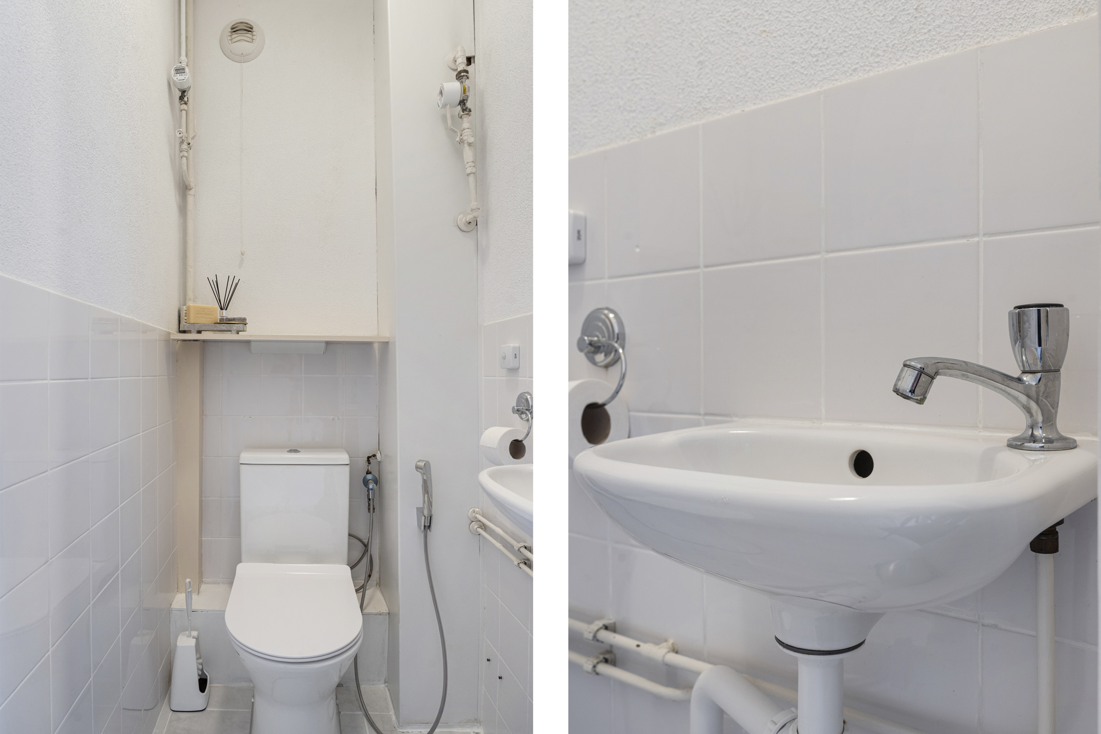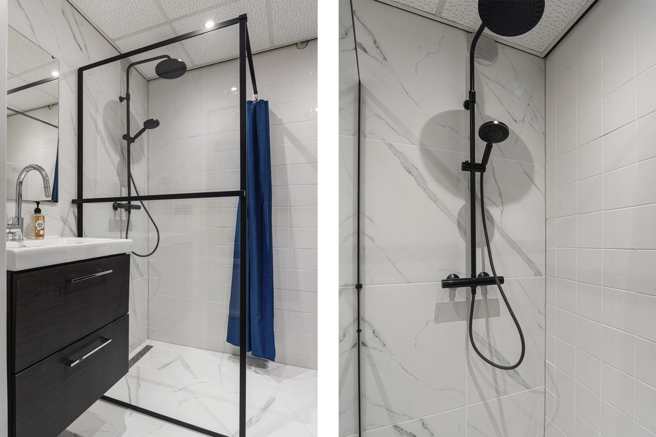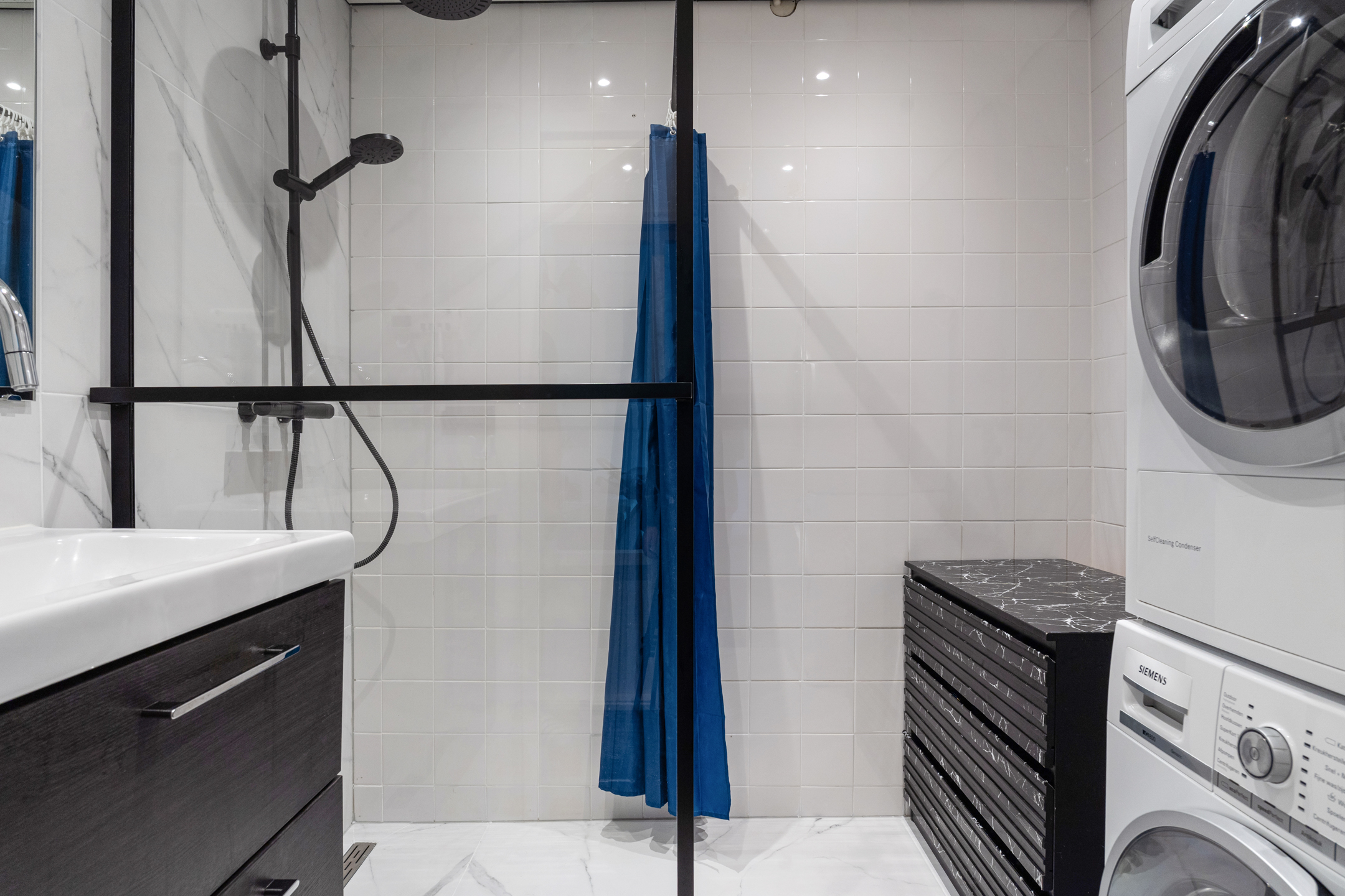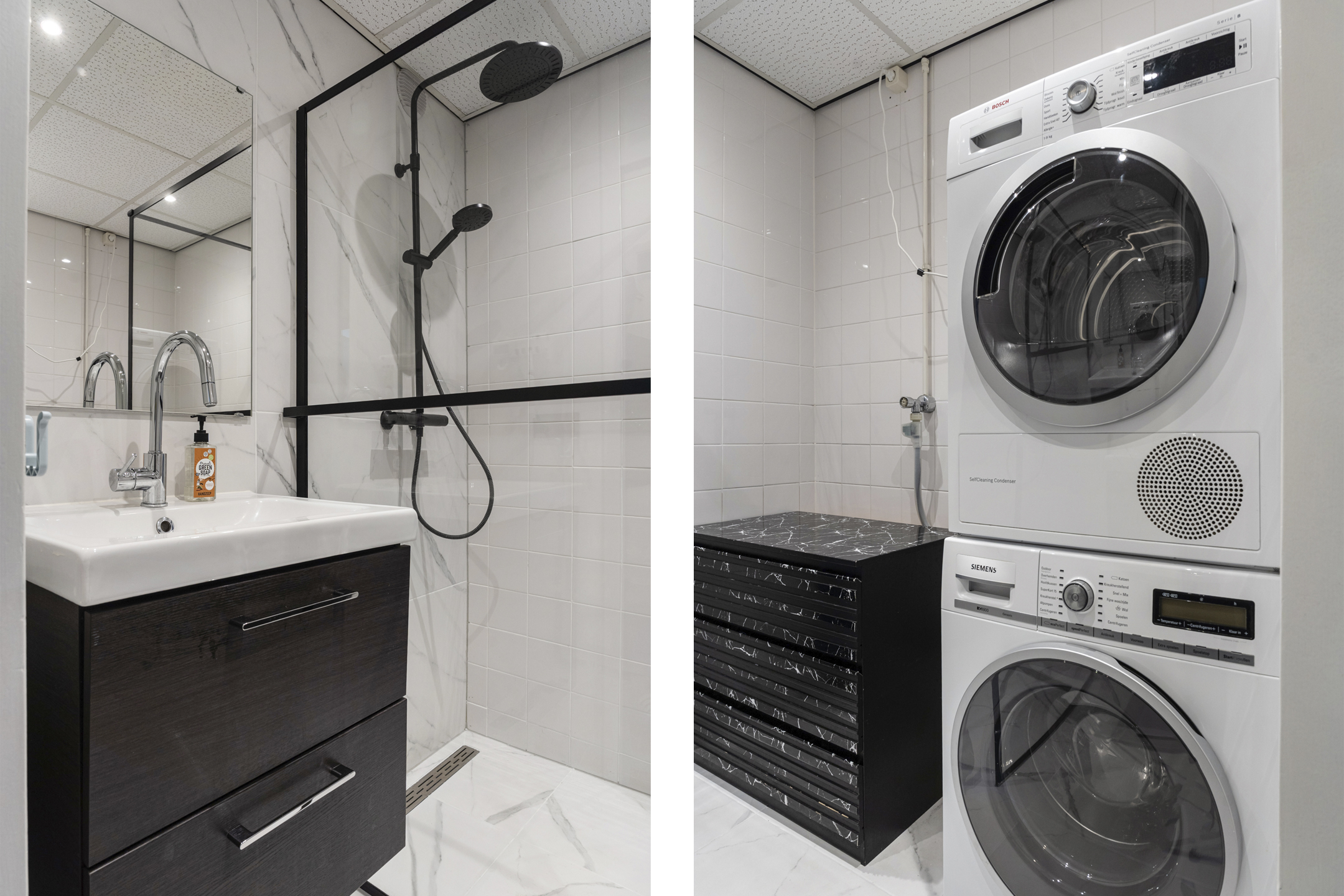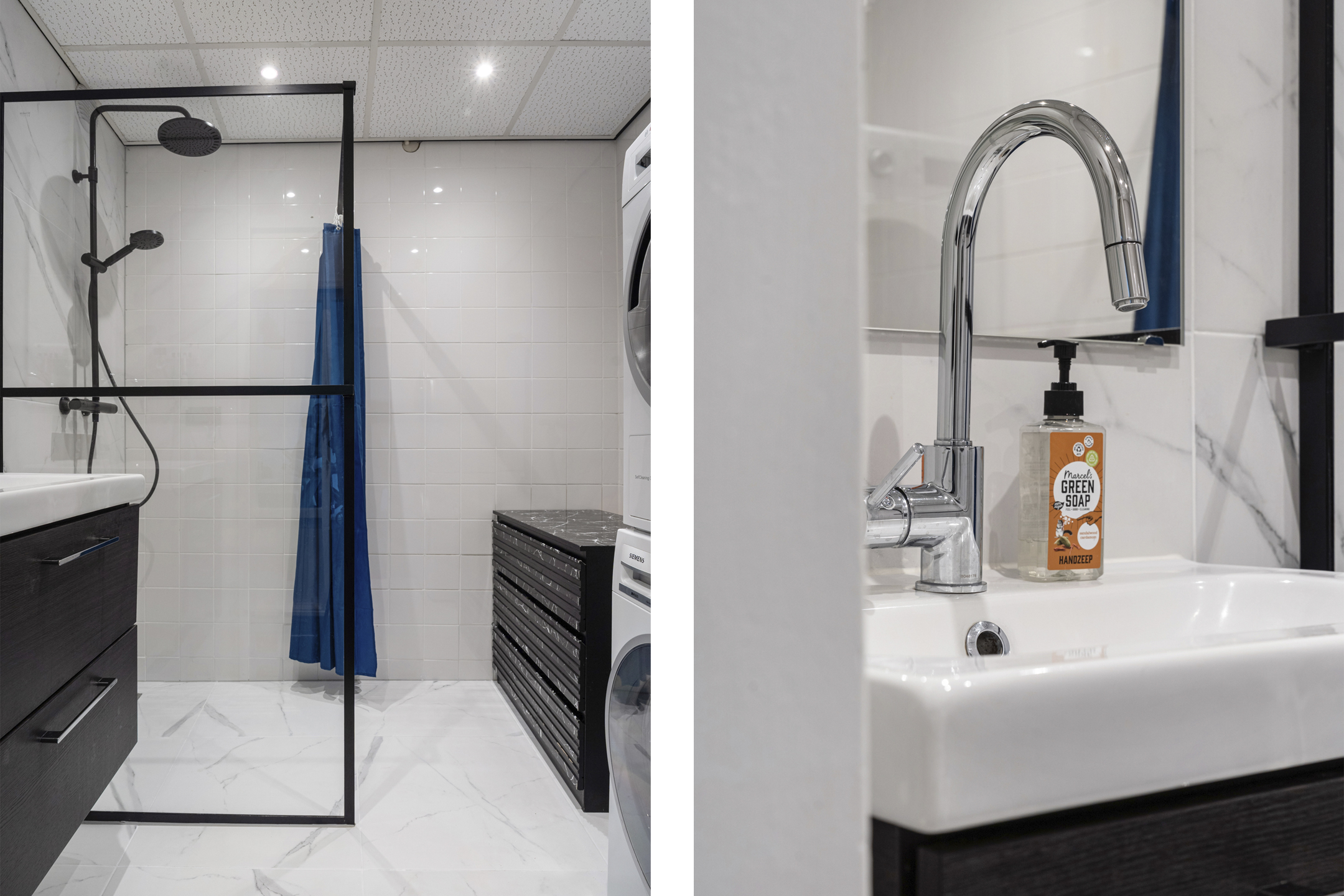 De badkamer is volledig betegeld en luxe afgewerkt, met een wastafelmeubel, inloopdouche en aansluitingen voor je wasmachine en droger. Het toilet met fonteintje is separaat en bereikbaar via de hal.