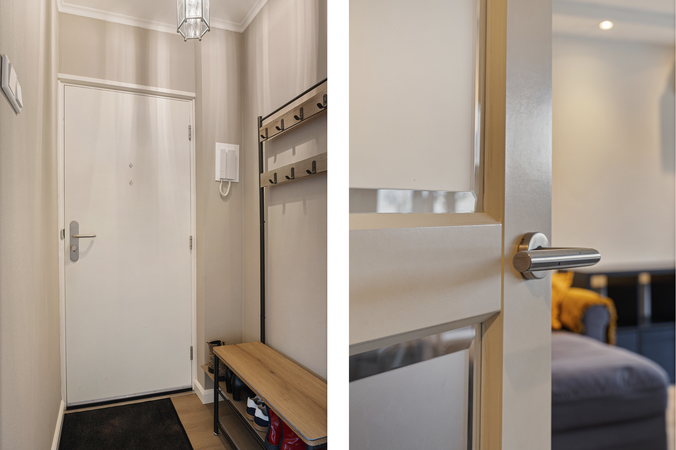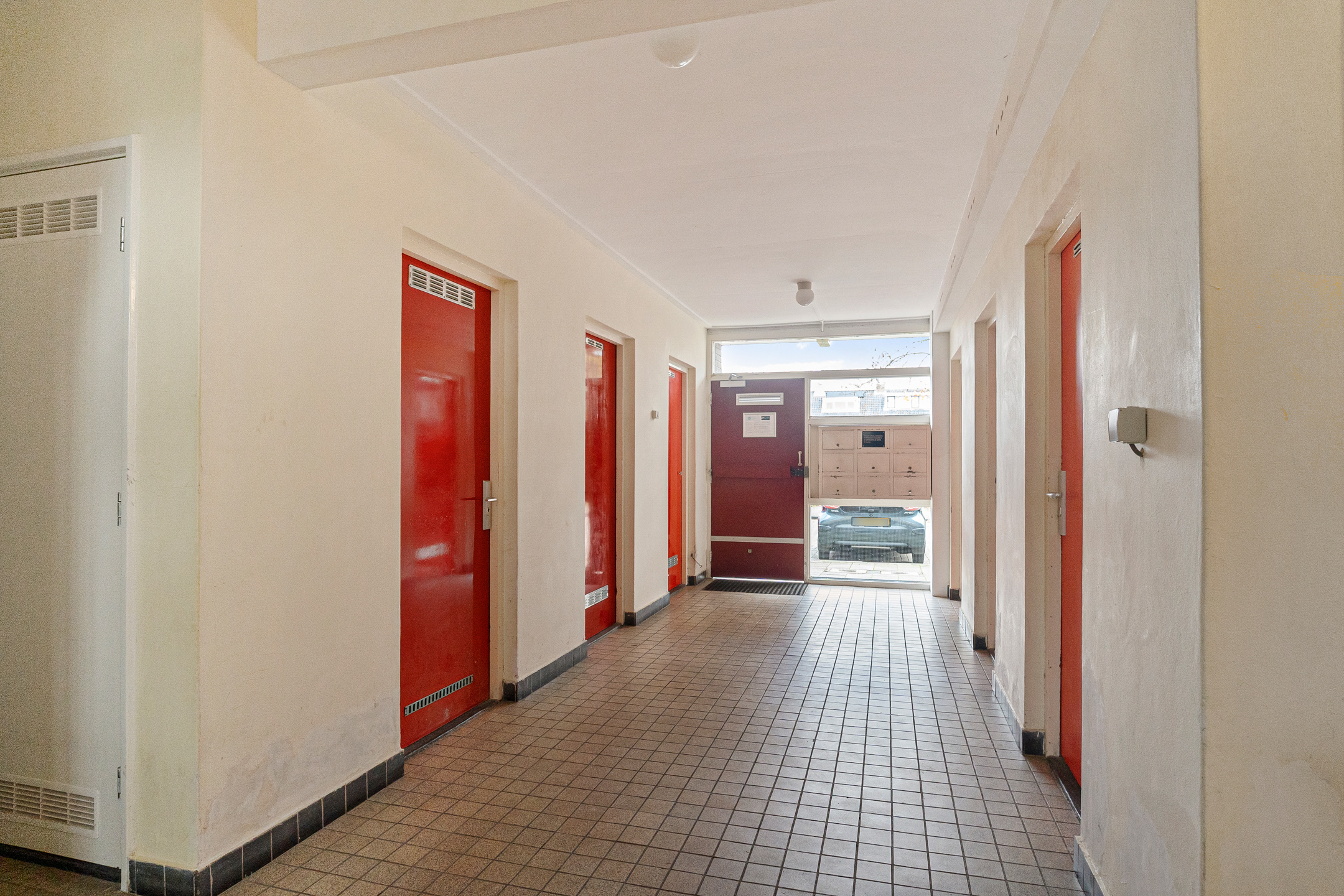 De afgesloten centrale hal is voorzien van een beltableau met videocom, brievenbussen, het trappenhuis en toegang tot de bergingen. Ook de meterkast van het appartement bevindt zich in deze ruimte. Achterin de centrale hal ligt de deur naar het appartement.