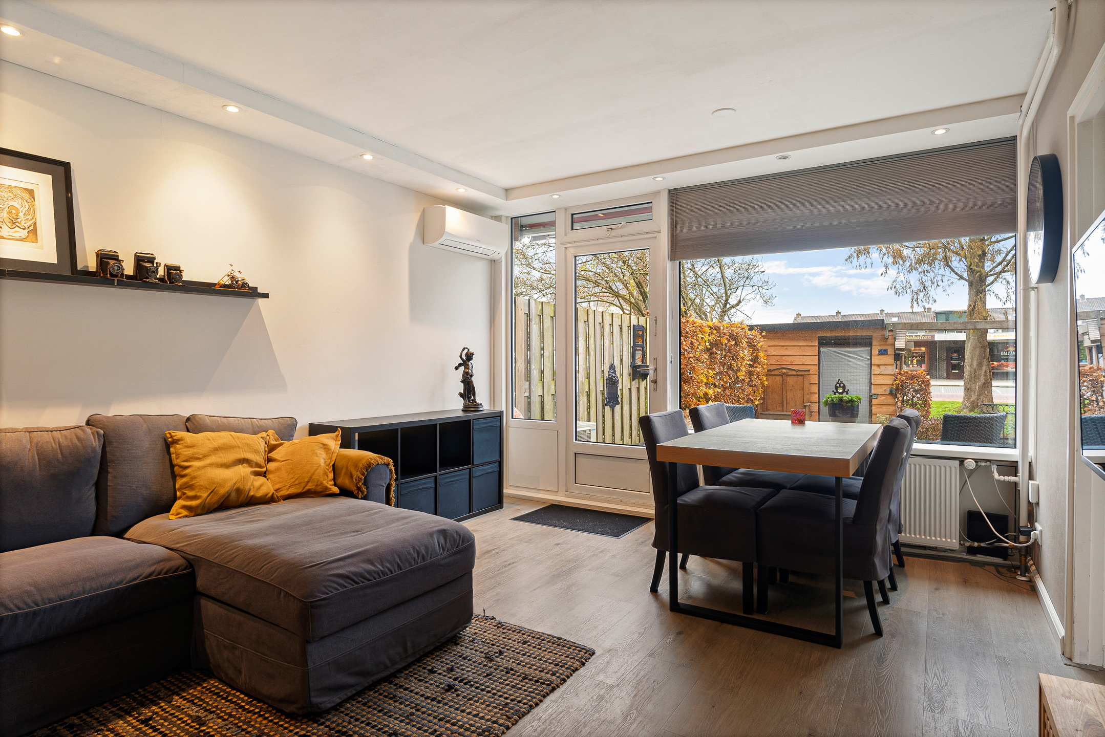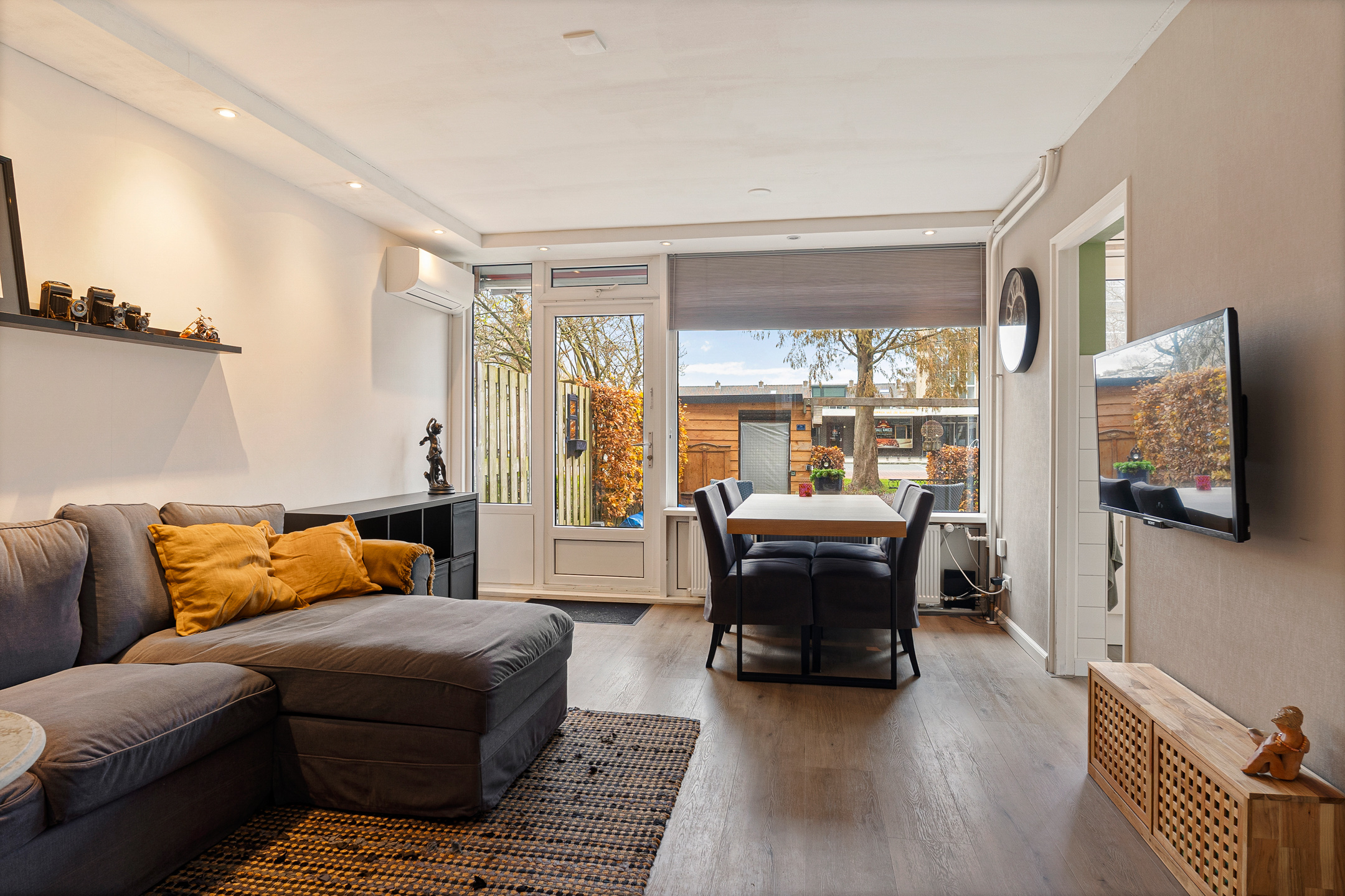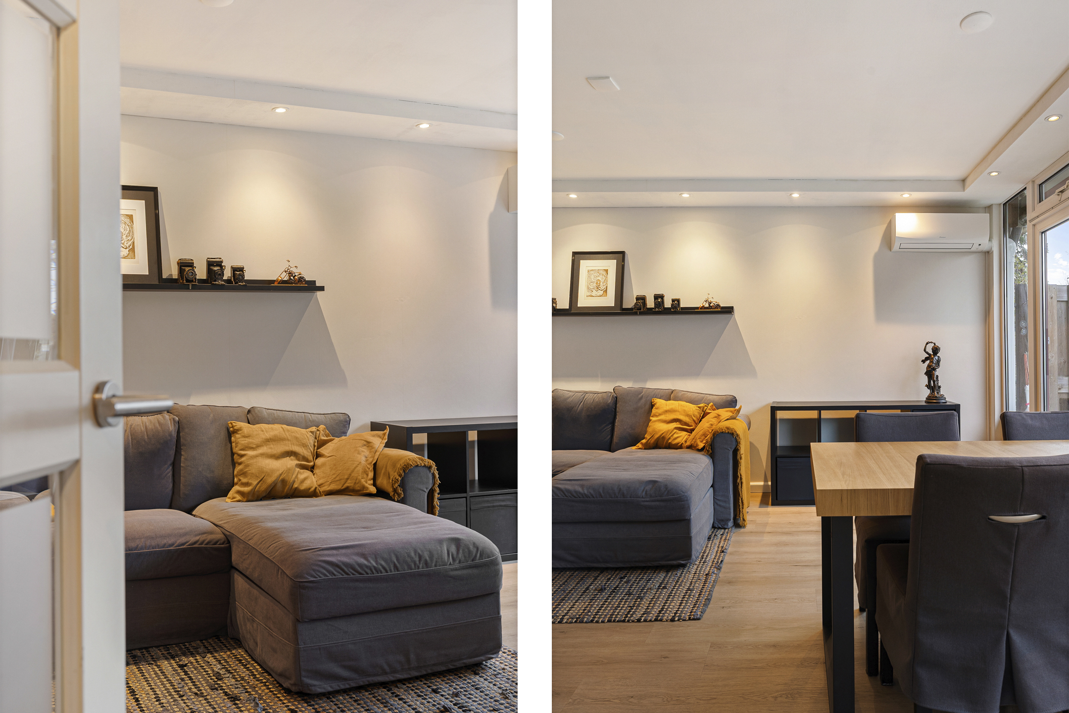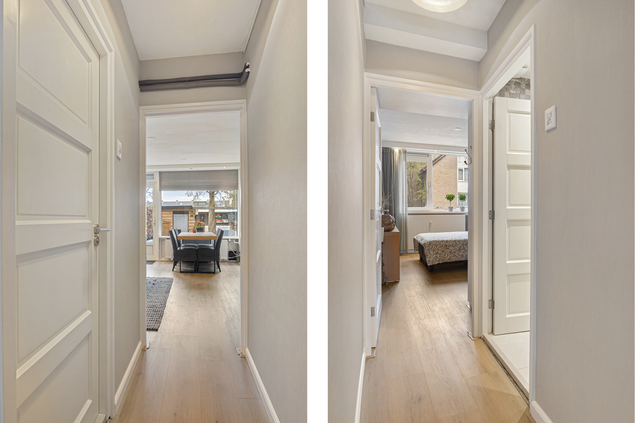 Je stapt binnen in een compacte hal die doorloopt naar de woonkamer. De woonkamer is licht, sfeervol en kijkt uit op de tuin; een fijne plek om te ontspannen. De laminaatvloer loopt door in de keuken en hal en het plafond is glad afgewerkt met sierlijsten. Via de deur in de woonkamer loop je zo de tuin in.