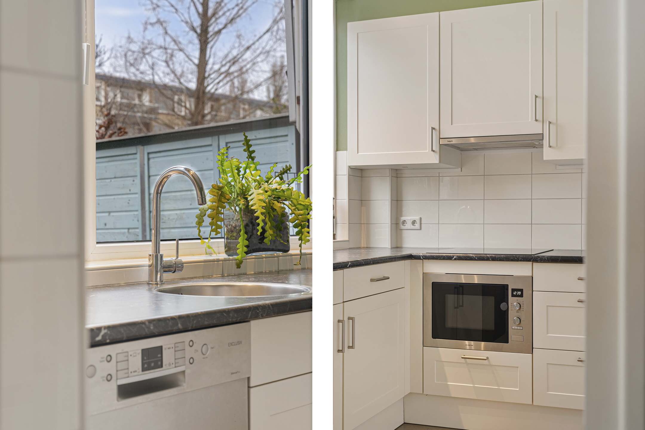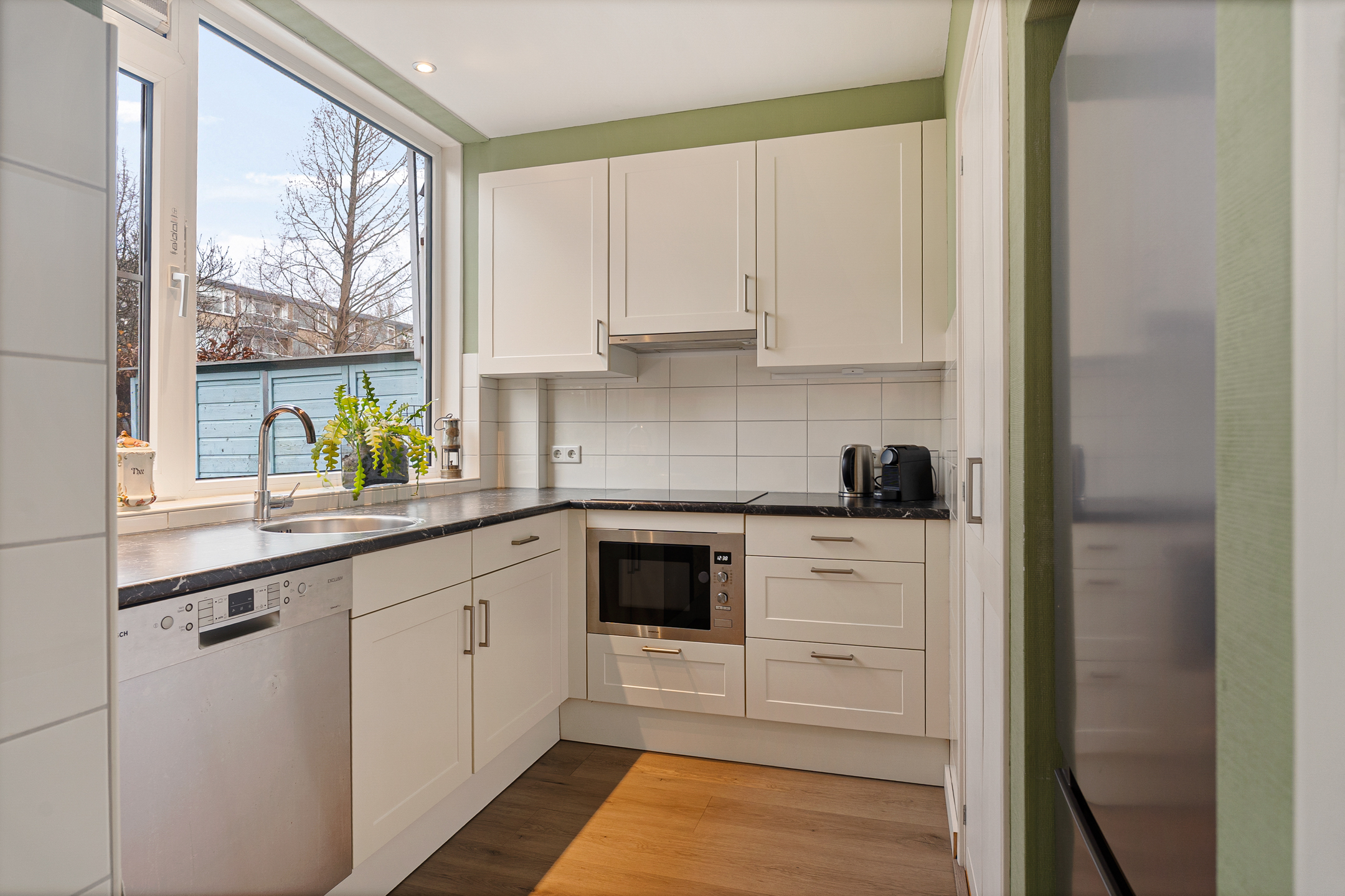 De open keuken staat in verbinding met de woonkamer en is praktisch ingedeeld in een L-vorm. Je beschikt over een vierpits gaskookplaat, afzuigkap, combi-magnetron, vaatwasser en een hoekkast met draaiplateau. De 60-liter boiler is keurig weggewerkt achter de keukenkasten en spotjes in het plafond zorgen voor extra sfeer. In een nis staat een losse koel-/vriescombinatie die ter overname is.