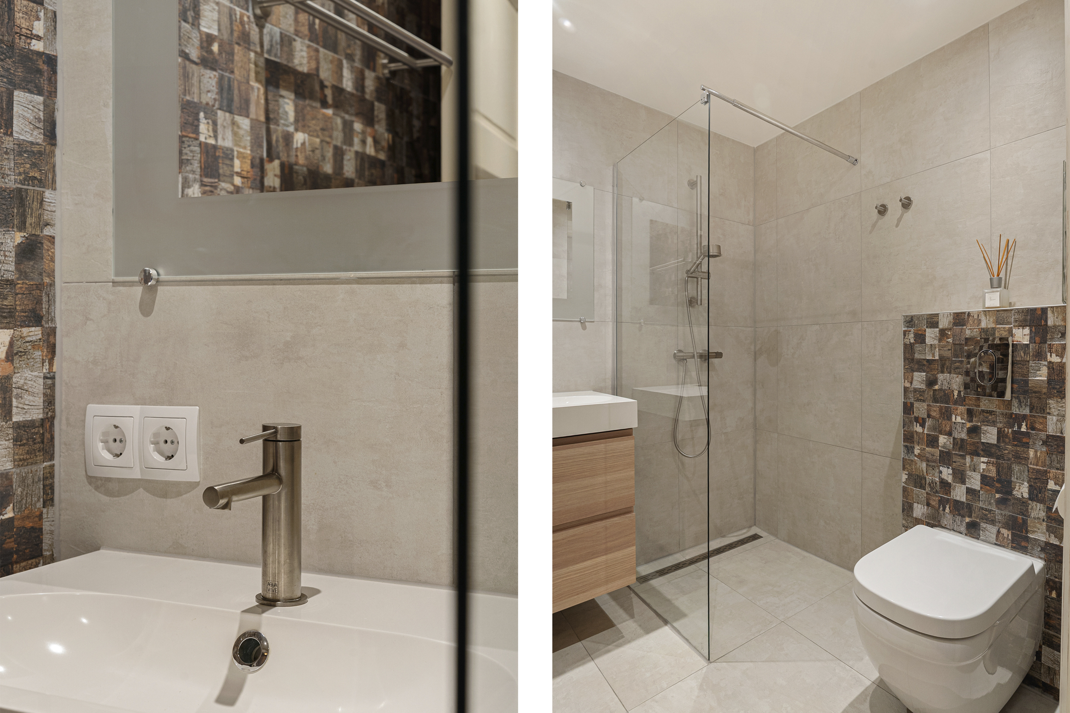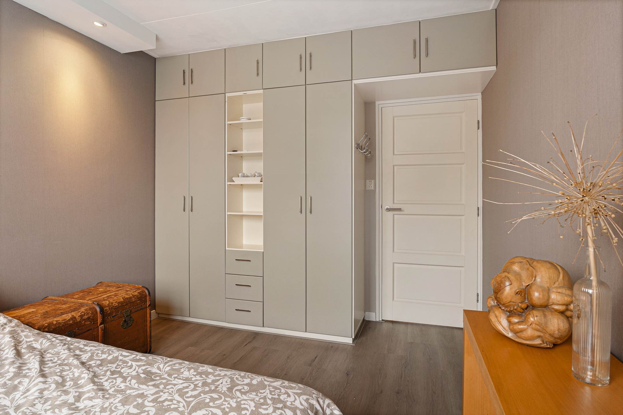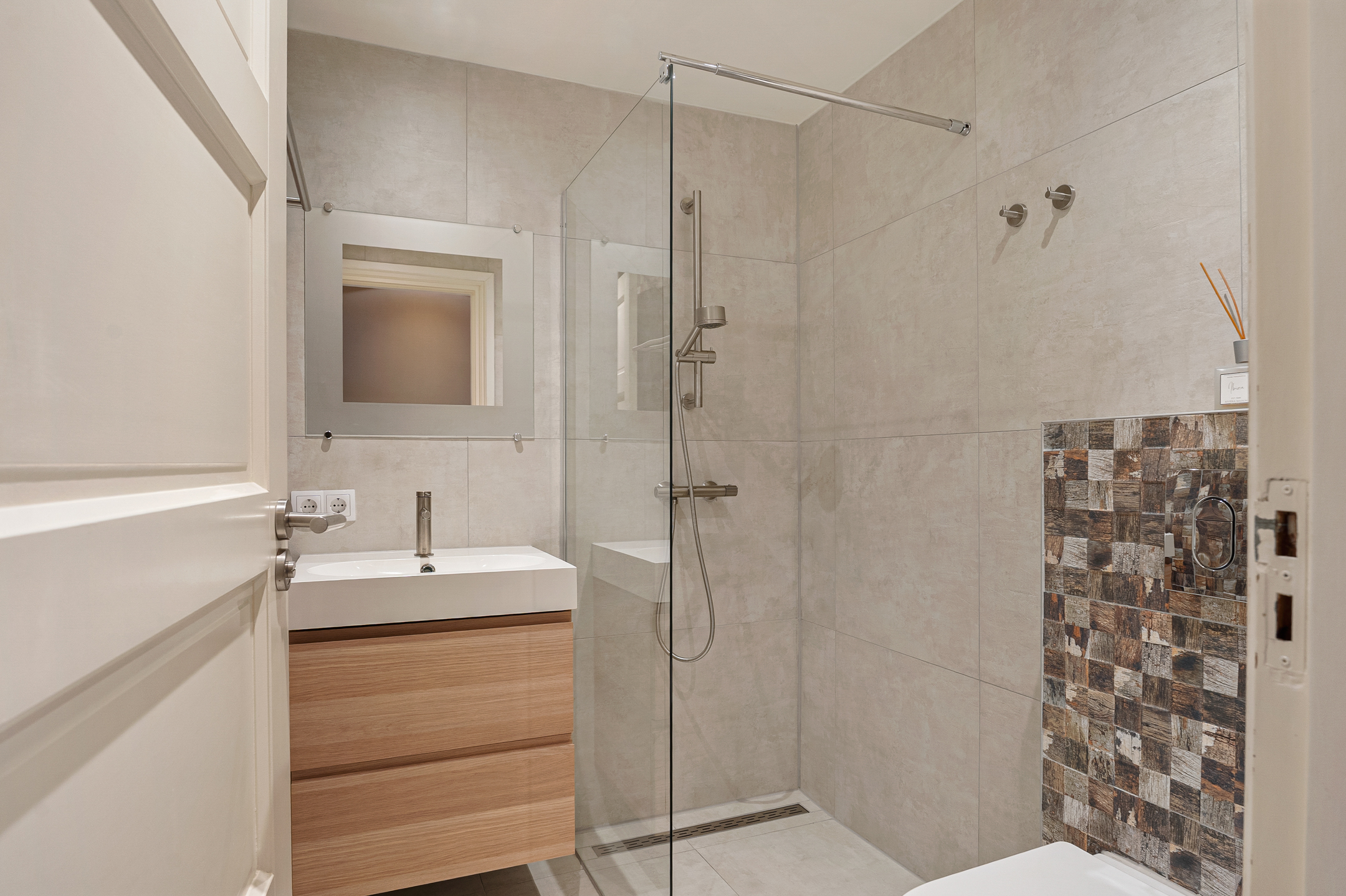 Vanuit de woonkamer bereik je de tussengang naar de slaapkamer en badkamer. De slaapkamer ligt aan de voorzijde en is ingericht met een ruime, op maat gemaakte kledingkast. Voor extra verduistering en isolatie is een elektrisch rolluik geplaatst. De badkamer van 3,35 m² is volledig betegeld en voorzien van een douchecabine, wastafel en toilet.