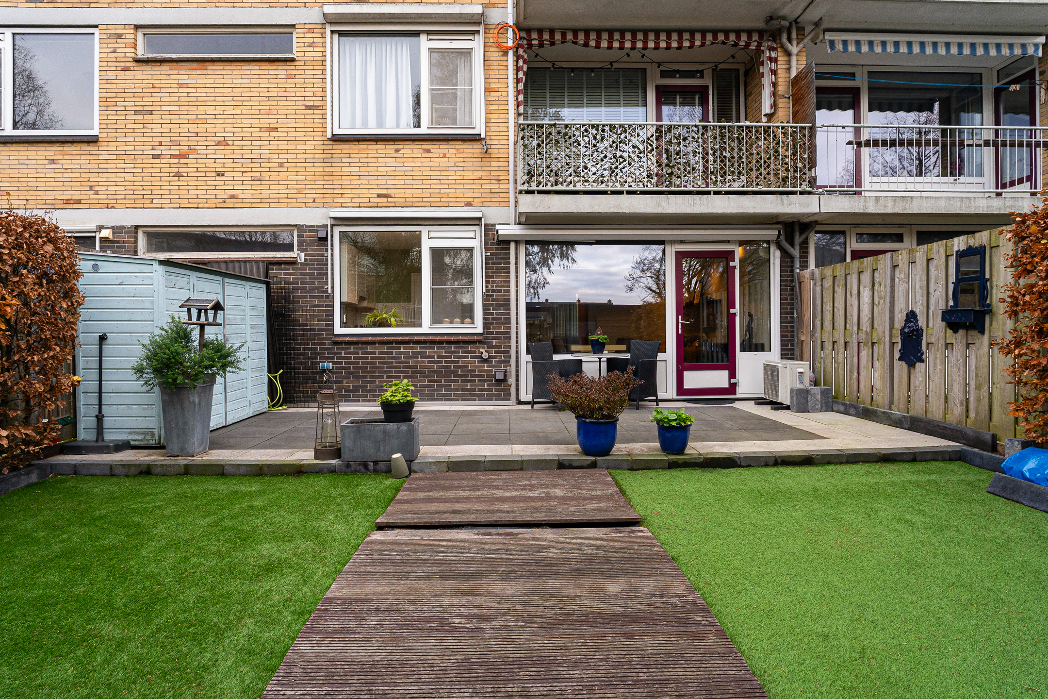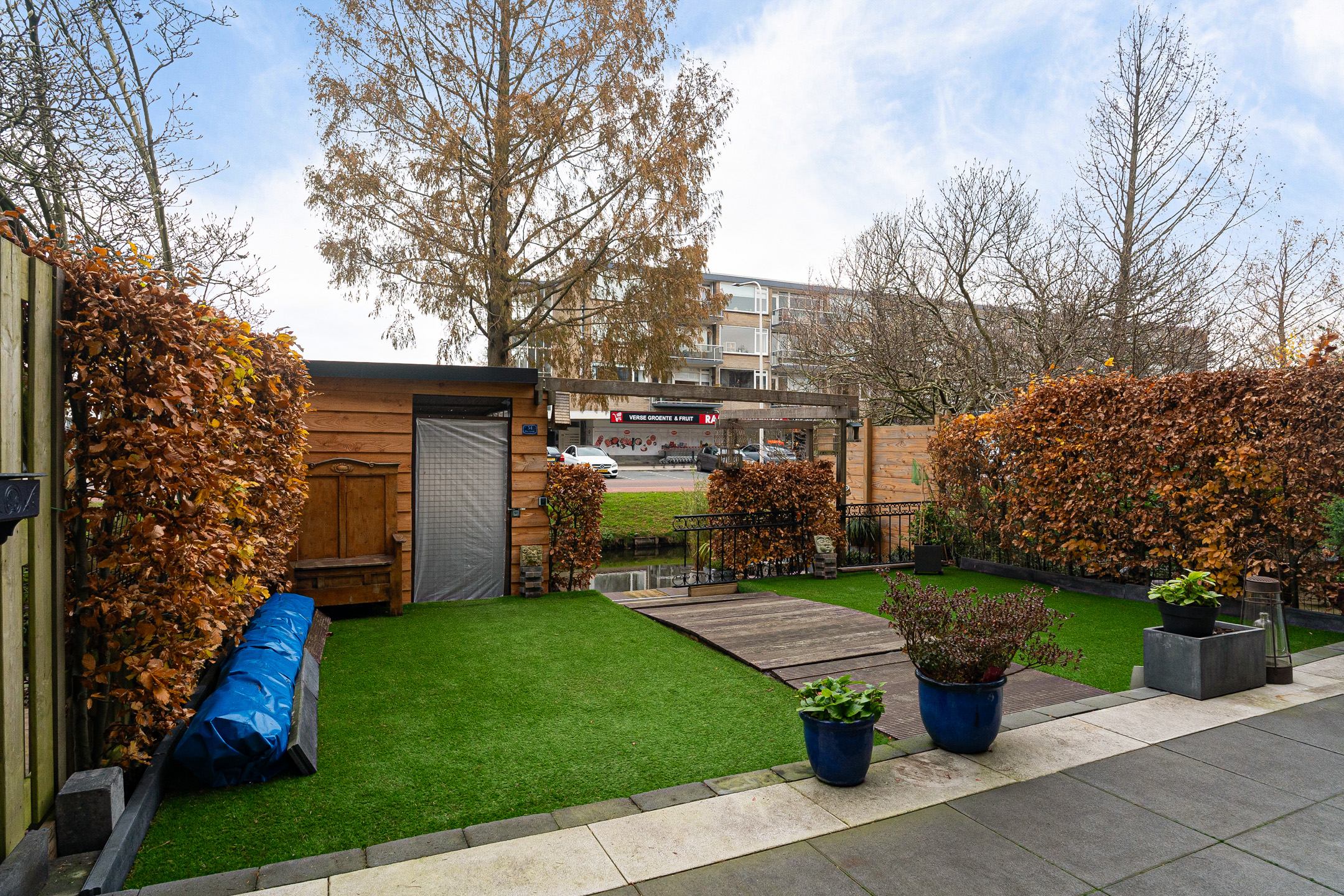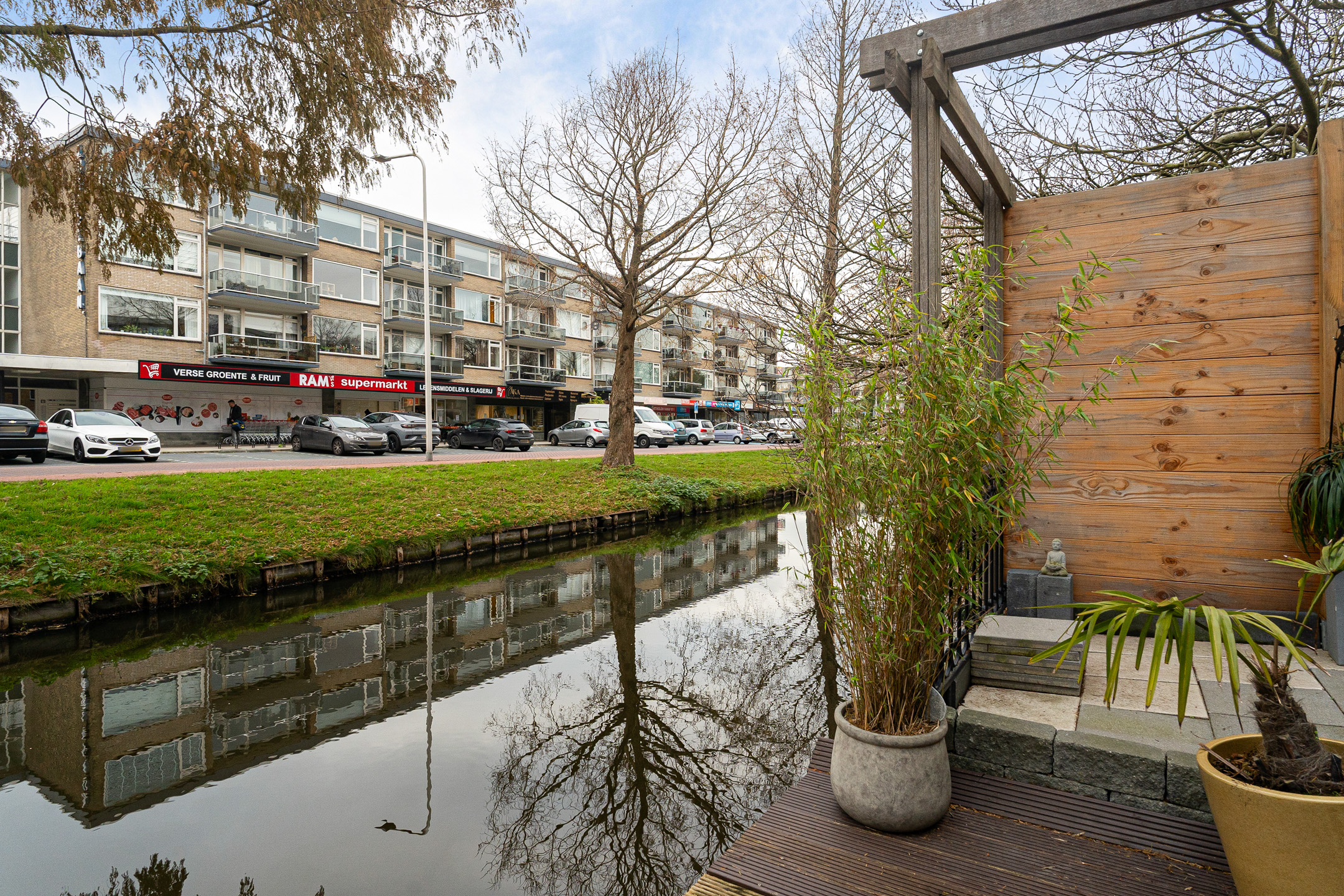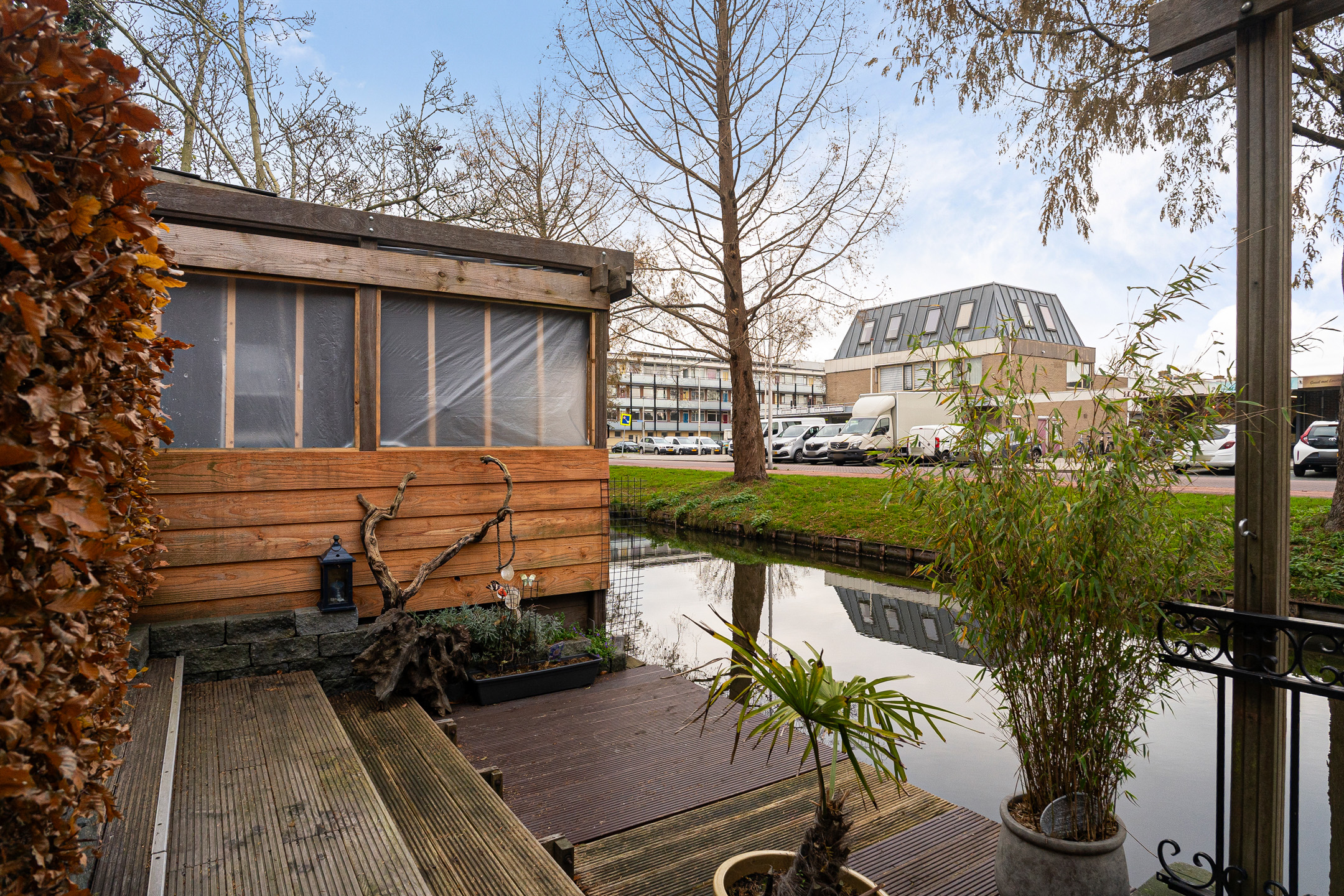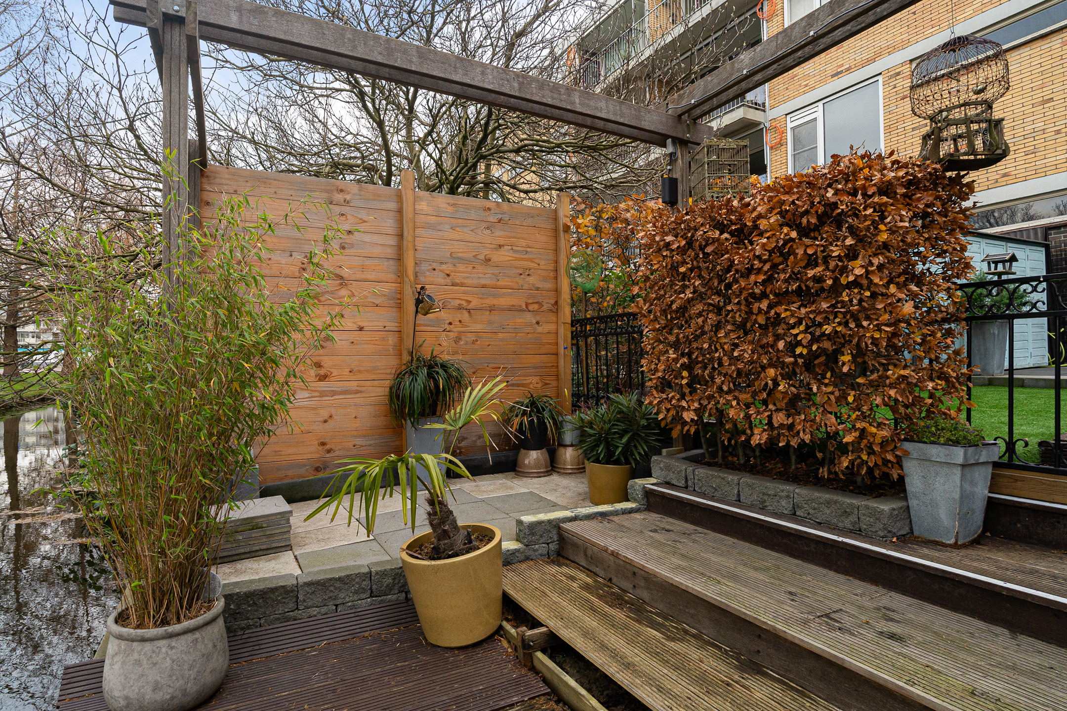 De zonnige tuin op het westen is maar liefst 11 meter diep en loopt terrasvormig af naar de waterkant. Het grote terras en de vlonder zijn in 2015 aangelegd; het kunstgras in het middendeel is vernieuwd in 2020. Aan de achtergevel hangen twee zonneschermen. De tuin beschikt verder over elektra, een buitenkraan en een tuinkast. Alles verkeert in verzorgde staat.