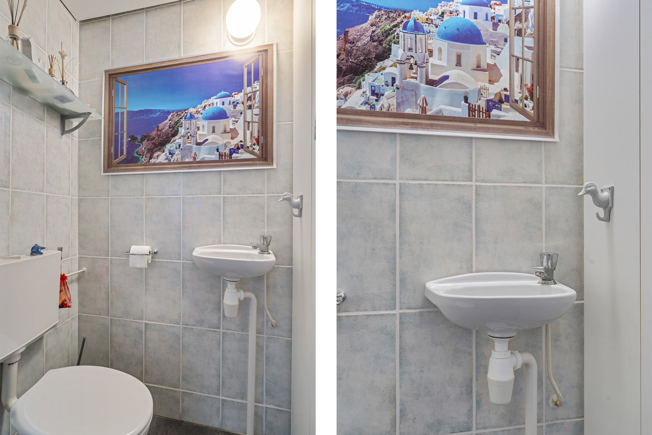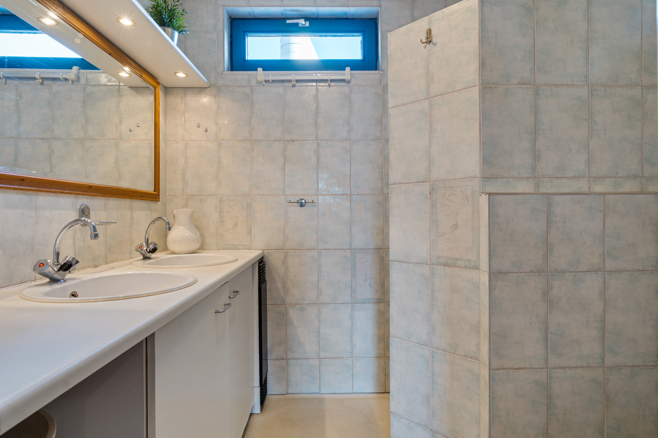 De badkamer aan de voorzijde is netjes en praktisch ingericht met een inloopdouche, toilet en een wastafelmeubel met dubbele waskommen.