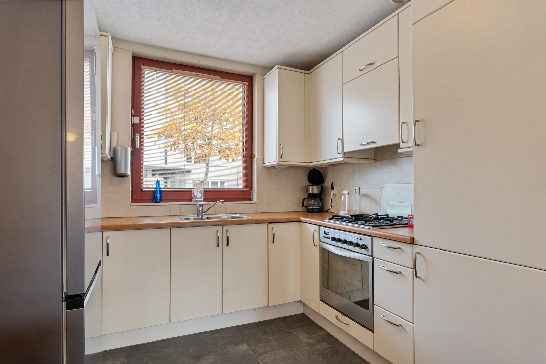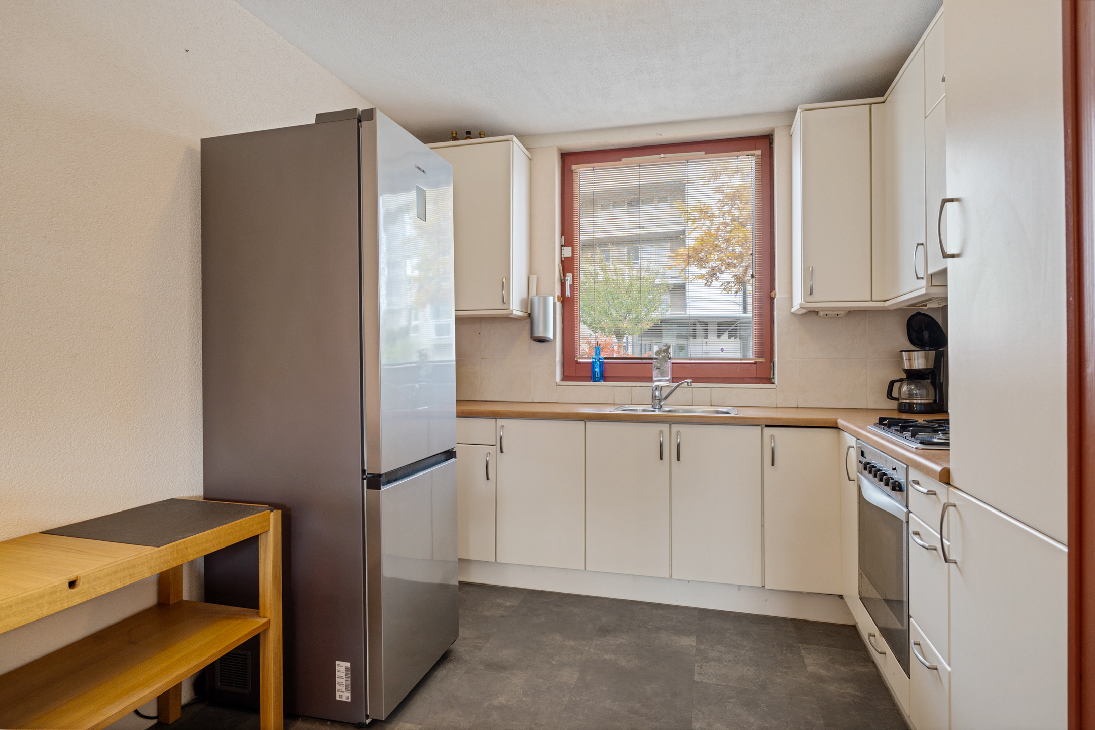 De lichte woonkamer bevindt zich aan de achterzijde en is afgewerkt met PVC-tegels mét vloerverwarming, wat zorgt voor een comfortabele en moderne uitstraling. Aan de voorzijde ligt de open keuken, uitgerust met diverse inbouwapparatuur.