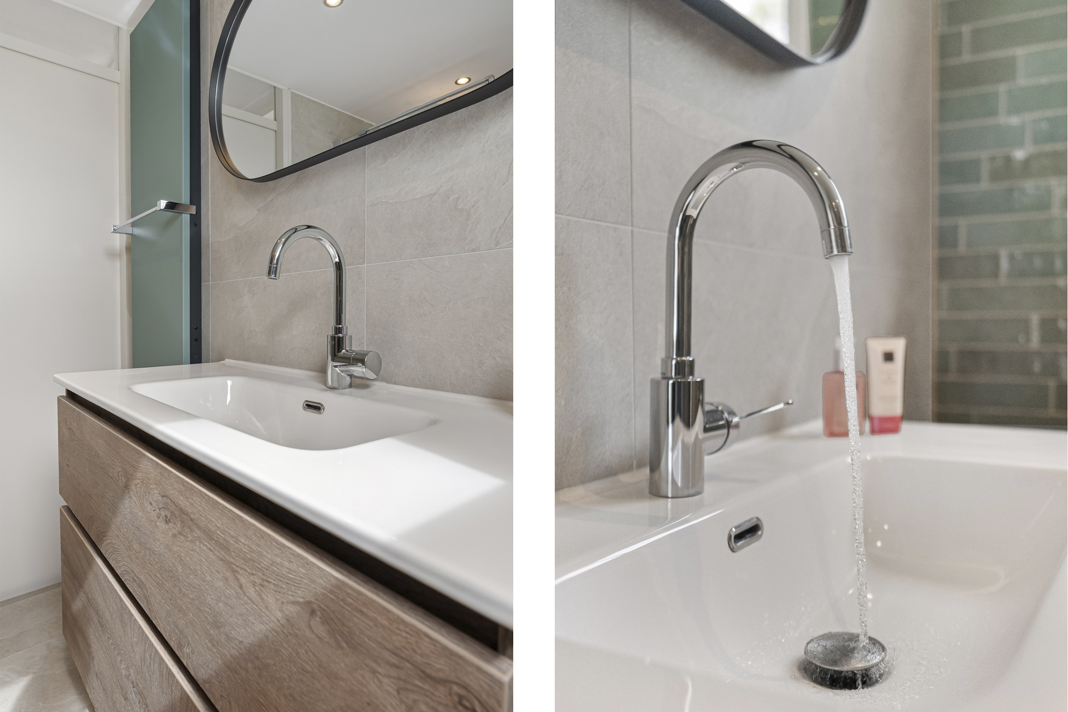 De badkamer is in 2023 vernieuwd en modern uitgevoerd met een inloopdouche, toilet en een stijlvol wastafelmeubel. De fraaie wandtegels en verzorgde afwerking geven het geheel een eigentijdse uitstraling.