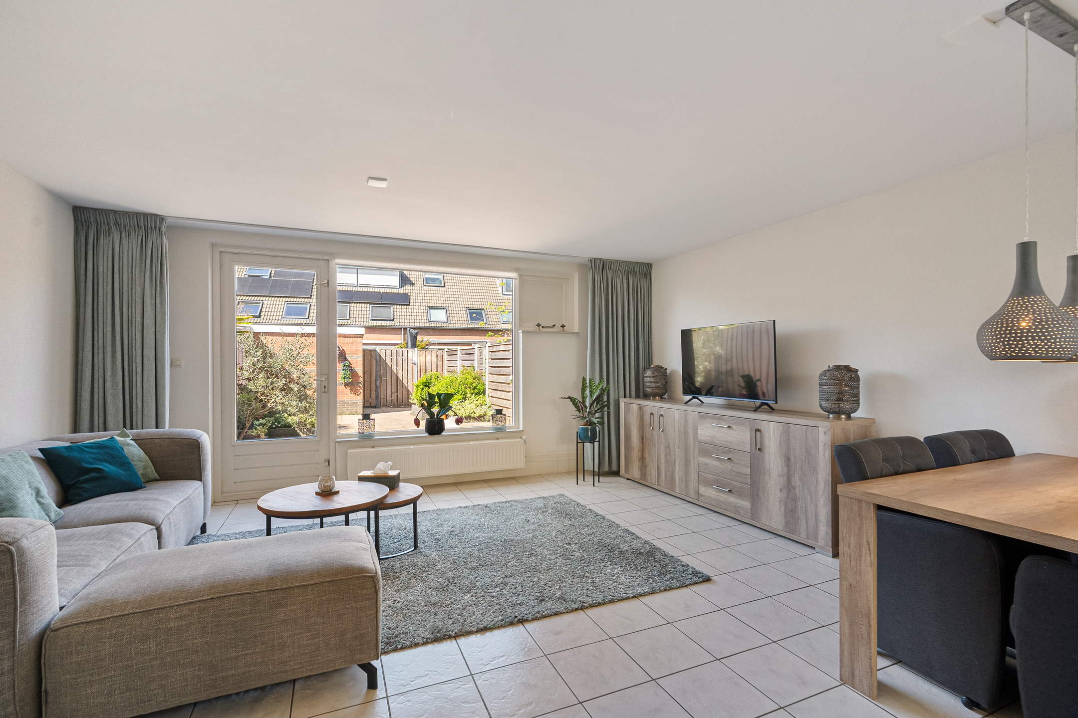 De brede woonkamer bevindt zich aan de achterzijde en biedt een prettig uitzicht op de tuin.
