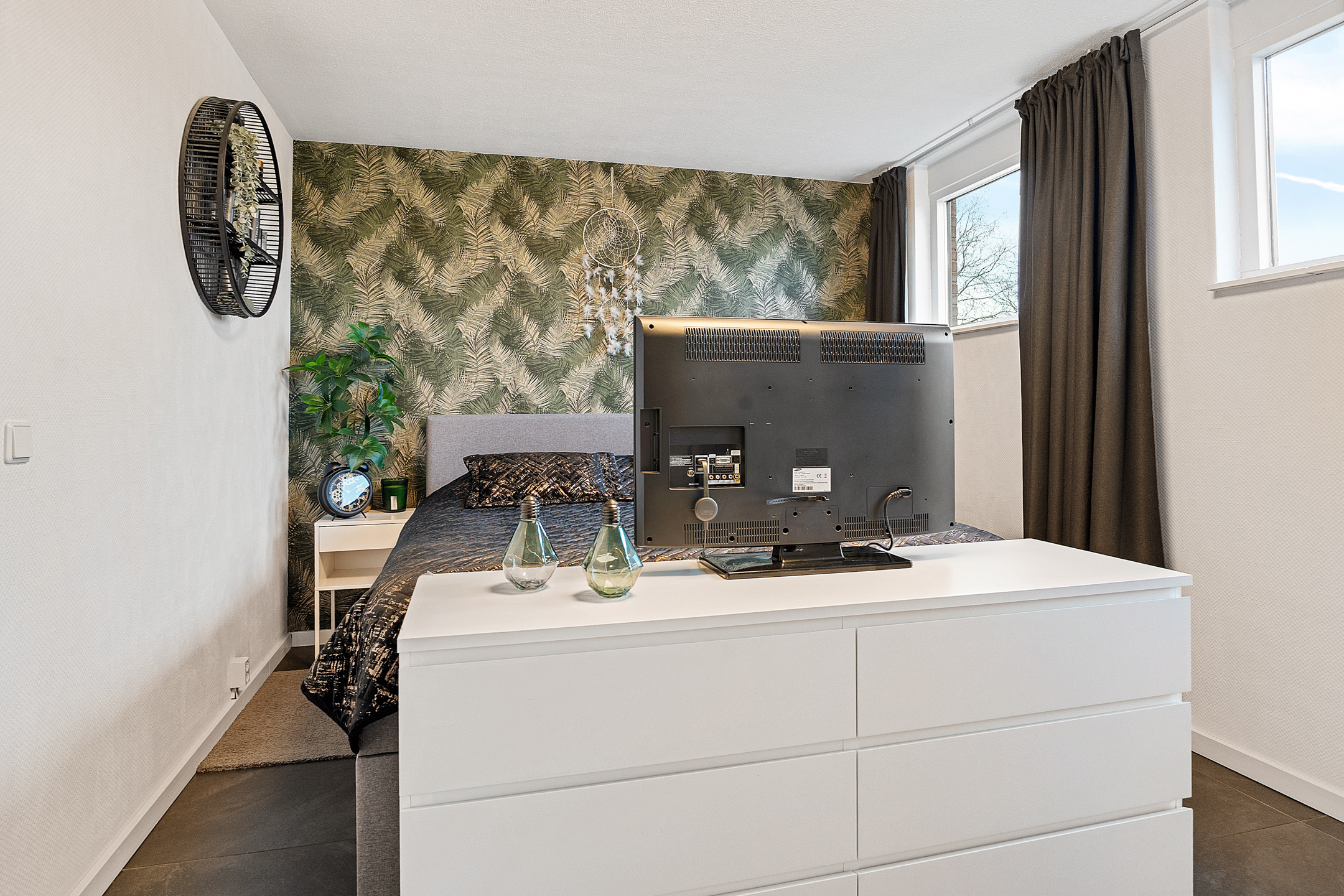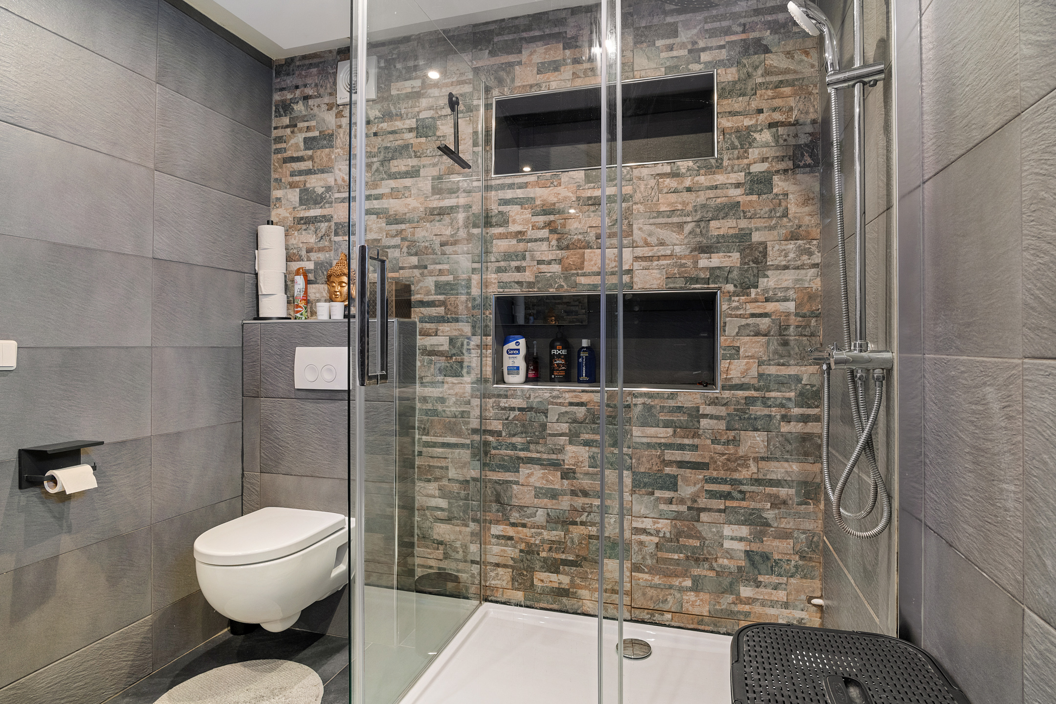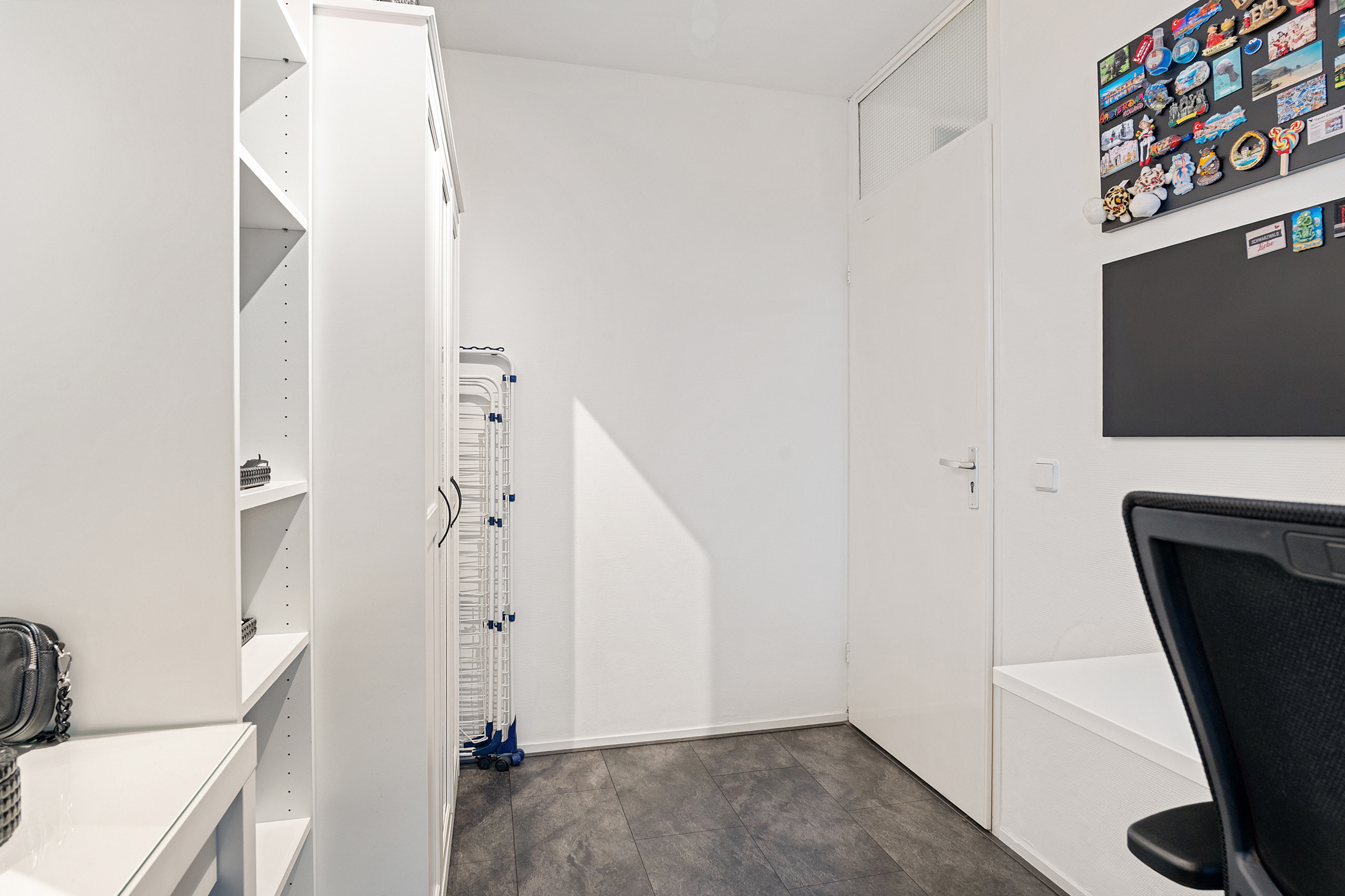 De badkamer is stijlvol betegeld en uitgerust met een moderne inloopdouche en hangend toilet. Er zijn twee slaapkamers aanwezig, waarvan één uitstekend dienst kan doen als thuiskantoor of logeerkamer.