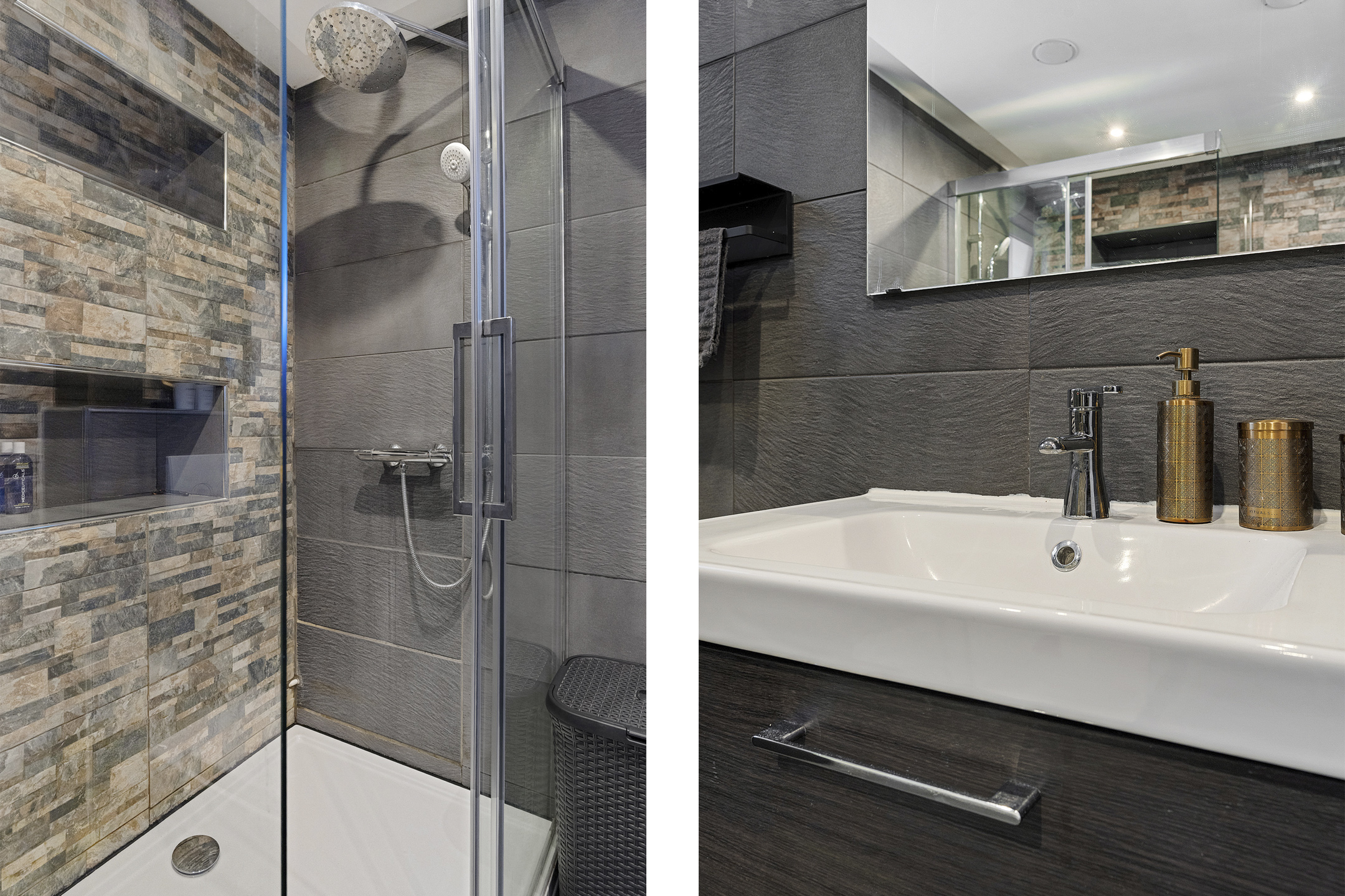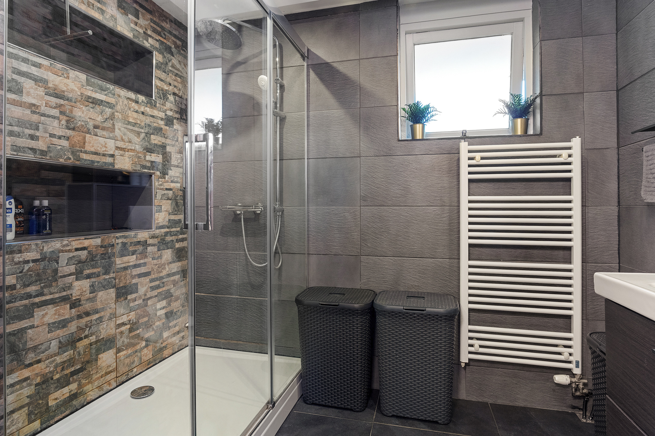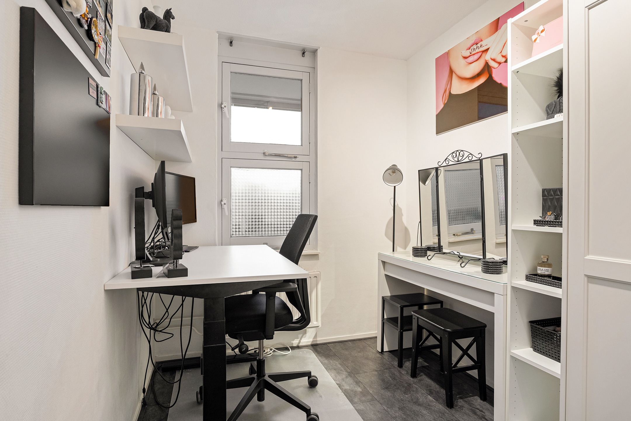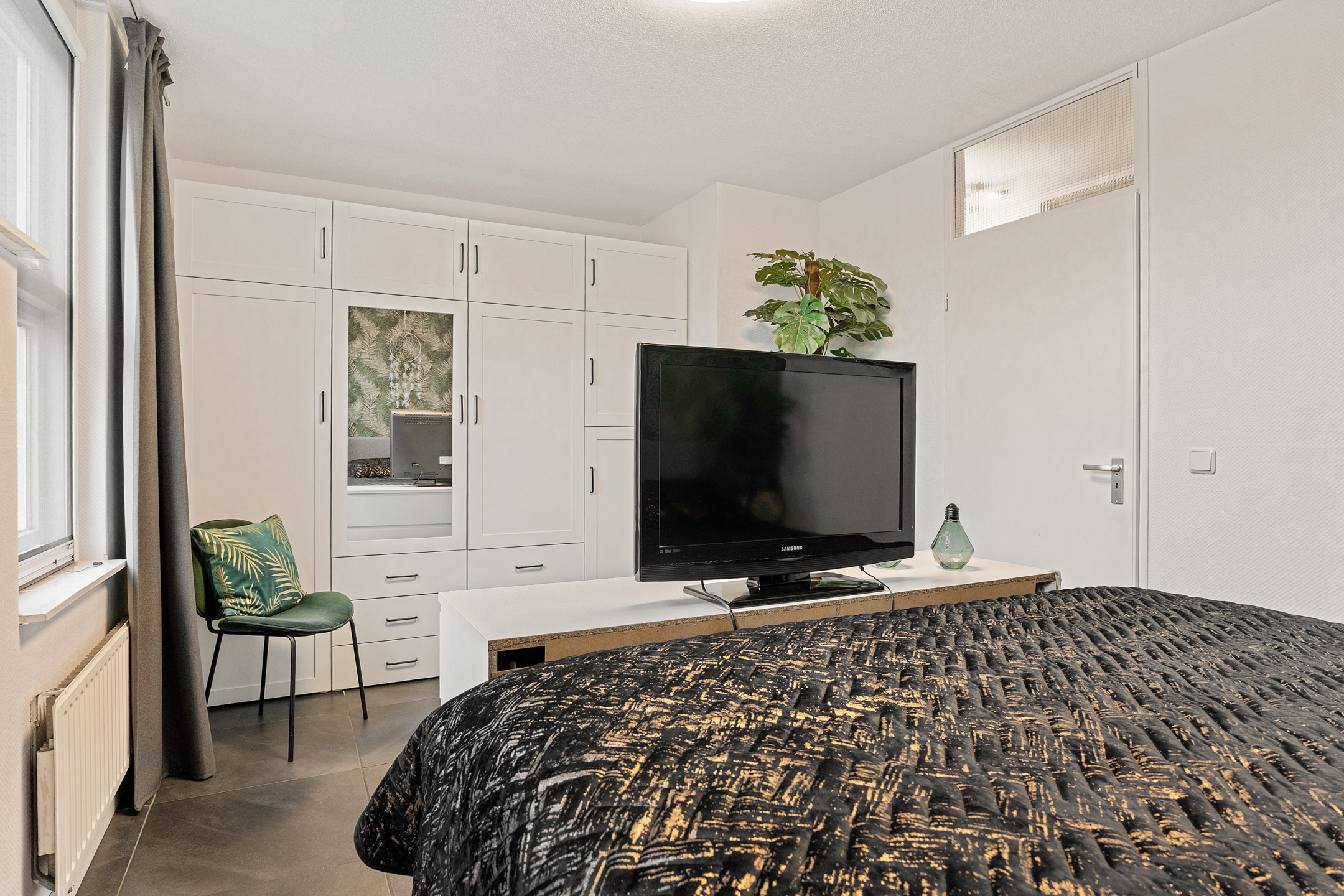 De badkamer is stijlvol betegeld en uitgerust met een moderne inloopdouche en hangend toilet. Er zijn twee slaapkamers aanwezig, waarvan één uitstekend dienst kan doen als thuiskantoor of logeerkamer.