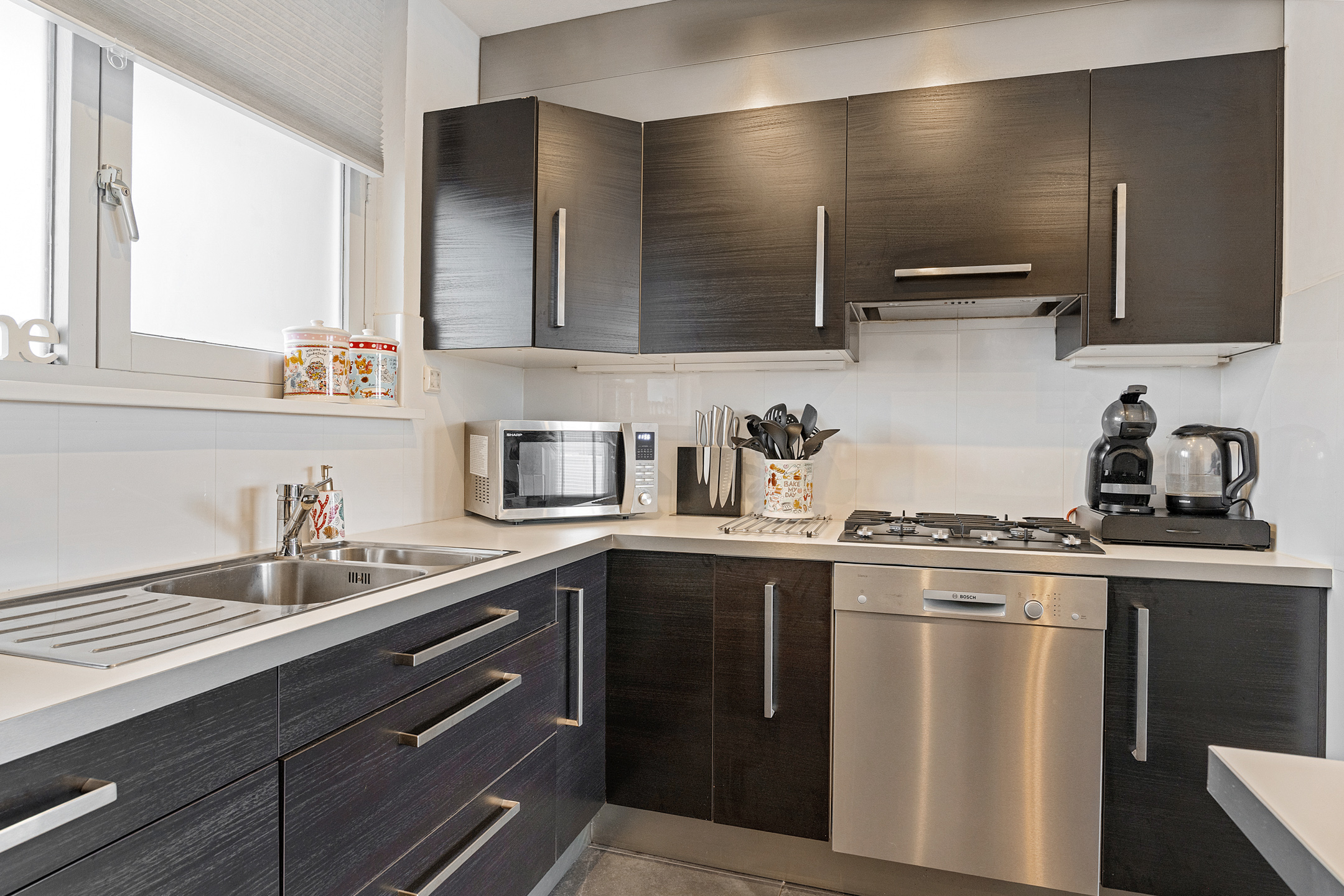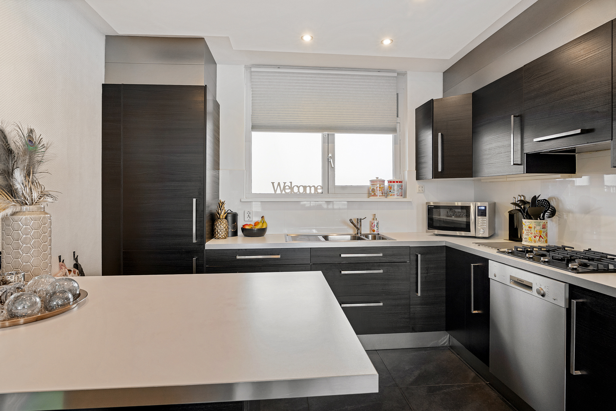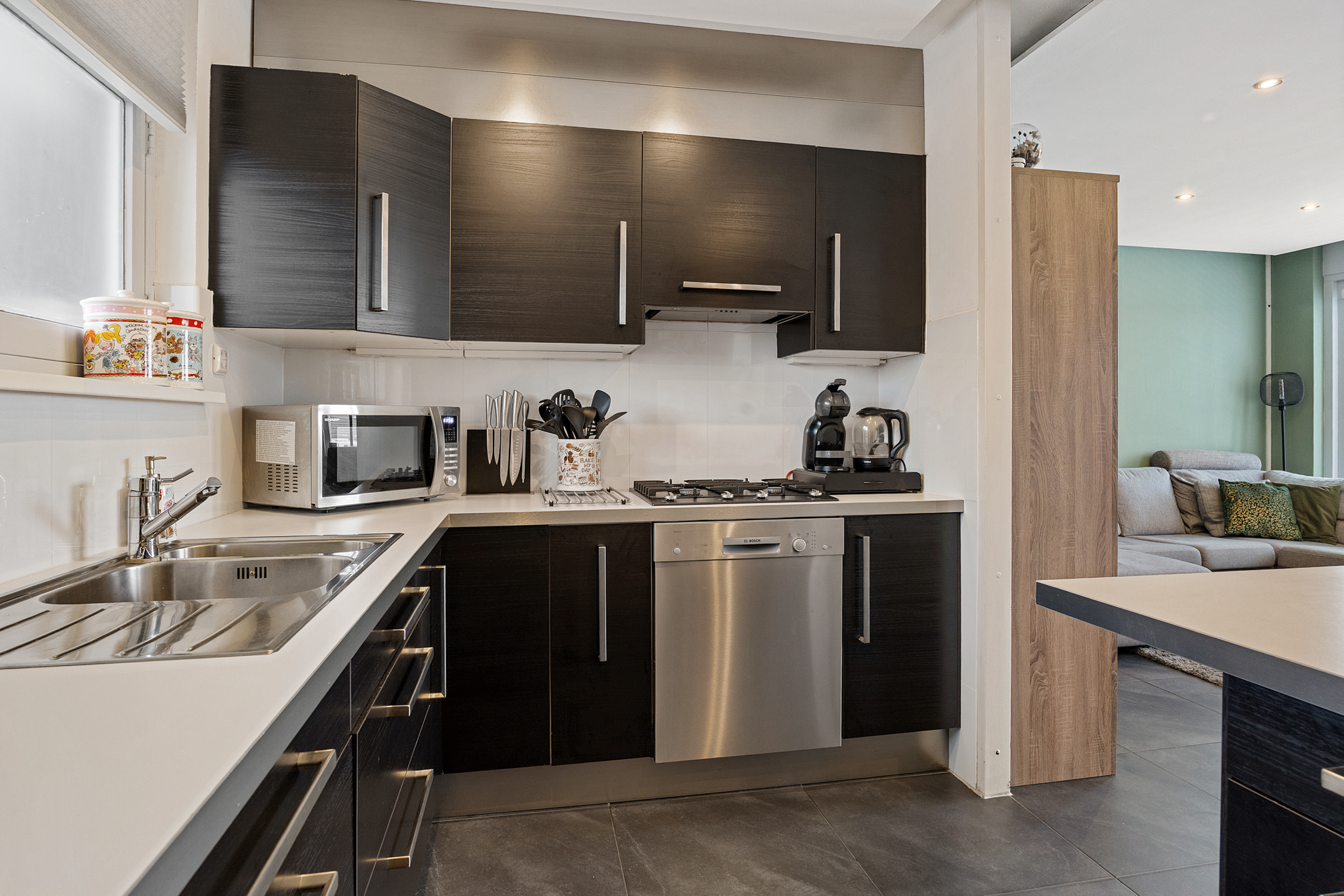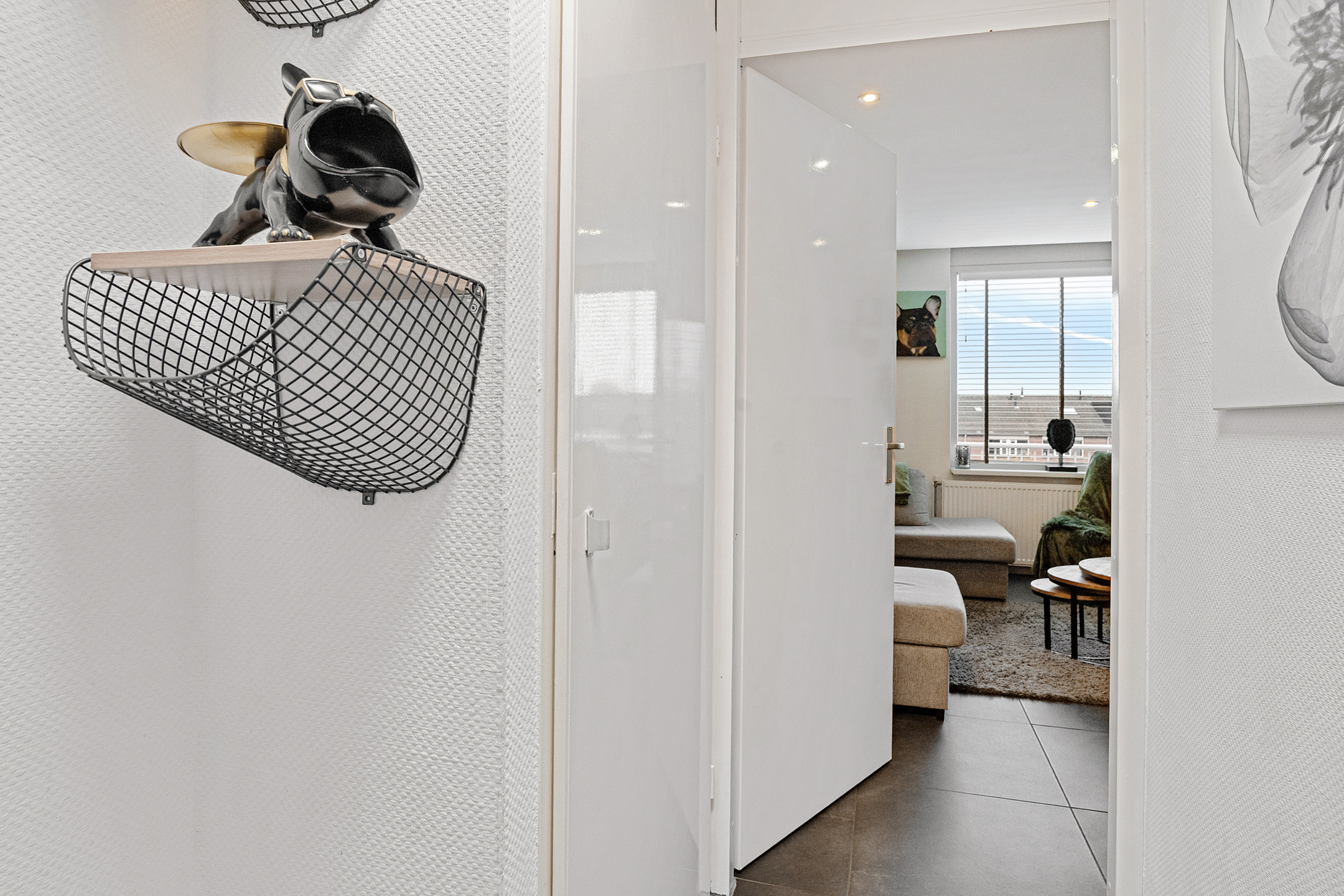 Je komt binnen via een nette entree met praktische bergkast en meterkast. De keuken is strak en modern, voorzien van inbouwapparatuur zoals een vaatwasser en gaskookplaat. De ruime woonkamer heeft grote raampartijen waardoor het daglicht rijkelijk binnenvalt en biedt direct toegang tot het balkon waar je ’s ochtends en ’s middags van de zon geniet.