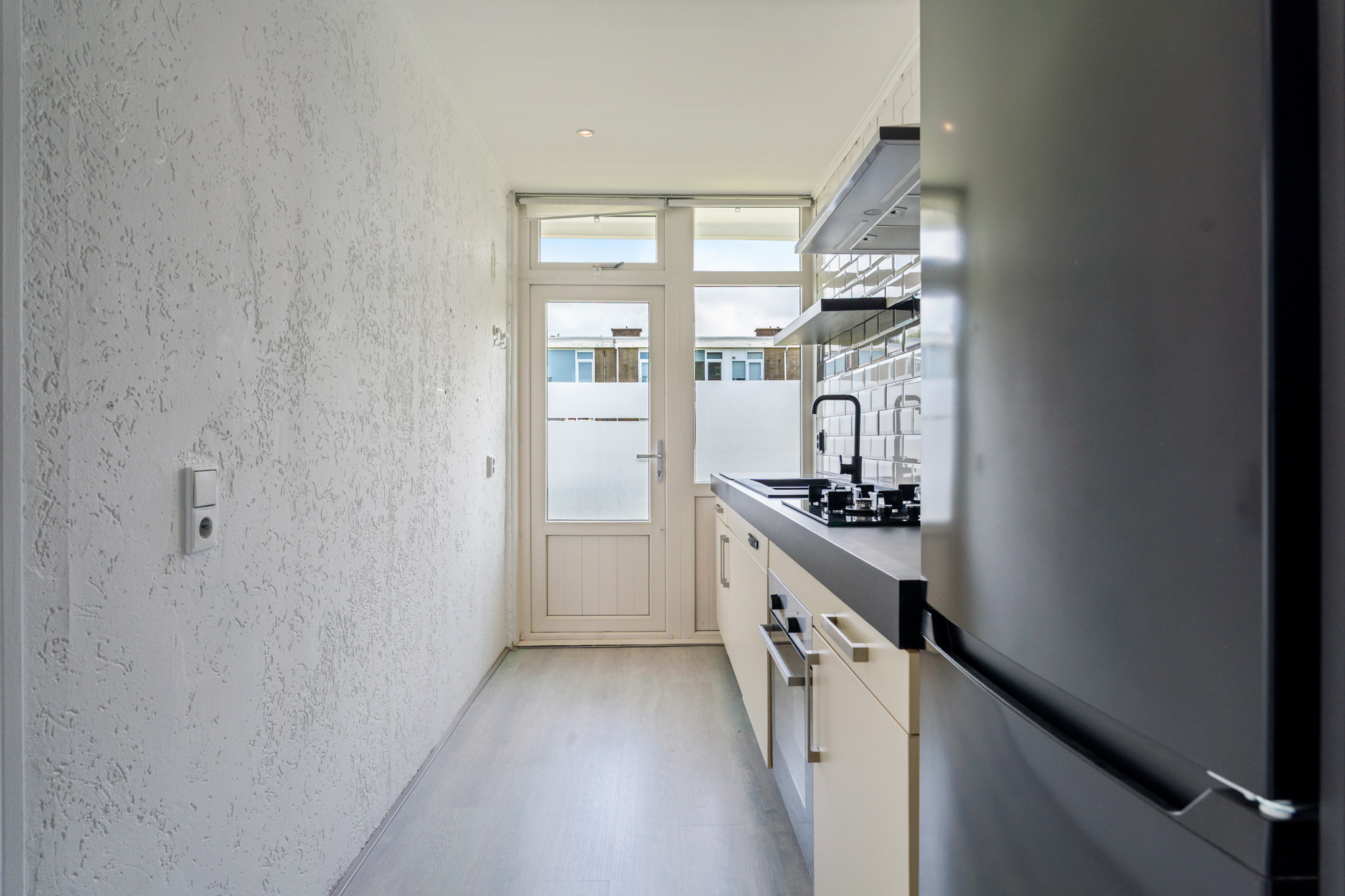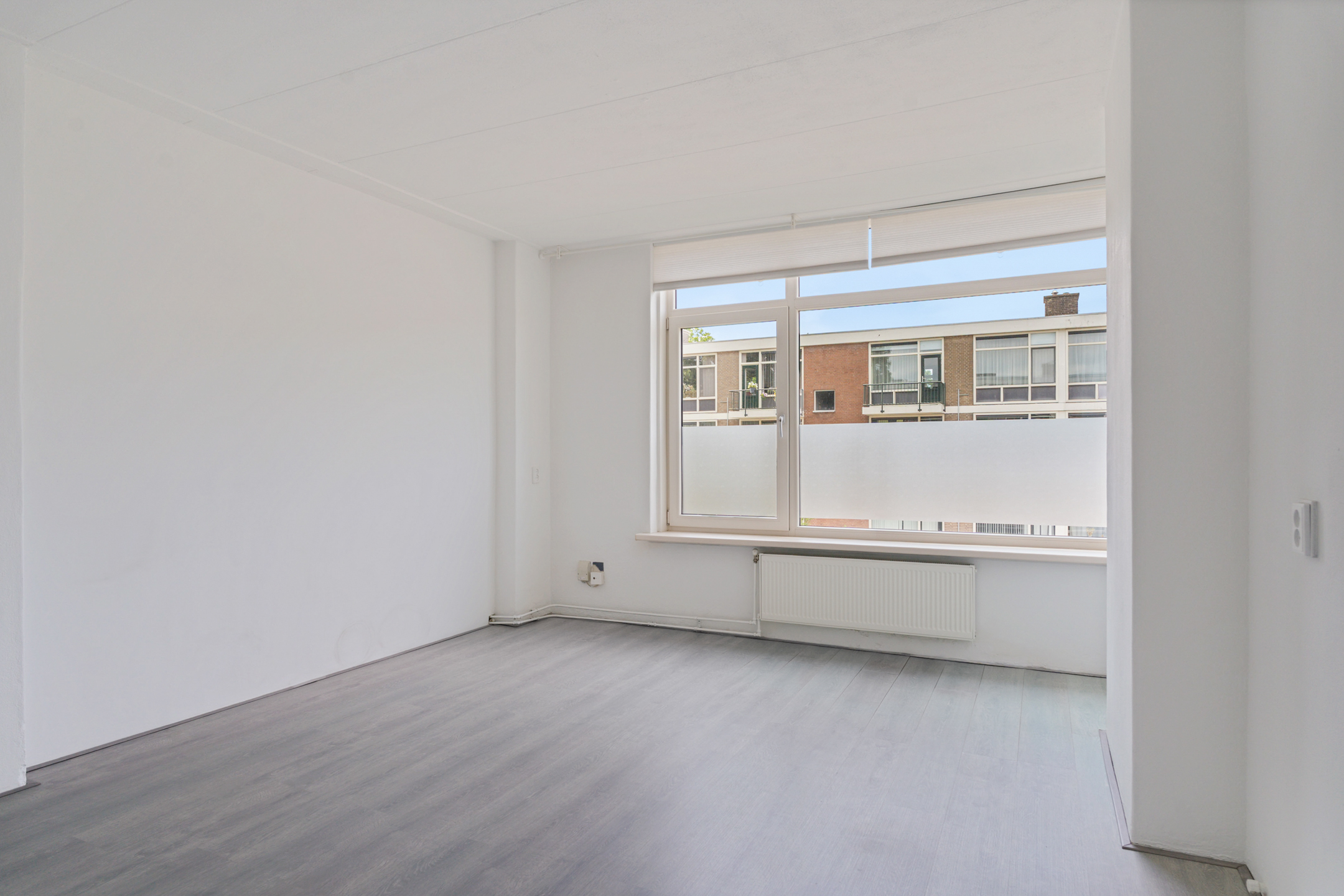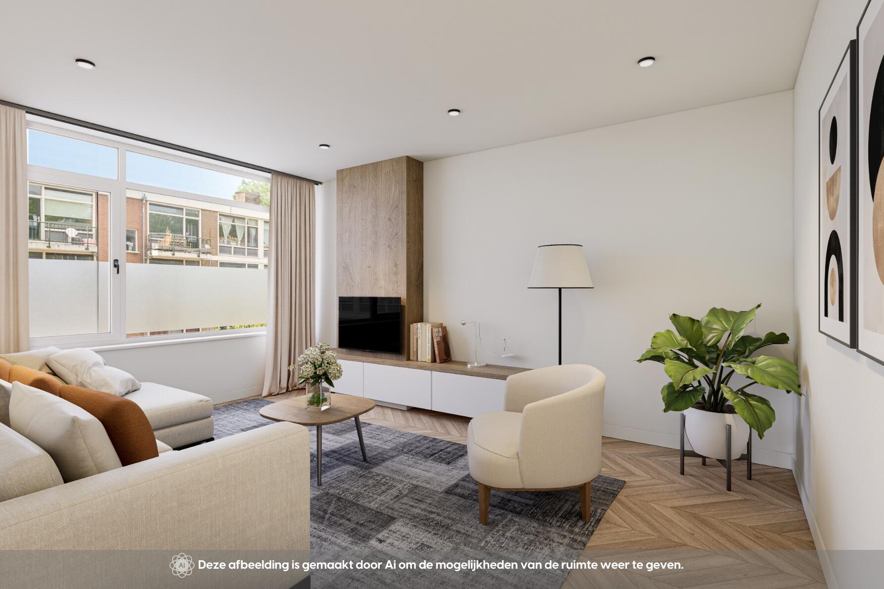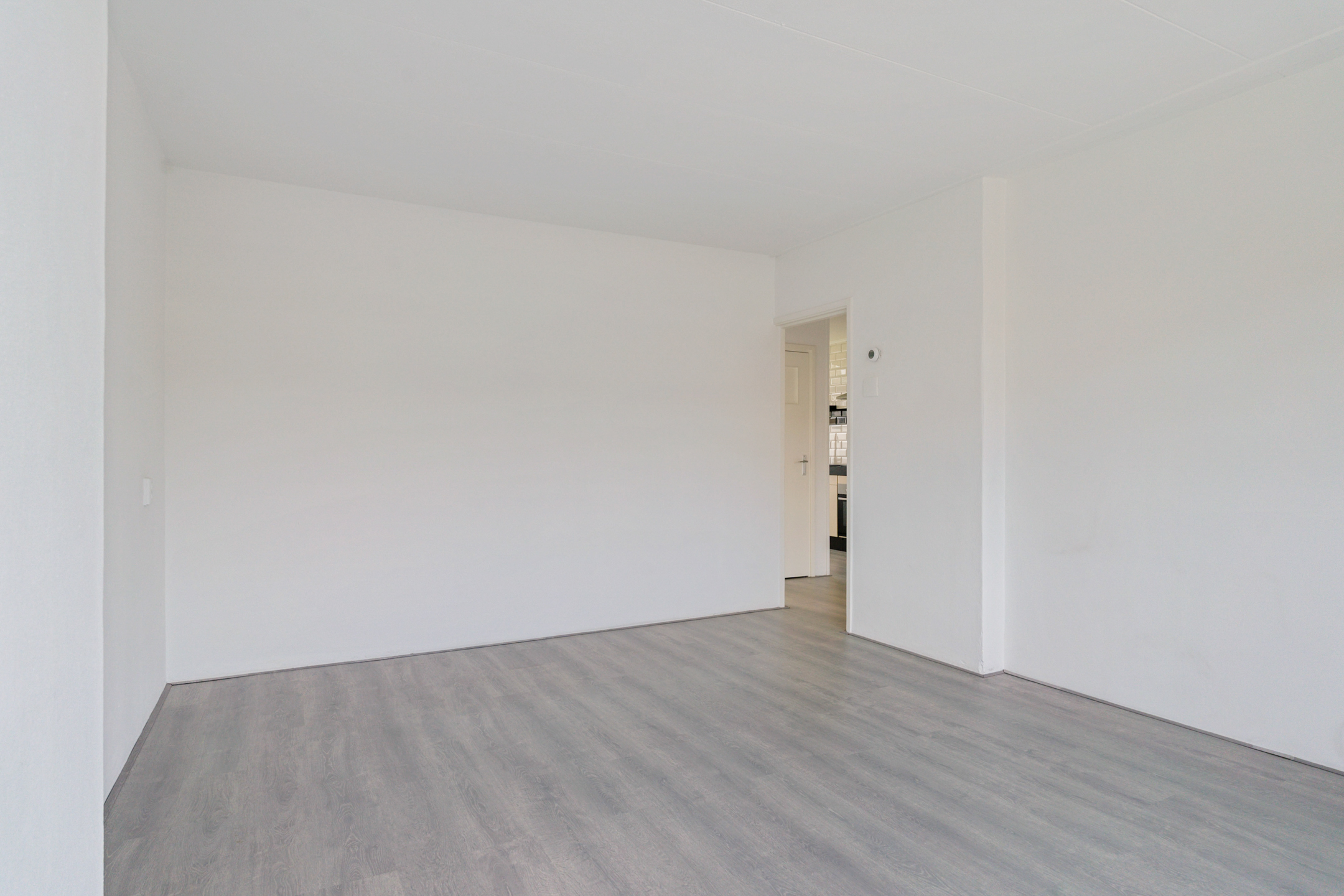 De woonkamer aan de achterzijde is ruim, licht en strak afgewerkt. De hele woning is voorzien van een moderne lichtgrijze laminaatvloer en gestucte wanden en plafonds.
