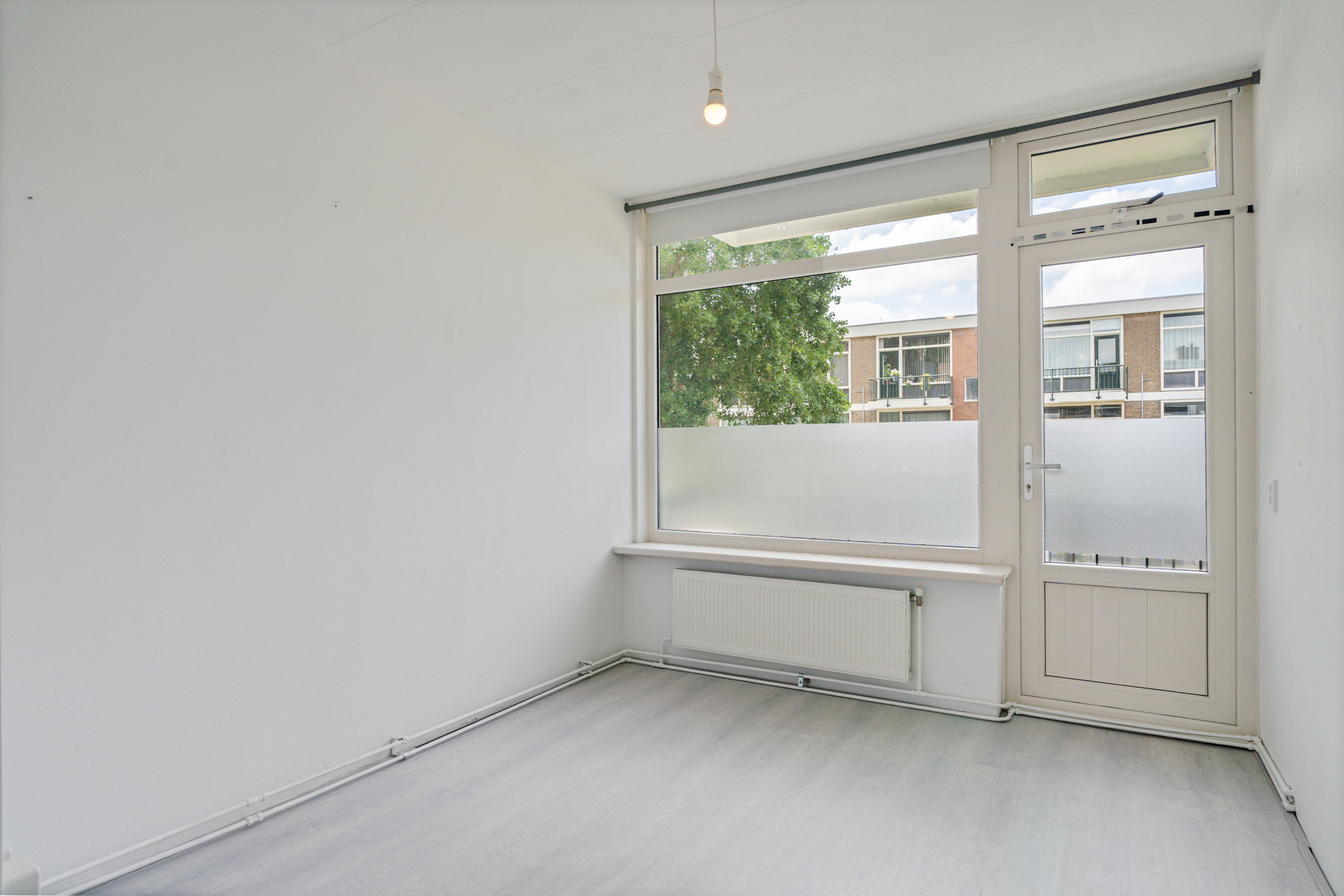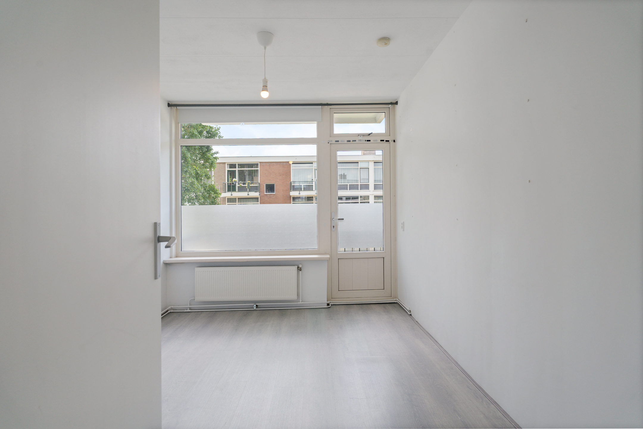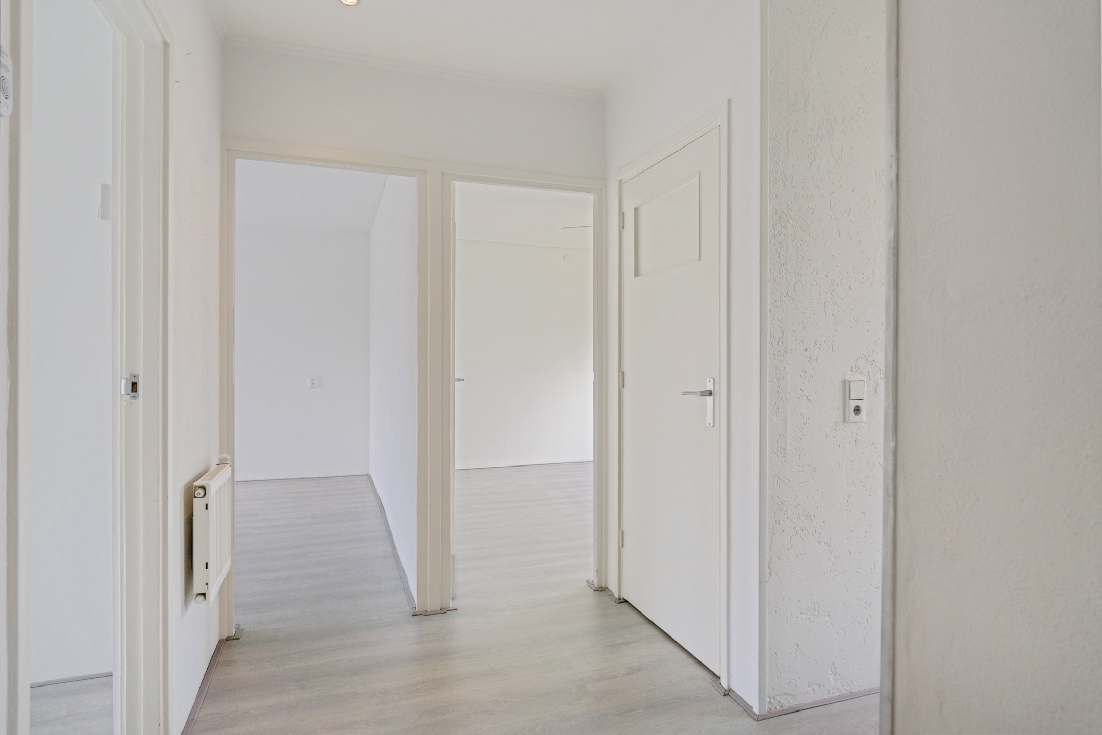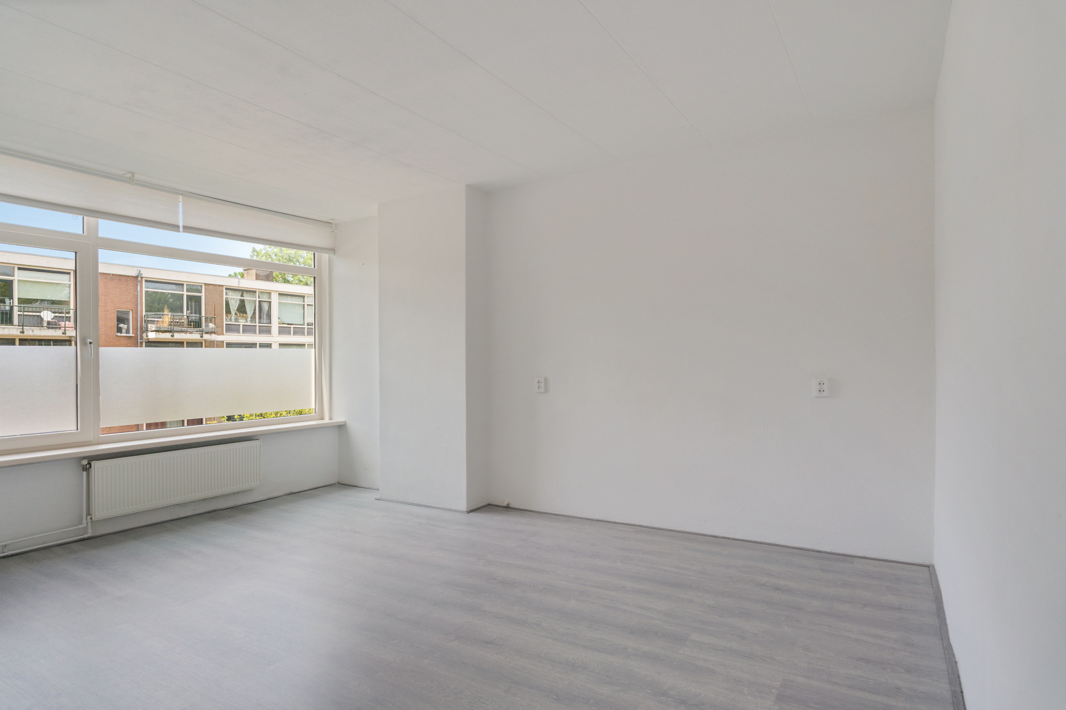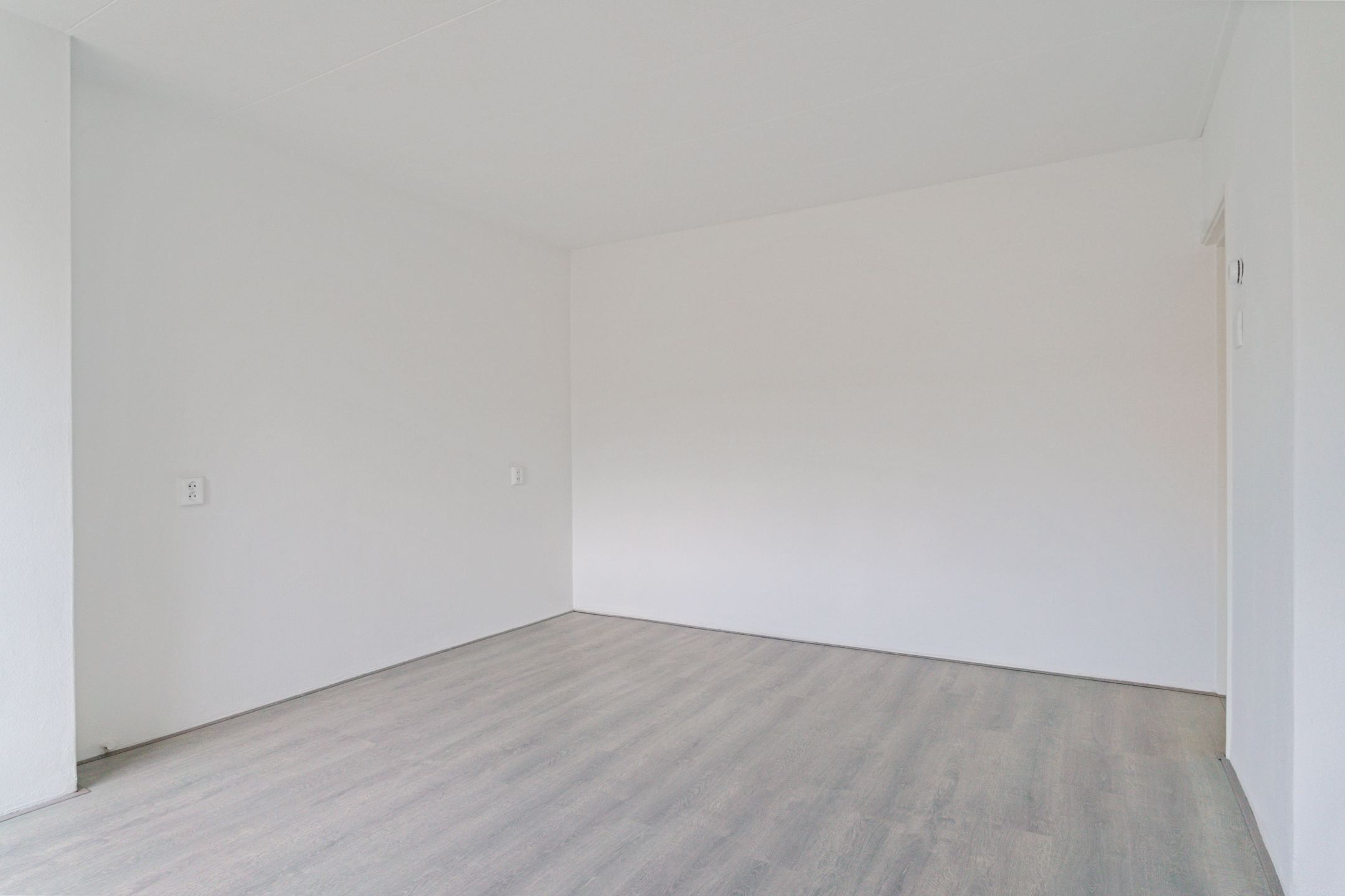 De woonkamer aan de achterzijde is ruim, licht en strak afgewerkt. De hele woning is voorzien van een moderne lichtgrijze laminaatvloer en gestucte wanden en plafonds.