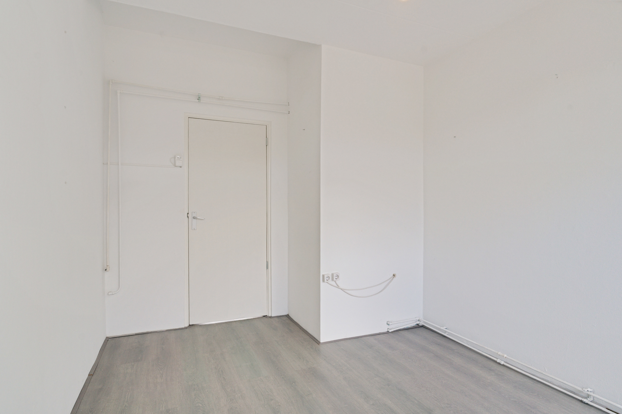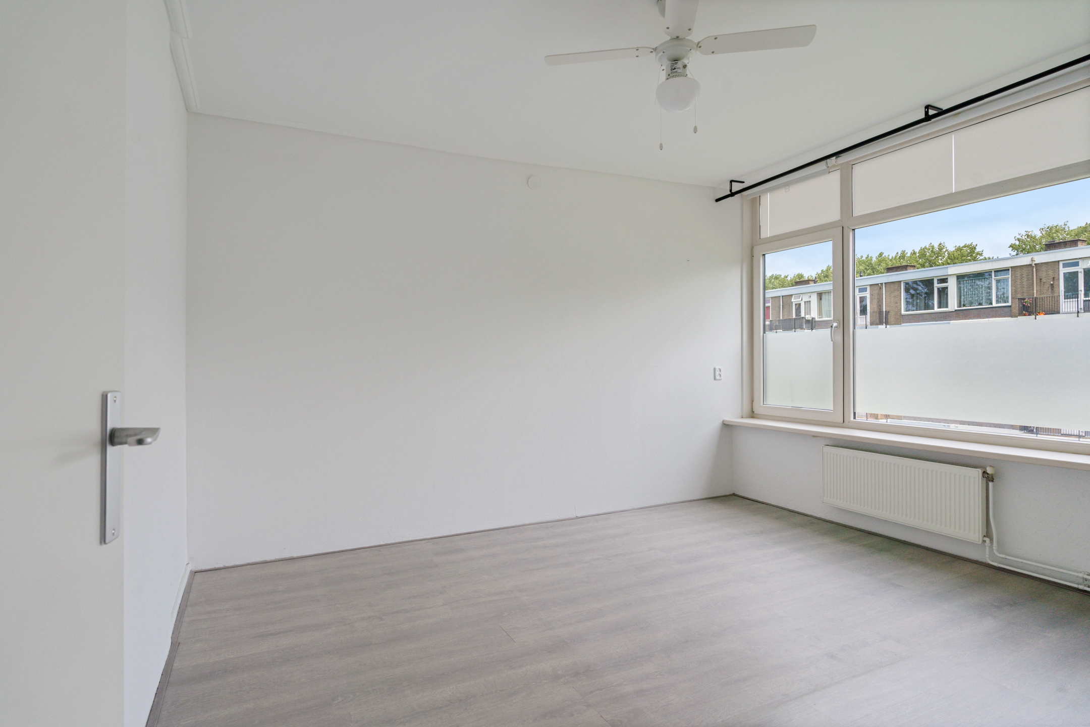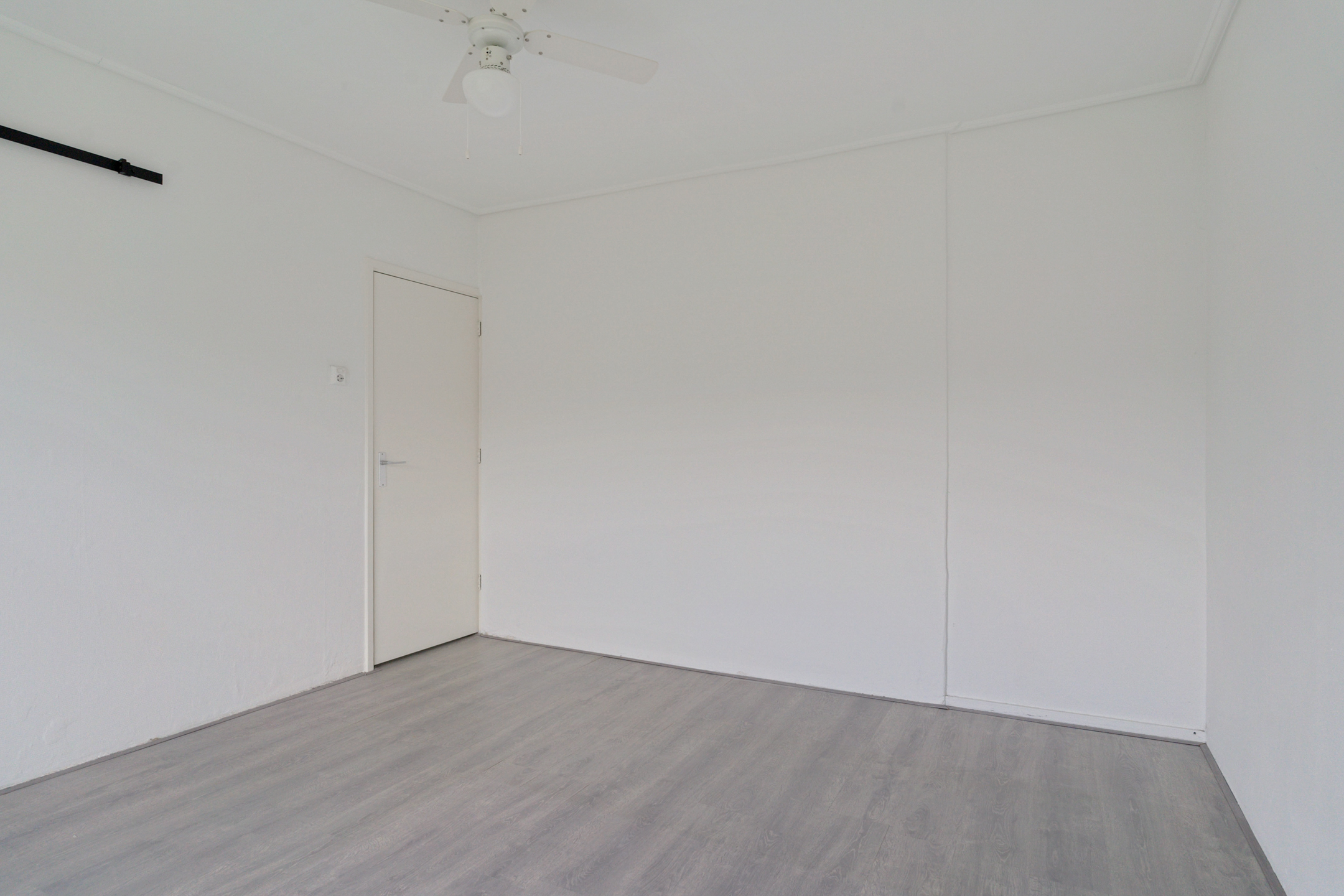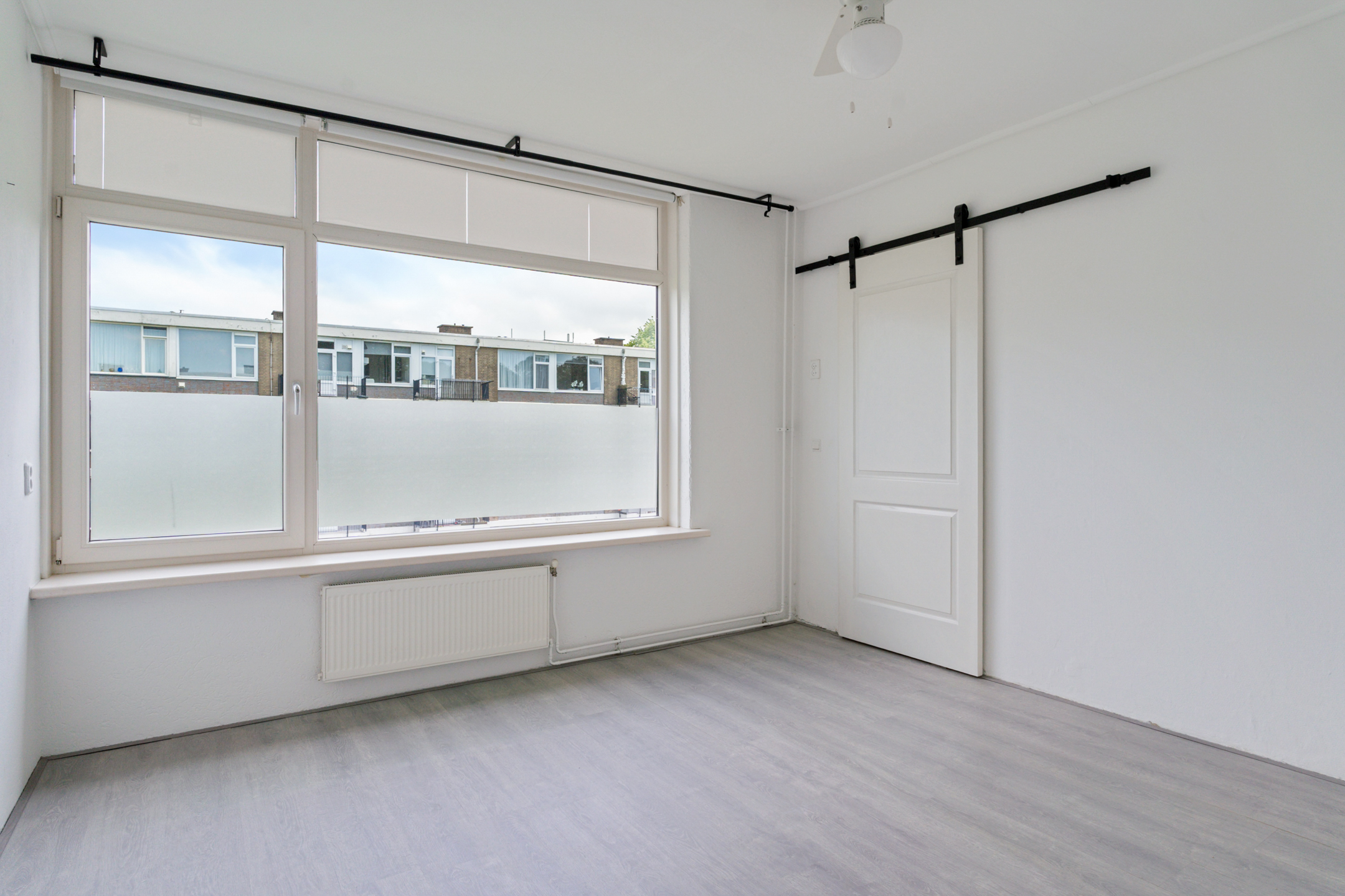 De woonkamer aan de achterzijde is ruim, licht en strak afgewerkt. De hele woning is voorzien van een moderne lichtgrijze laminaatvloer en gestucte wanden en plafonds.
