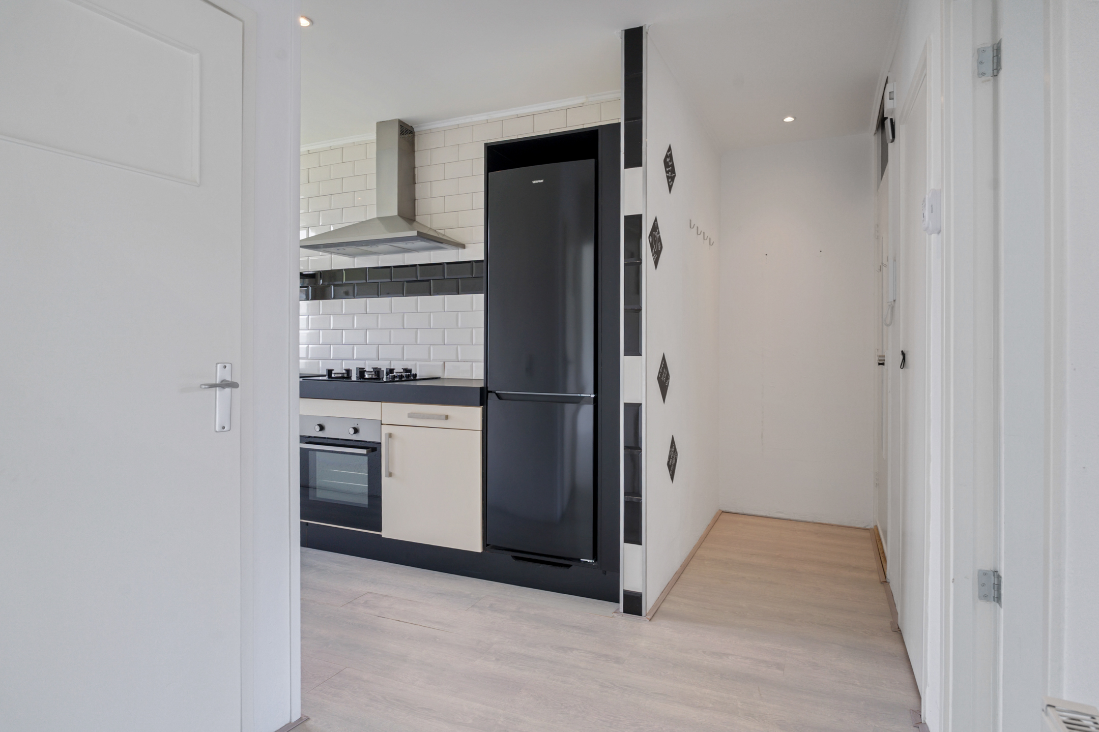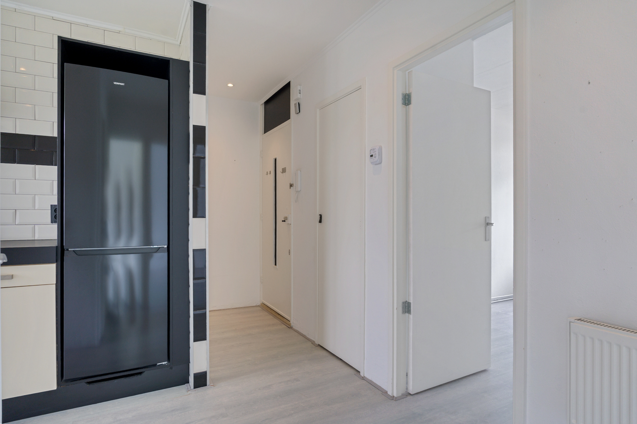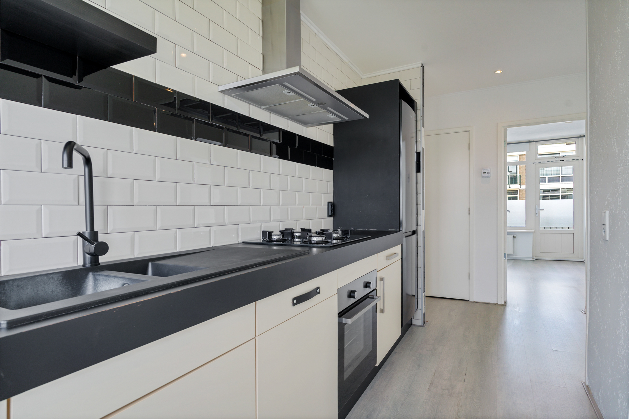 Via het afgesloten portiek bereik je de woning op de tweede verdieping. De ruime hal biedt toegang tot alle vertrekken, waaronder het toilet. Aan de voorzijde ligt de moderne keuken met inbouwapparatuur, dubbele wasbak en een nette afwerking met witte en zwarte wandtegels. Je beschikt over een oven, koelkast, vriezer, vaatwasser, 4-pits gasfornuis en voldoende opbergruimte. Vanuit de keuken heb je toegang tot het eerste balkon op het westen.