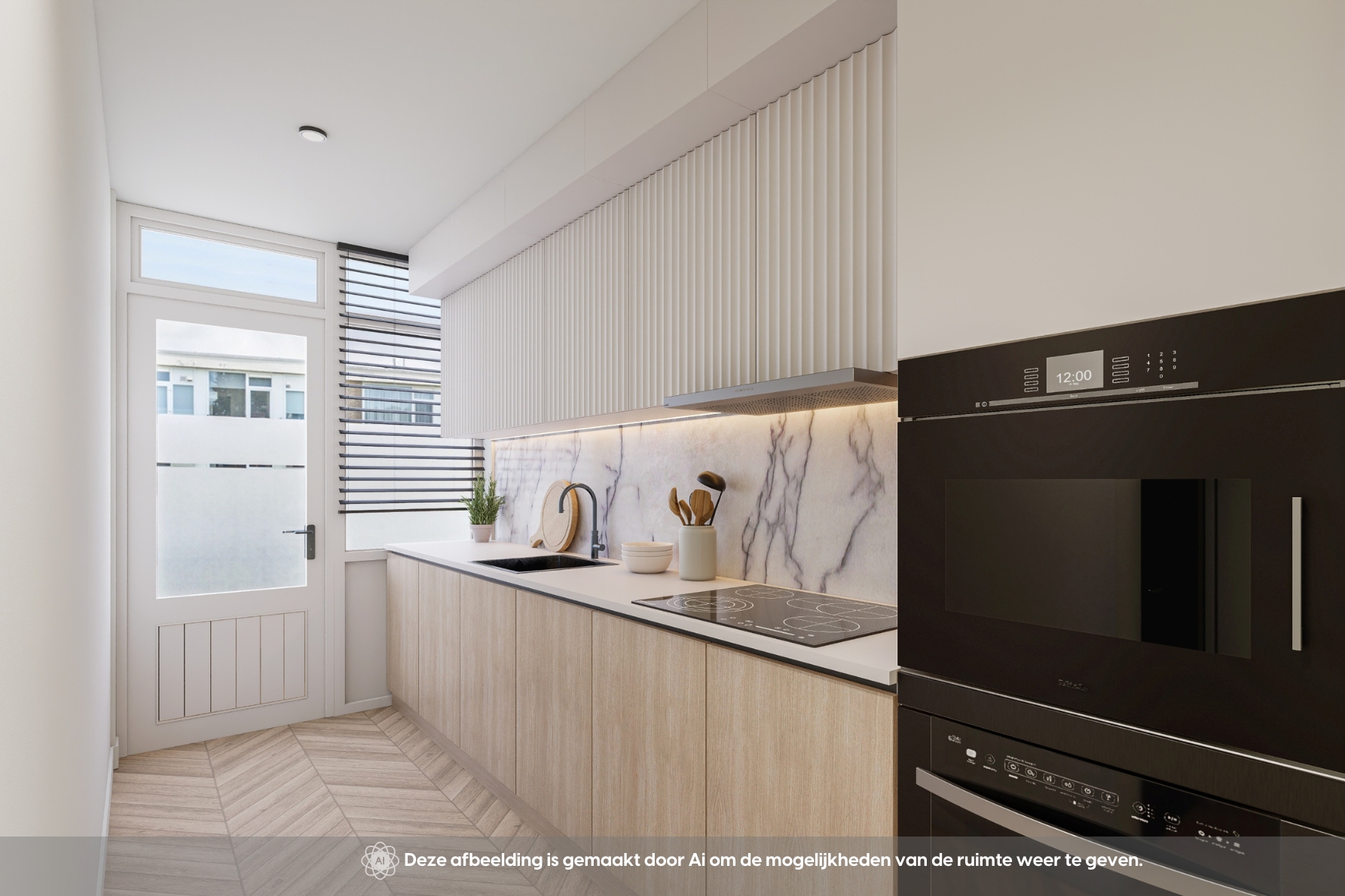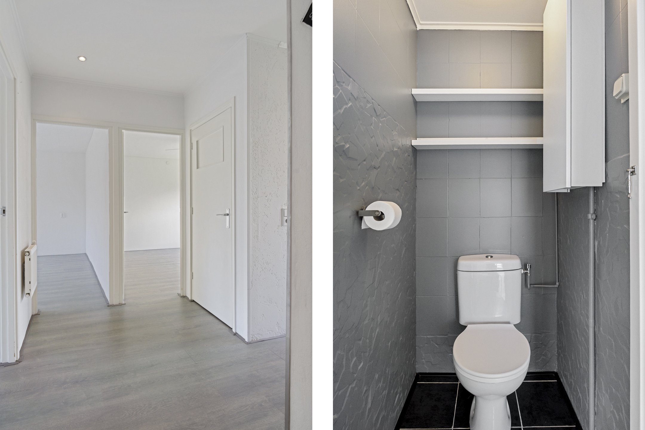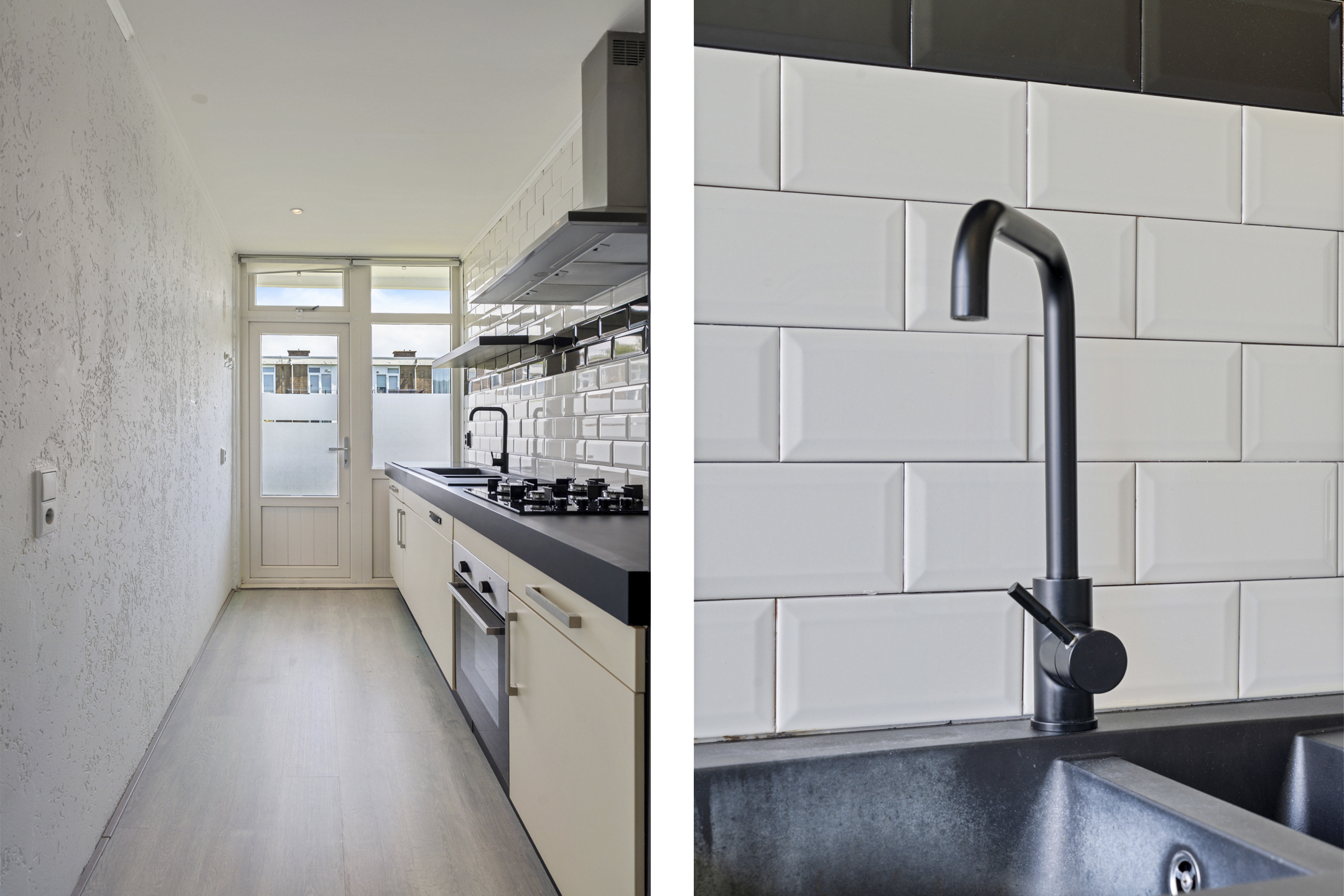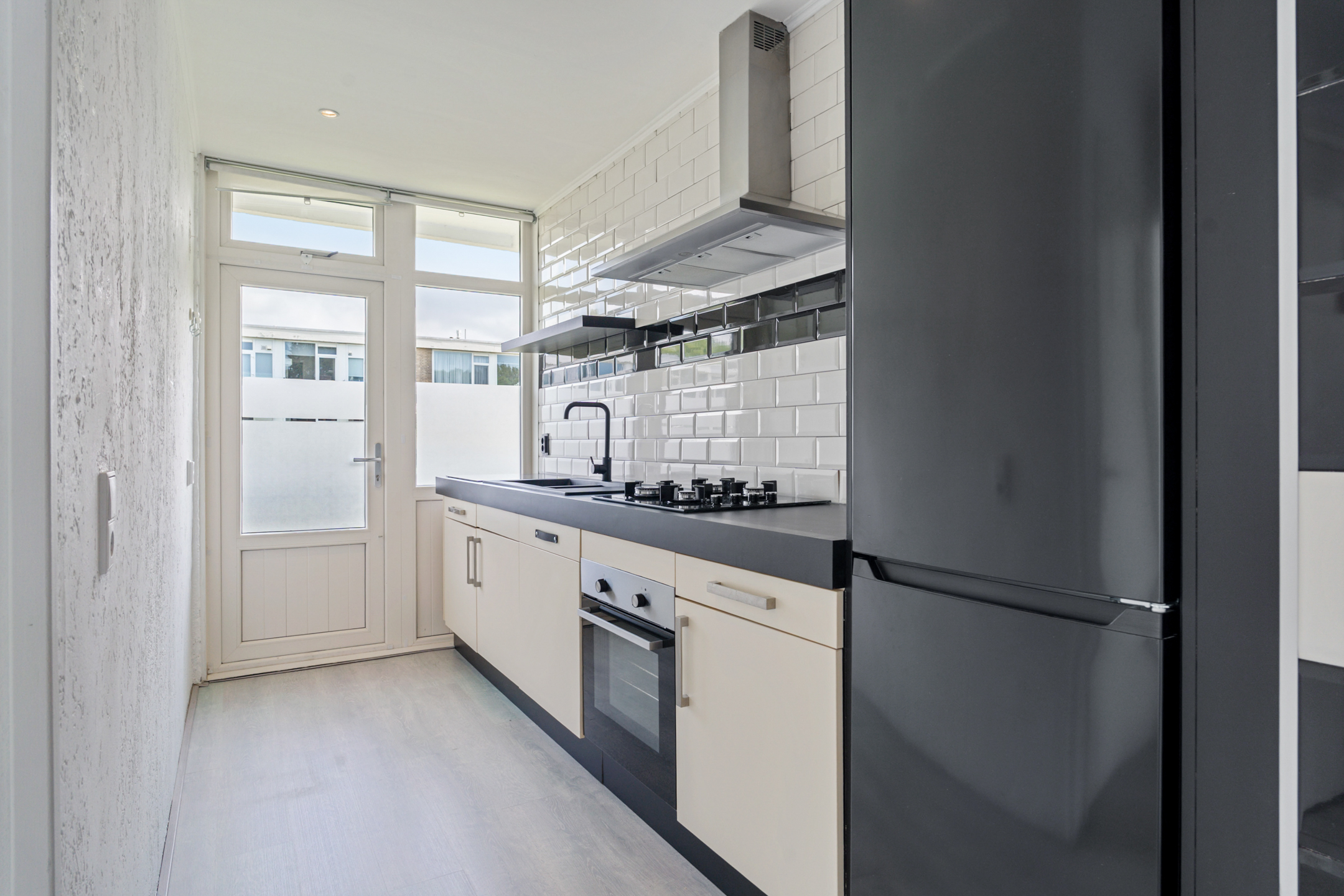 Via het afgesloten portiek bereik je de woning op de tweede verdieping. De ruime hal biedt toegang tot alle vertrekken, waaronder het toilet. Aan de voorzijde ligt de moderne keuken met inbouwapparatuur, dubbele wasbak en een nette afwerking met witte en zwarte wandtegels. Je beschikt over een oven, koelkast, vriezer, vaatwasser, 4-pits gasfornuis en voldoende opbergruimte. Vanuit de keuken heb je toegang tot het eerste balkon op het westen.