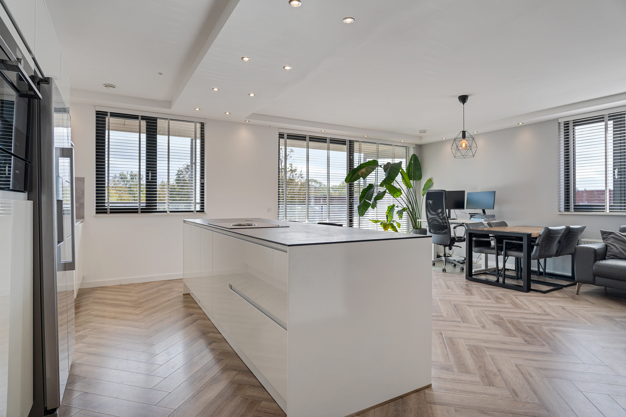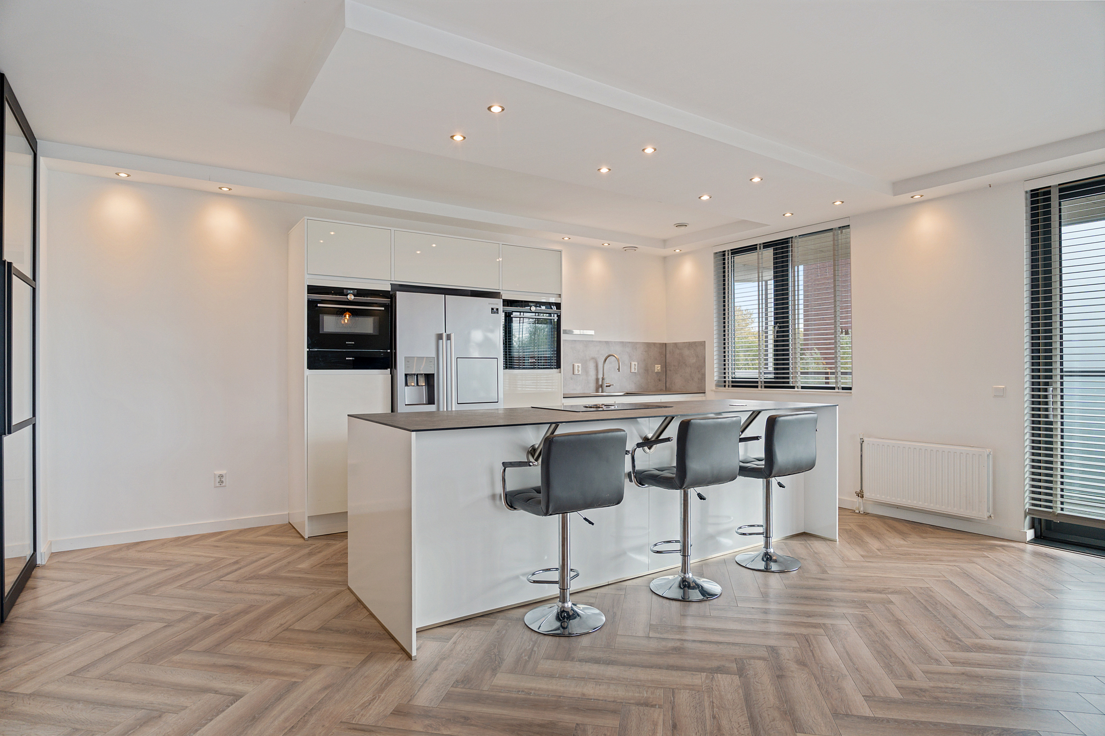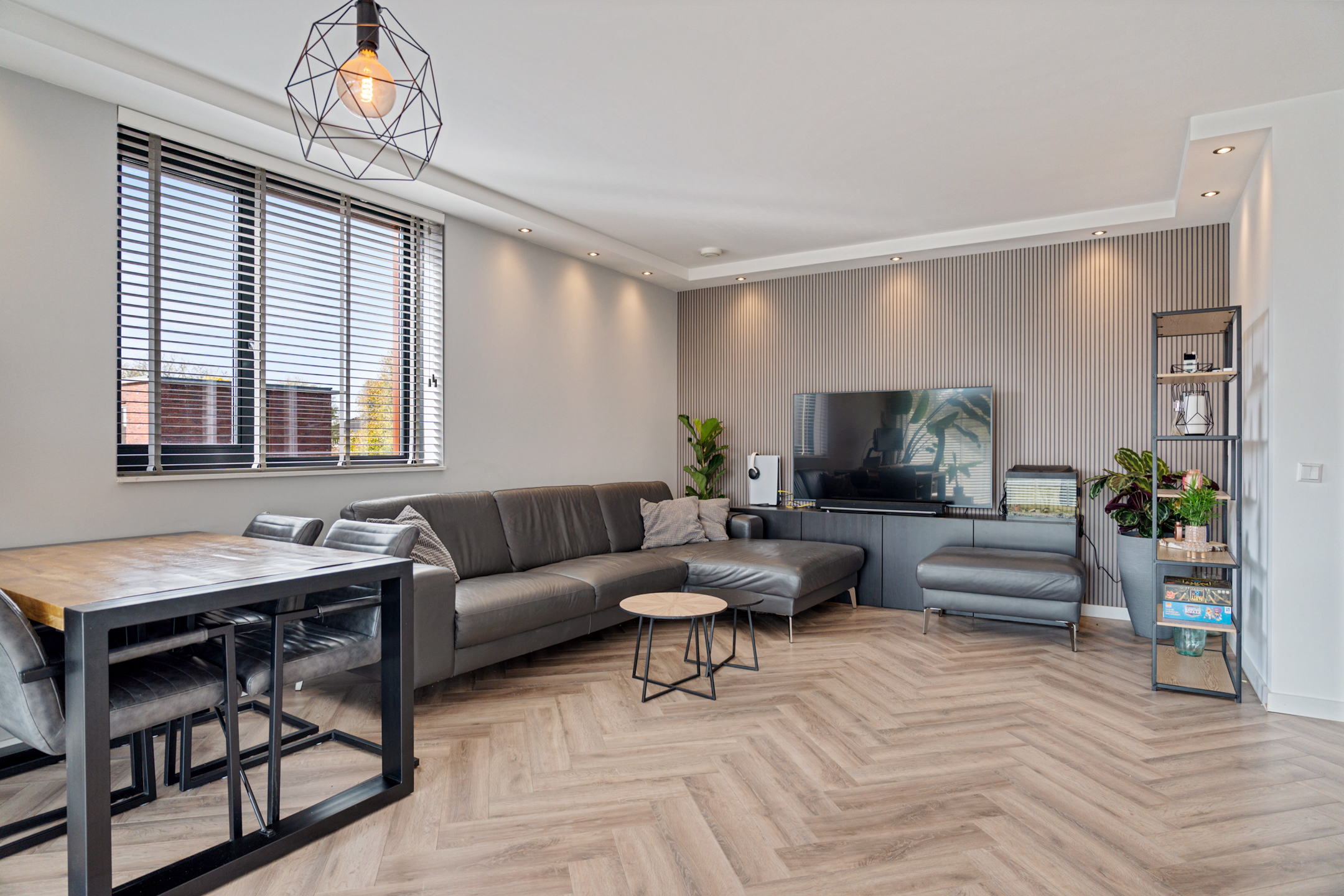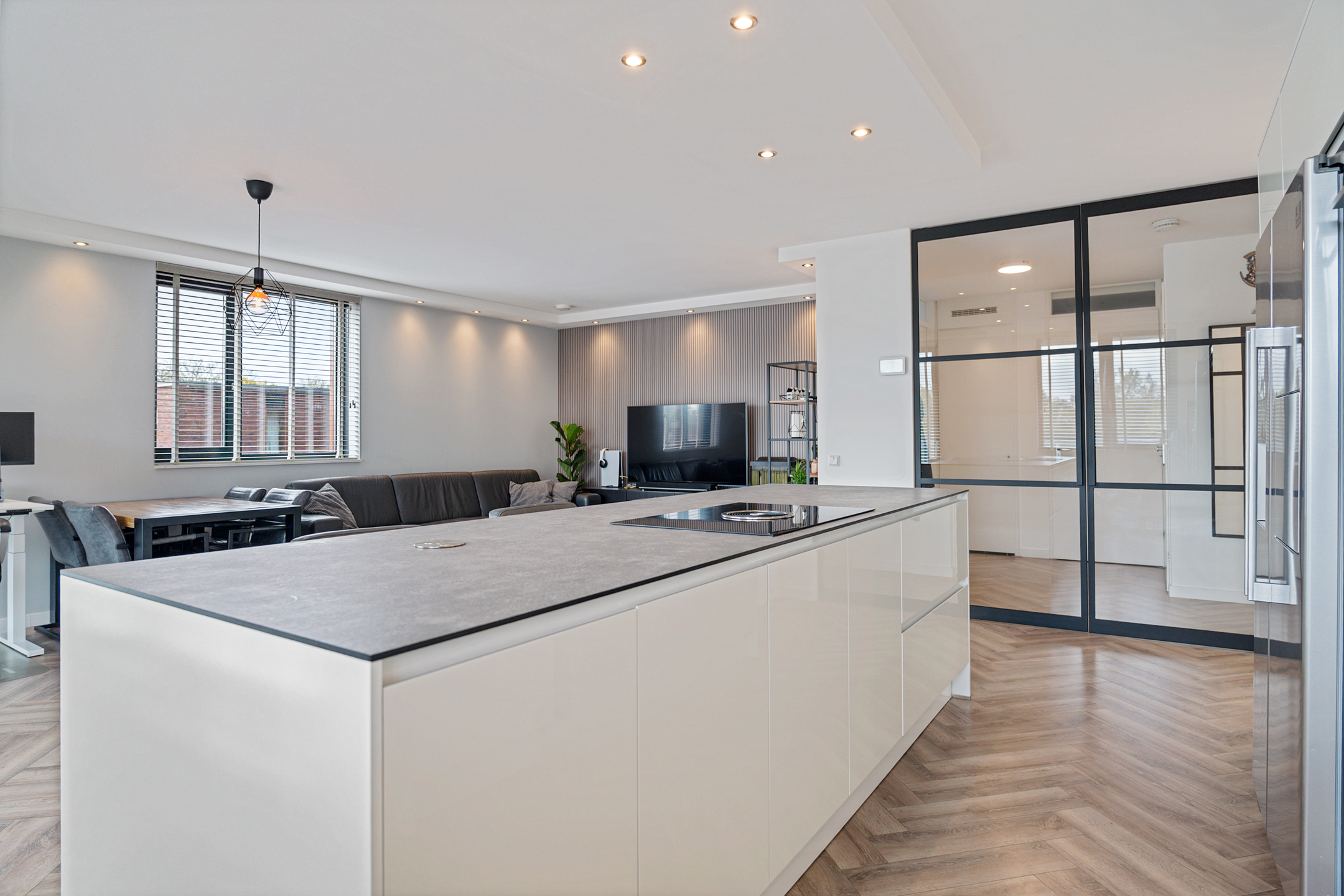 De royale woonkamer is een echte eyecatcher: dankzij de hoekligging en grote raampartijen komt er veel natuurlijk licht binnen. De prachtige visgraatvloer, strakke wandafwerking, ingebouwde spots en twee industriële taatsdeuren geven het geheel een moderne, stijlvolle uitstraling.