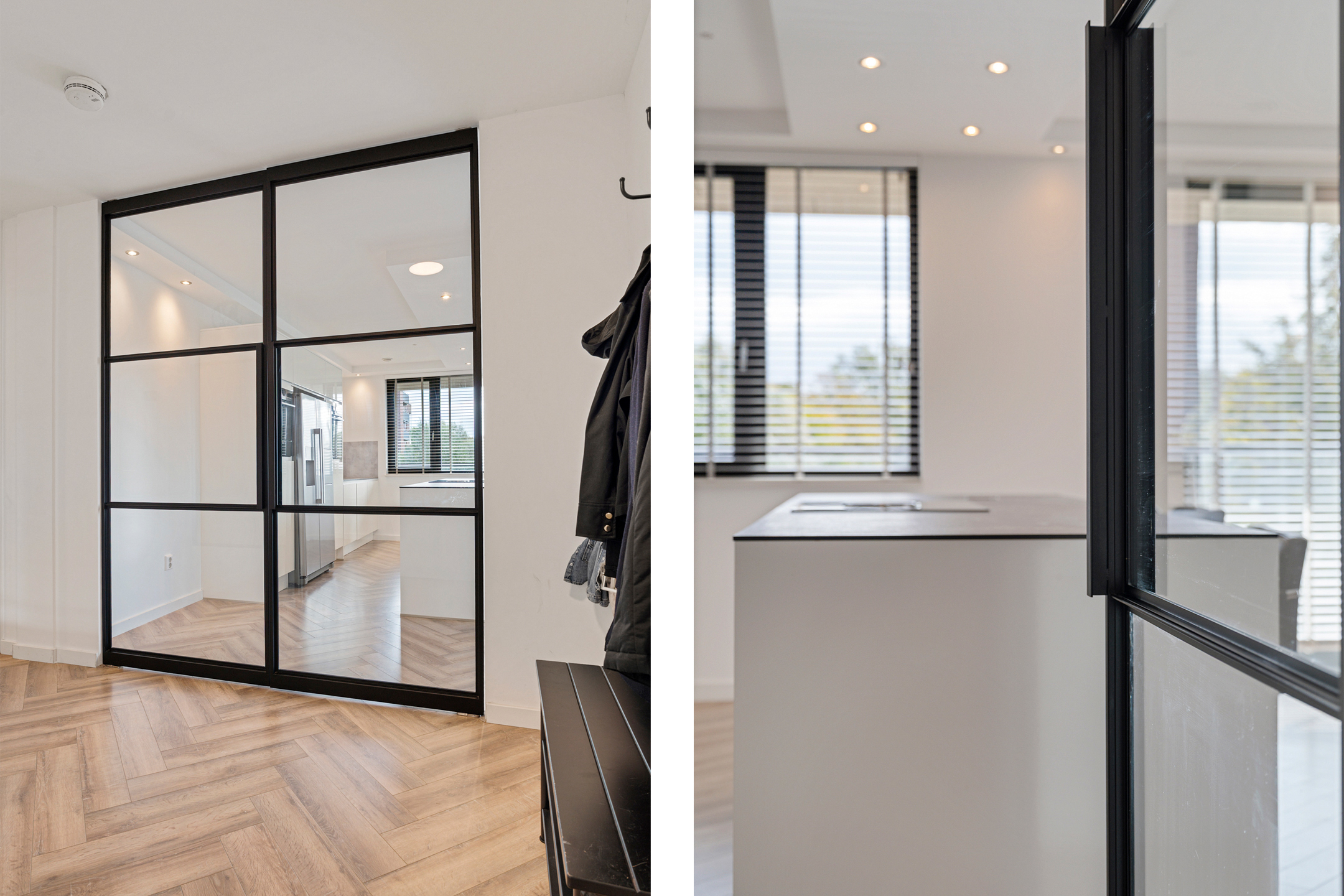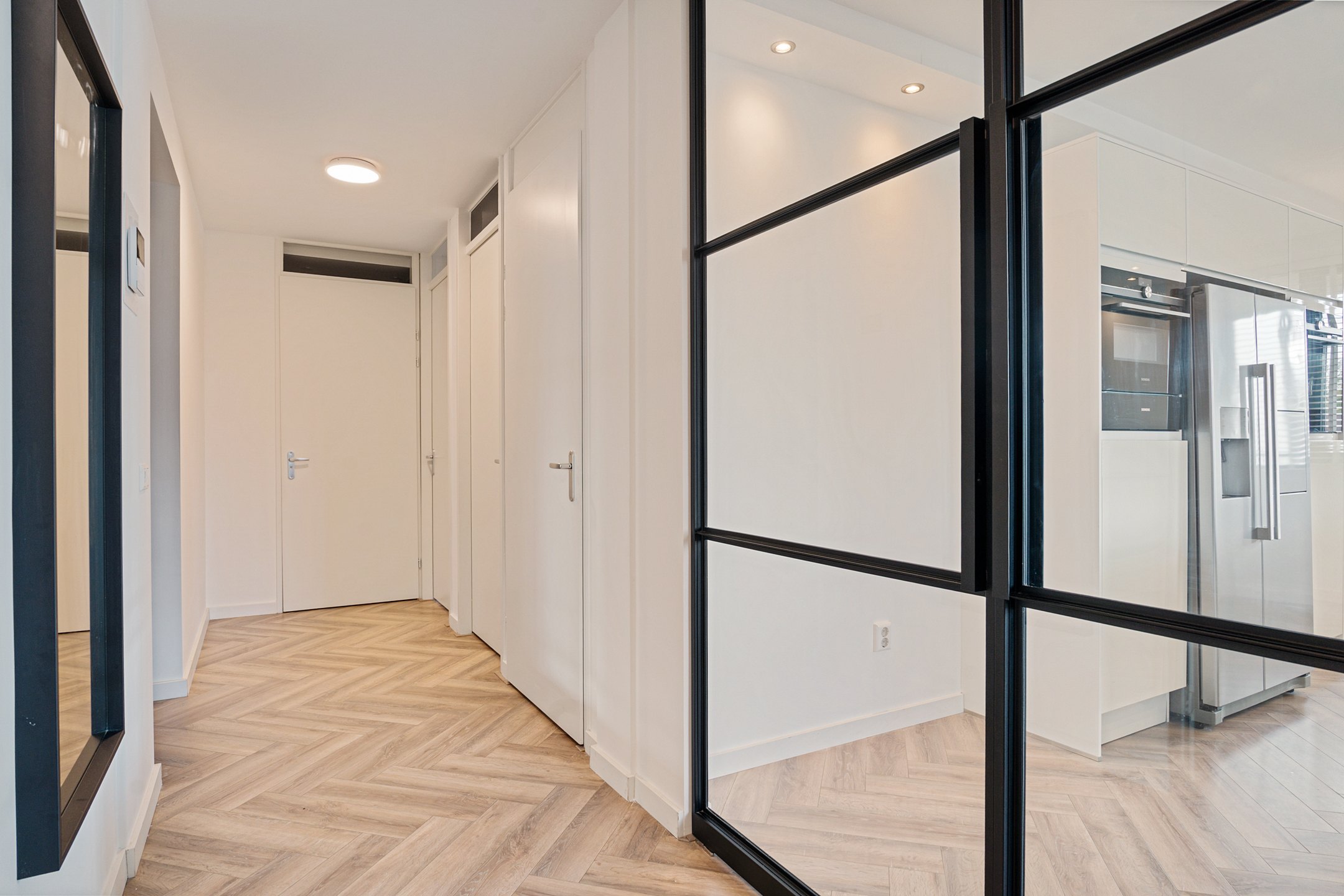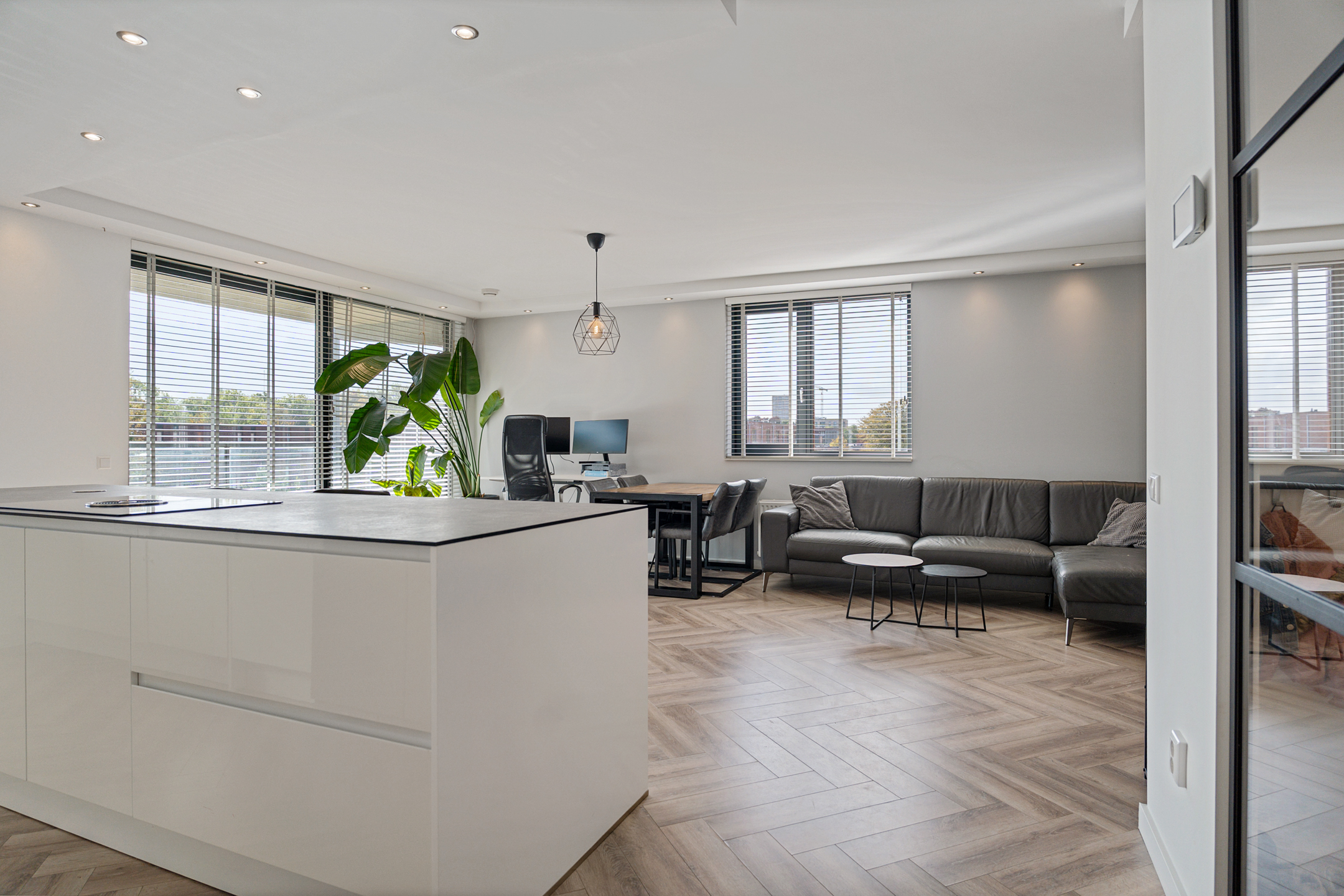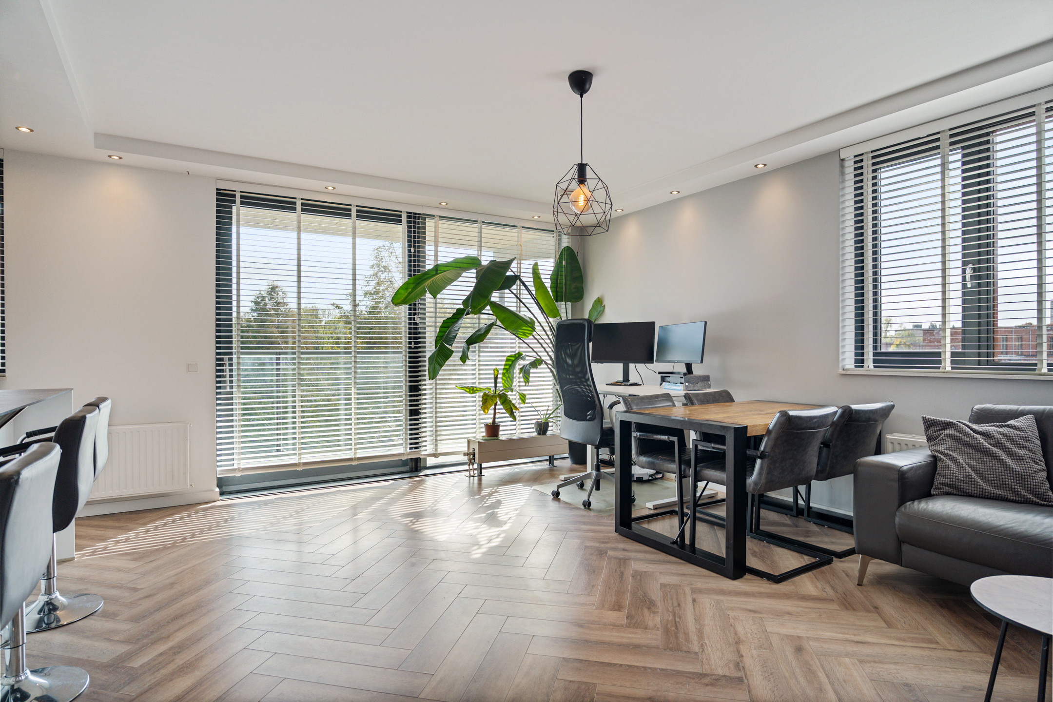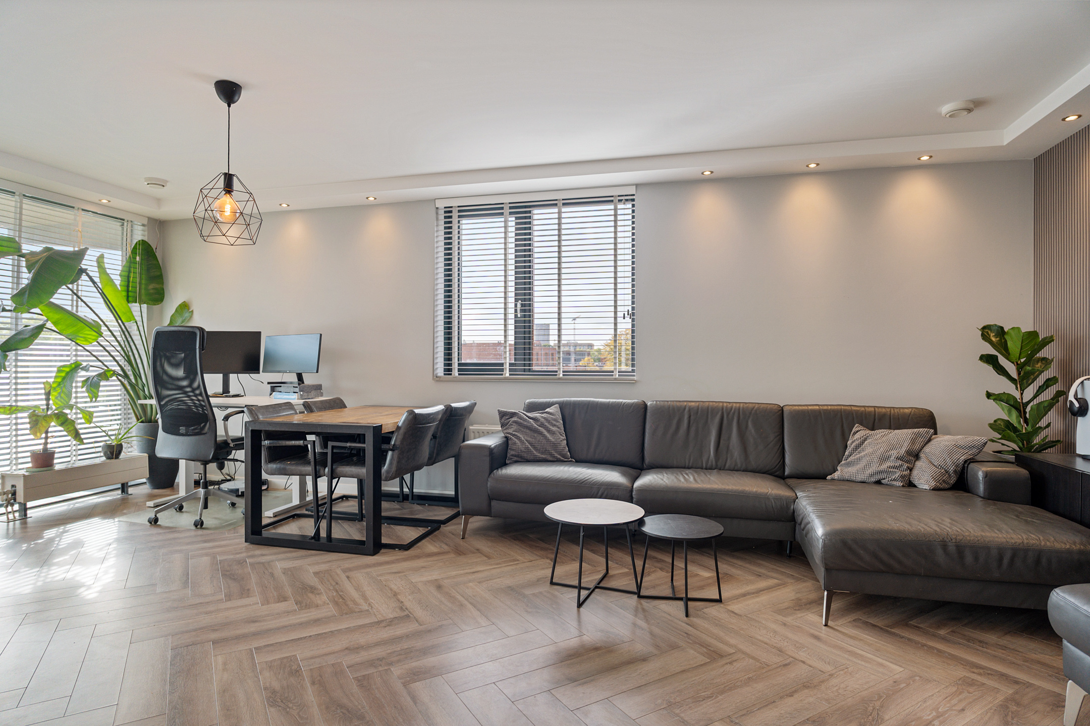 De royale woonkamer is een echte eyecatcher: dankzij de hoekligging en grote raampartijen komt er veel natuurlijk licht binnen. De prachtige visgraatvloer, strakke wandafwerking, ingebouwde spots en twee industriële taatsdeuren geven het geheel een moderne, stijlvolle uitstraling.