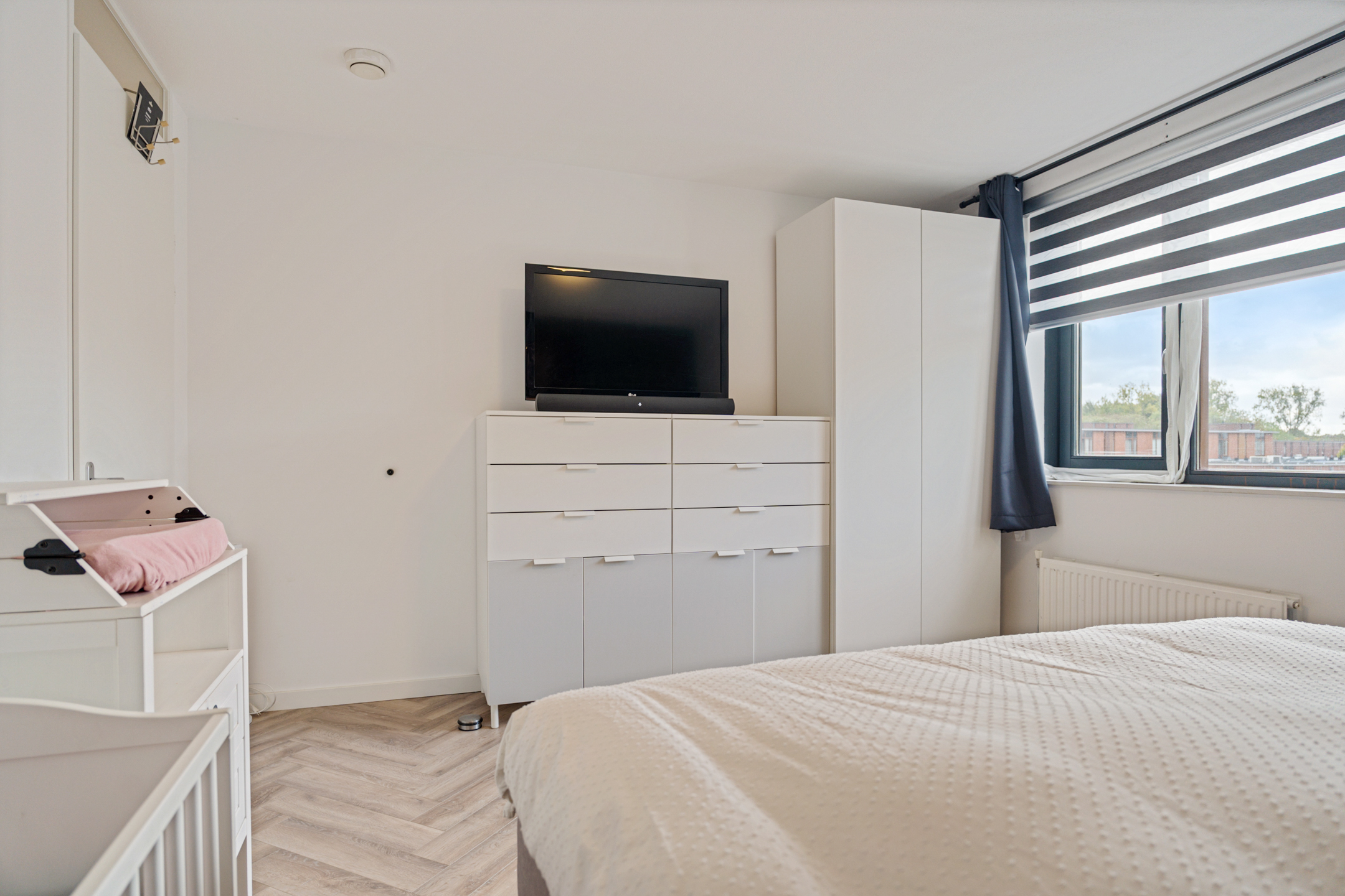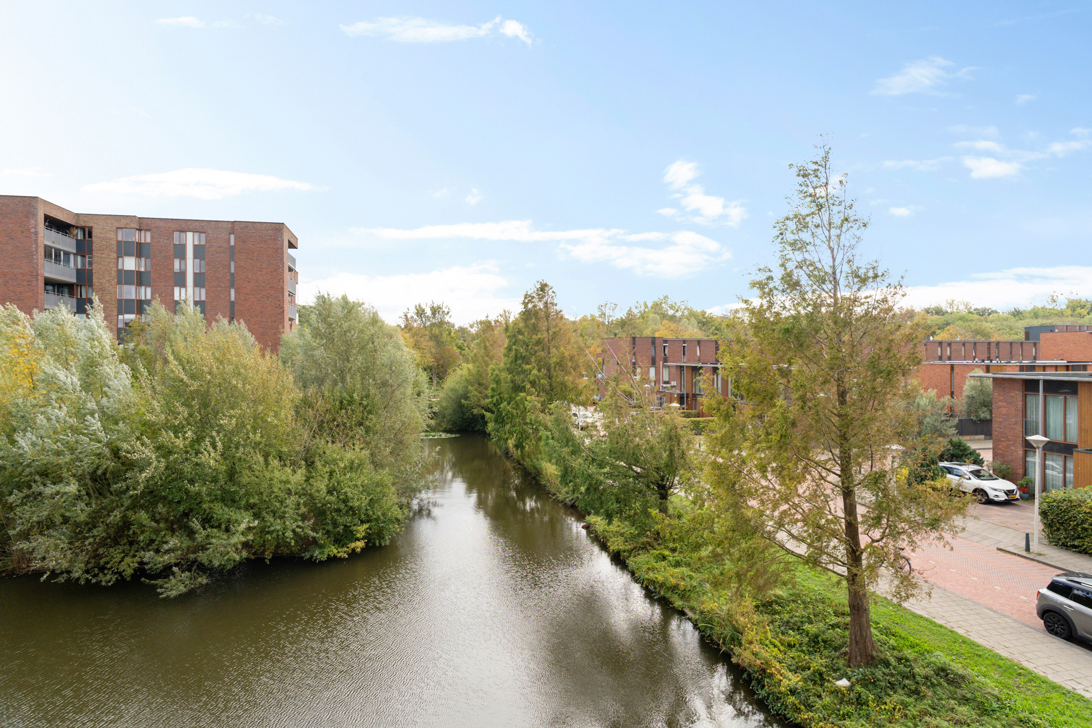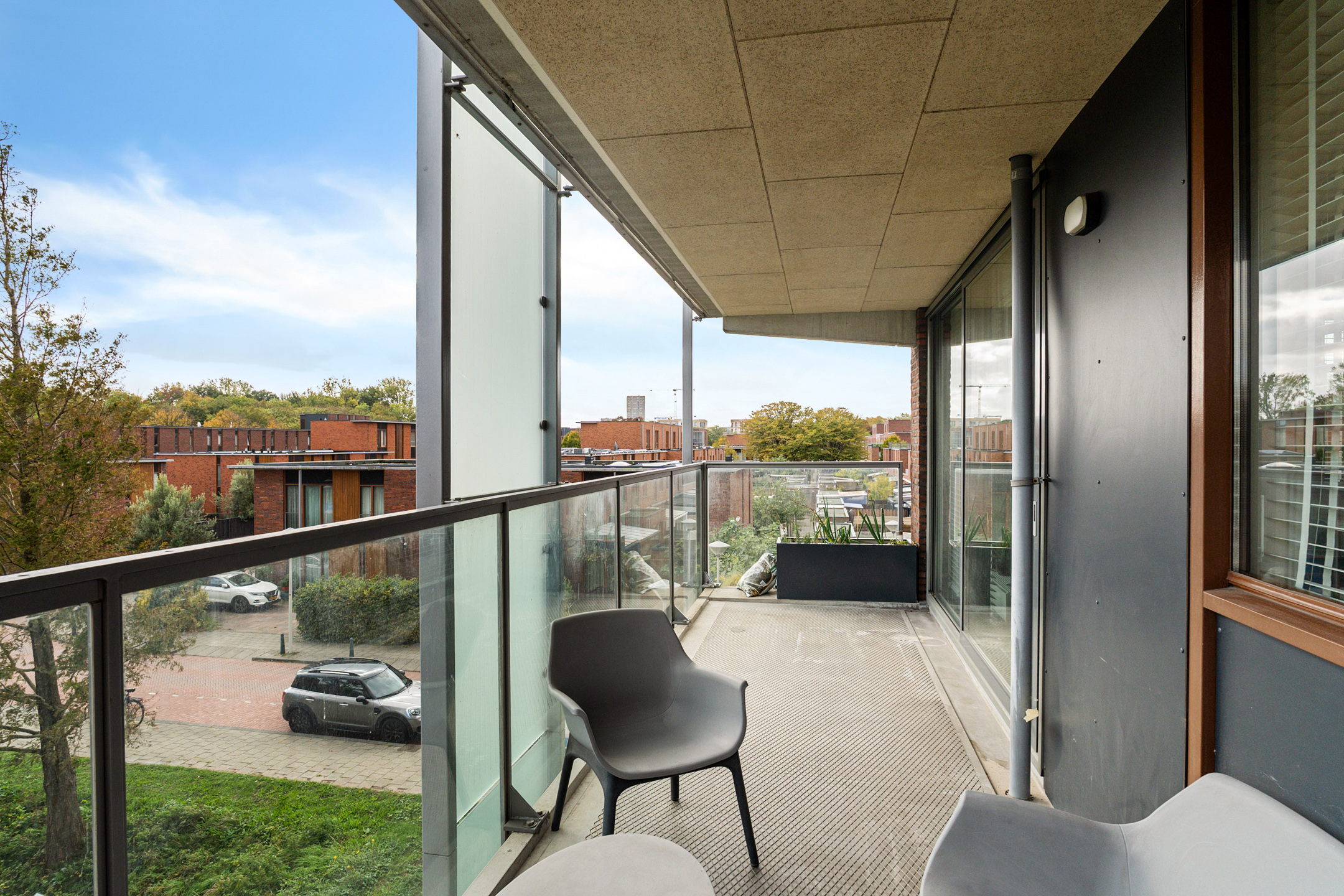 Via de schuifdeur in de woonkamer stap je het zonnige balkon op, gelegen op het zuidoosten. Hier geniet je van rust, uitzicht op het water en groen, en zon tot het eind van de middag.
