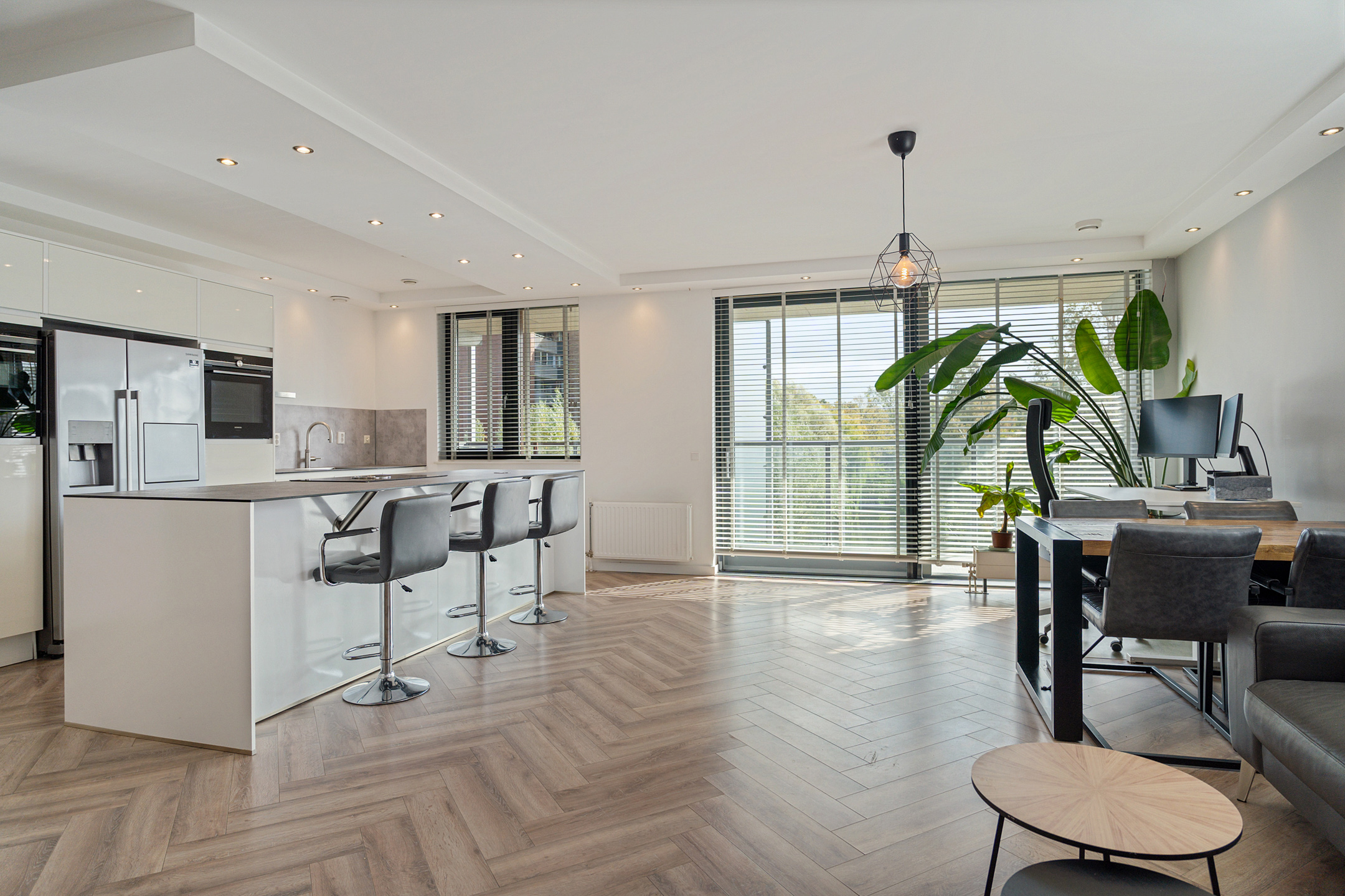 De open keuken vormt het hart van het appartement. Deze moderne witte hoogglanskeuken met kook-/spoeleiland van circa 3 bij 1 meter is uitgerust met Siemens Studioline inbouwapparatuur, een Bora inductiekookplaat met geïntegreerde afzuiging, Quooker, combi-oven, oven, vaatwasser en een Amerikaanse koelkast met water- en ijsdispenser. Een keuken waar design, comfort en functionaliteit samenkomen.