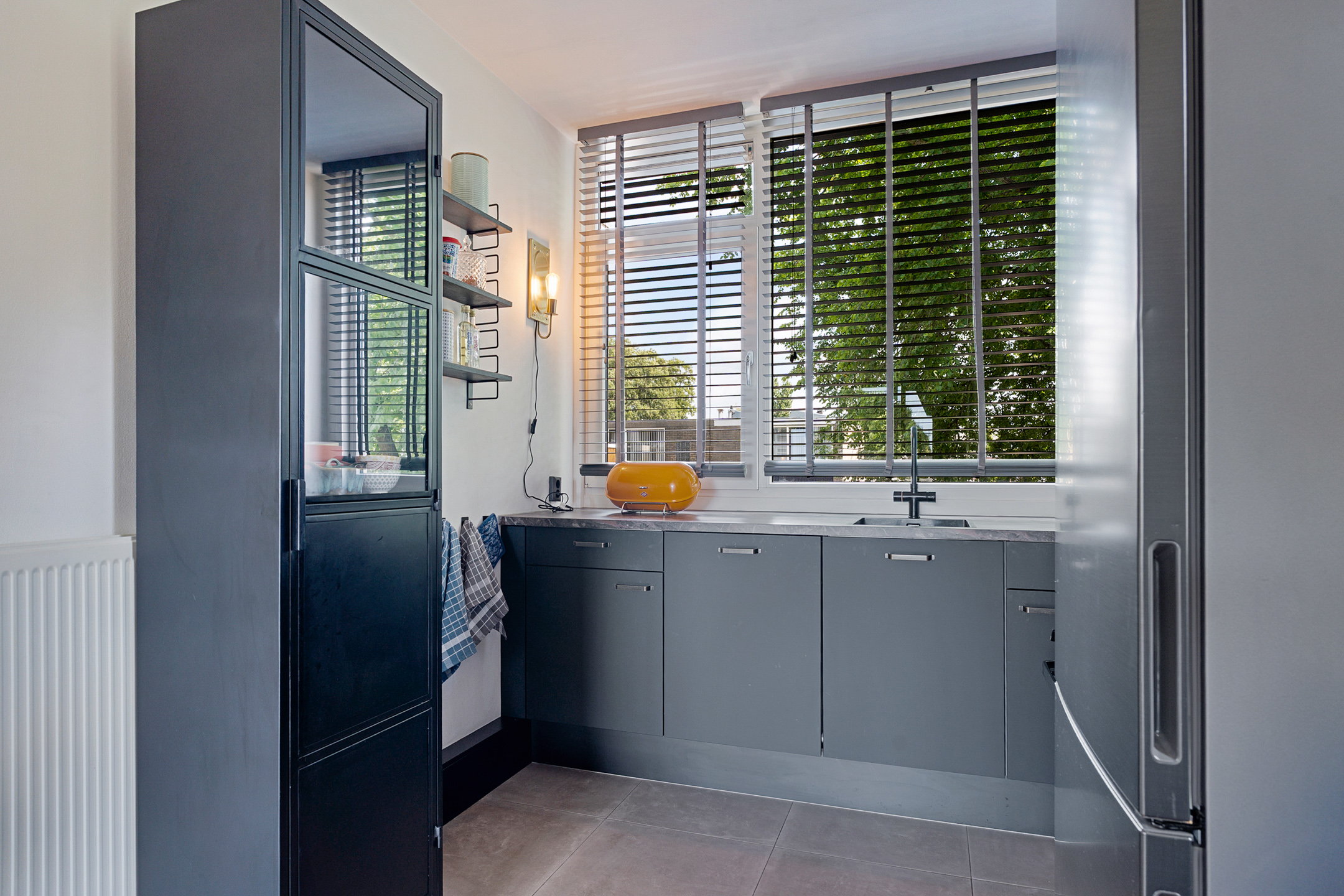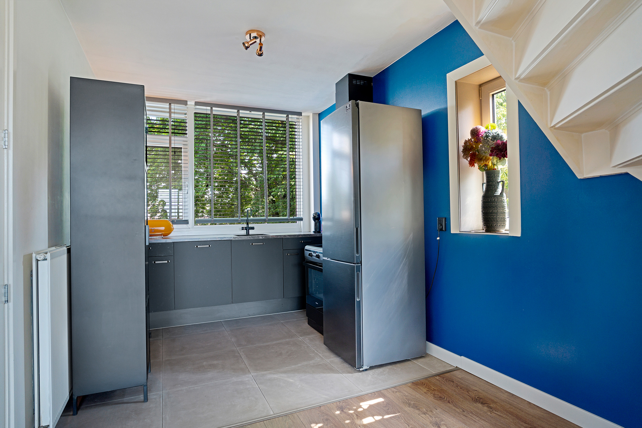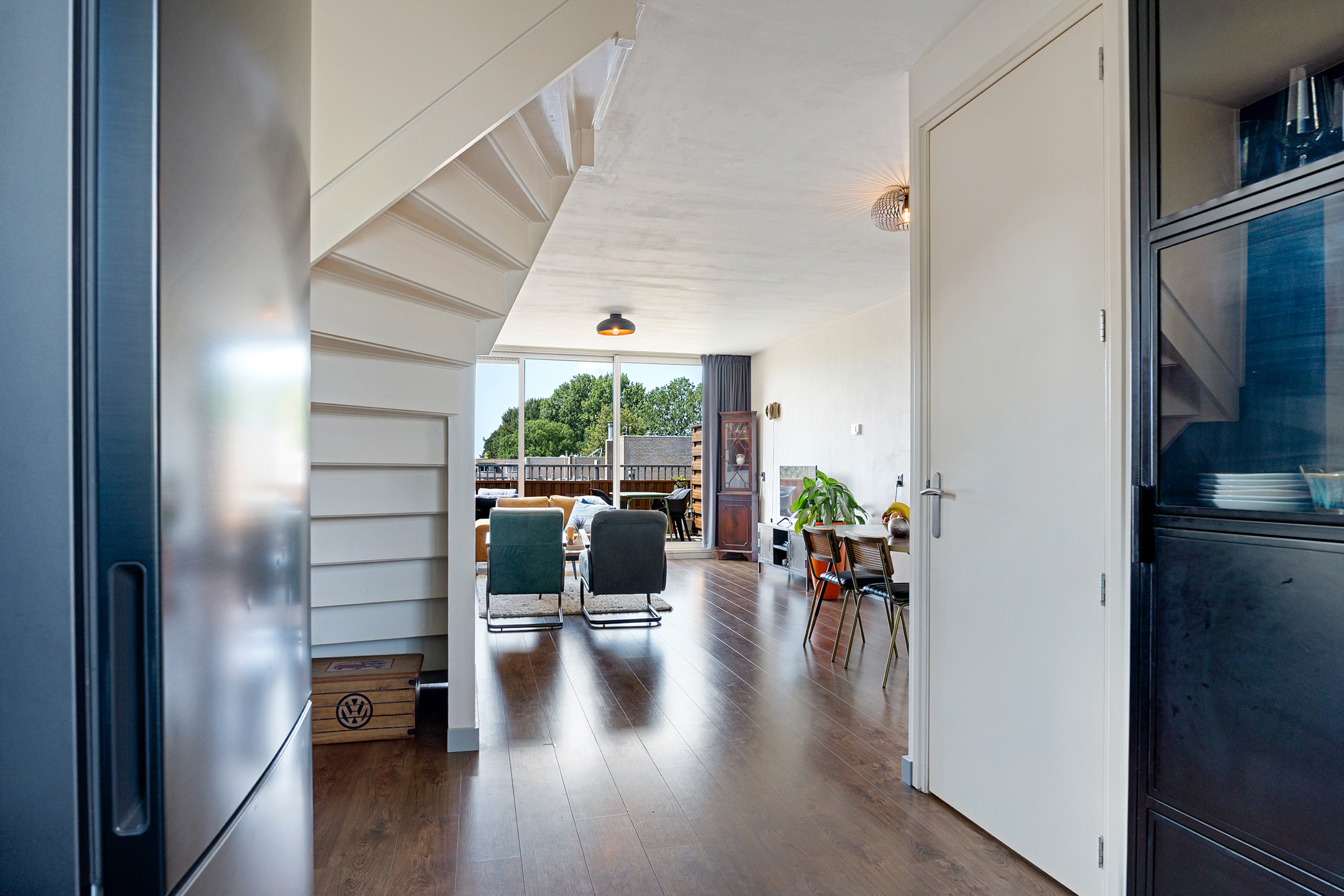 De woning is te bereiken via een trap vanaf het wandeldek op de eerste verdieping. In de hal vindt u het toilet (2018) met handwasfontein en een gemoderniseerde meterkast. Vervolgens betreed je de ruime woonkamer waar je geniet van een prachtige lichtinval dankzij ramen aan zowel de achter- als zijkant. Aan de voorzijde bevindt zich de stijlvolle keuken (2020), uitgevoerd in een donkere kleurstelling en voorzien van moderne apparatuur zoals een Quooker en een elektrische kookplaat. Via de schuifpui bereikt u het royale dakterras, waar u geniet van volop zon (zuid- en westligging), een groen uitzicht en het comfort van een elektrisch zonnescherm.