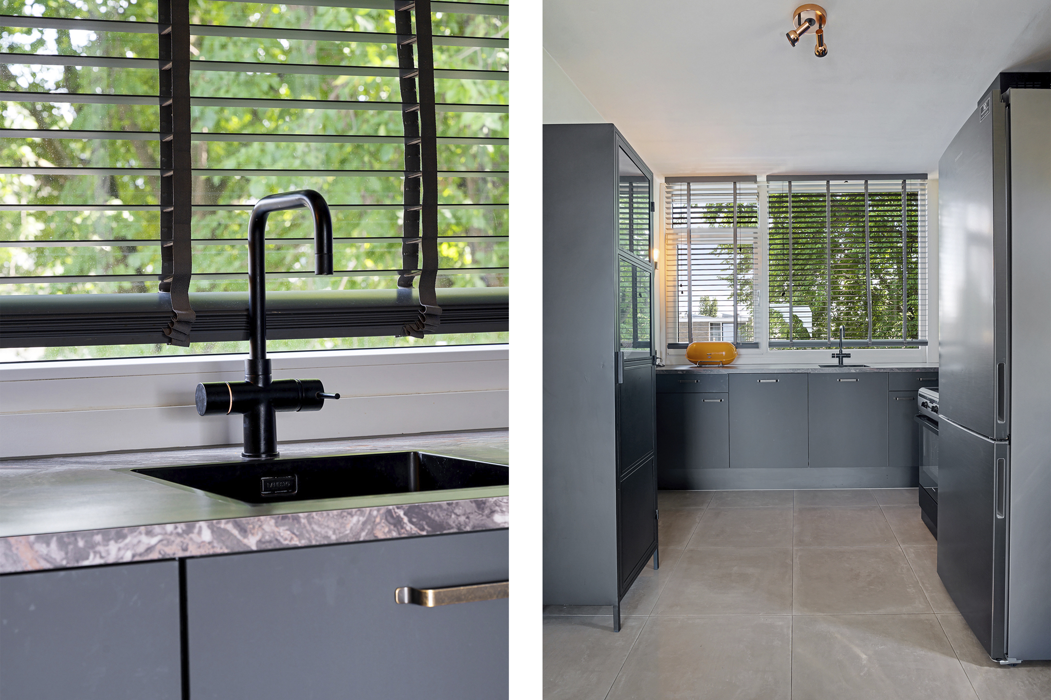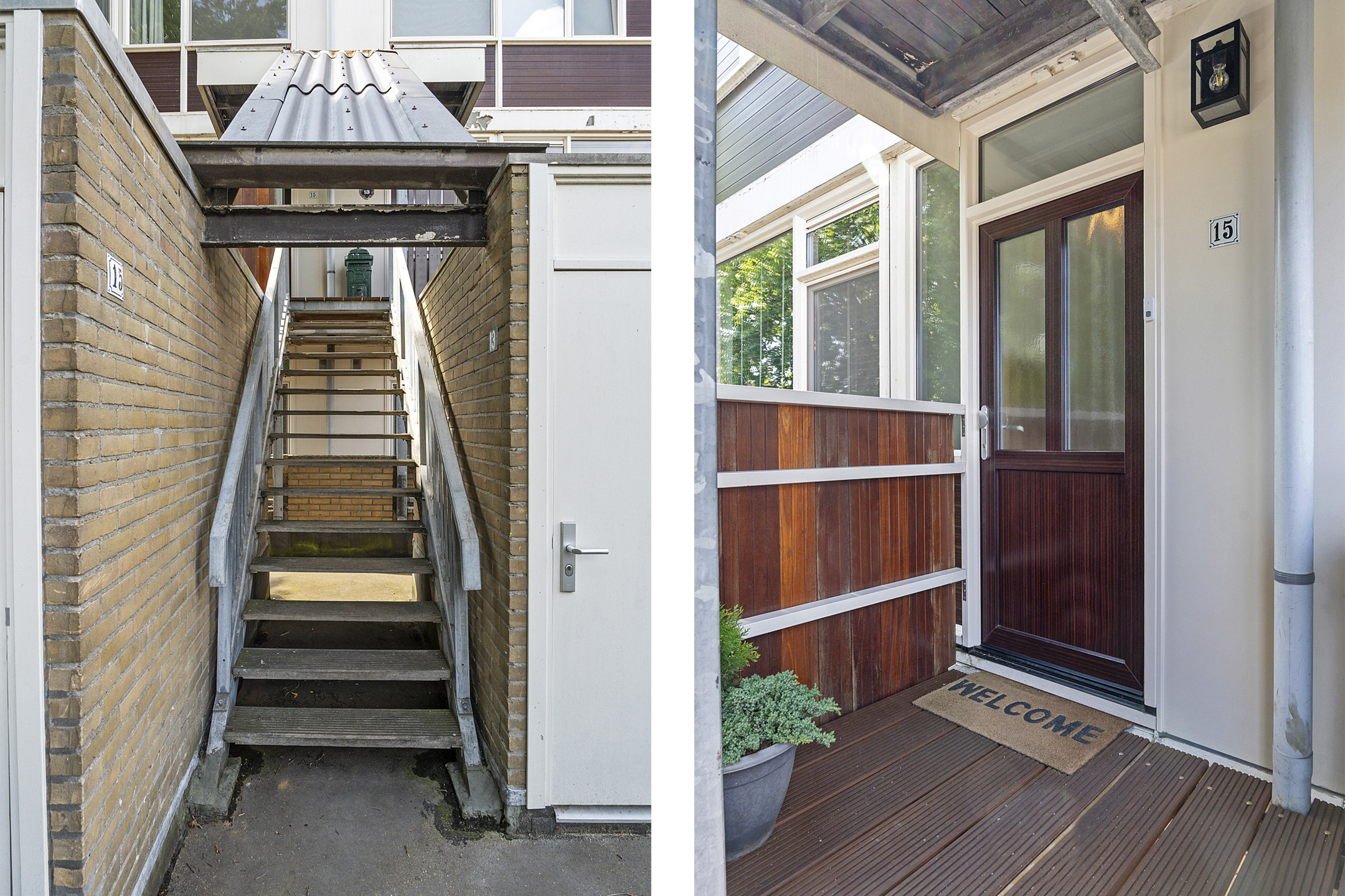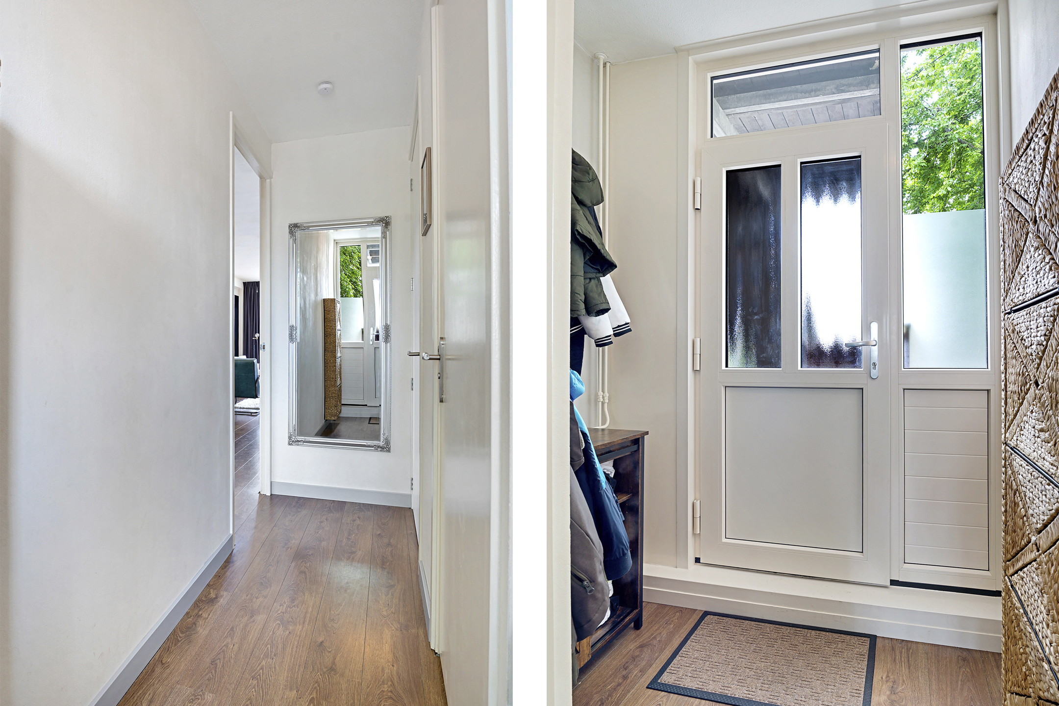 De woning is te bereiken via een trap vanaf het wandeldek op de eerste verdieping. In de hal vindt u het toilet (2018) met handwasfontein en een gemoderniseerde meterkast. Vervolgens betreed je de ruime woonkamer waar je geniet van een prachtige lichtinval dankzij ramen aan zowel de achter- als zijkant. Aan de voorzijde bevindt zich de stijlvolle keuken (2020), uitgevoerd in een donkere kleurstelling en voorzien van moderne apparatuur zoals een Quooker en een elektrische kookplaat. Via de schuifpui bereikt u het royale dakterras, waar u geniet van volop zon (zuid- en westligging), een groen uitzicht en het comfort van een elektrisch zonnescherm.
