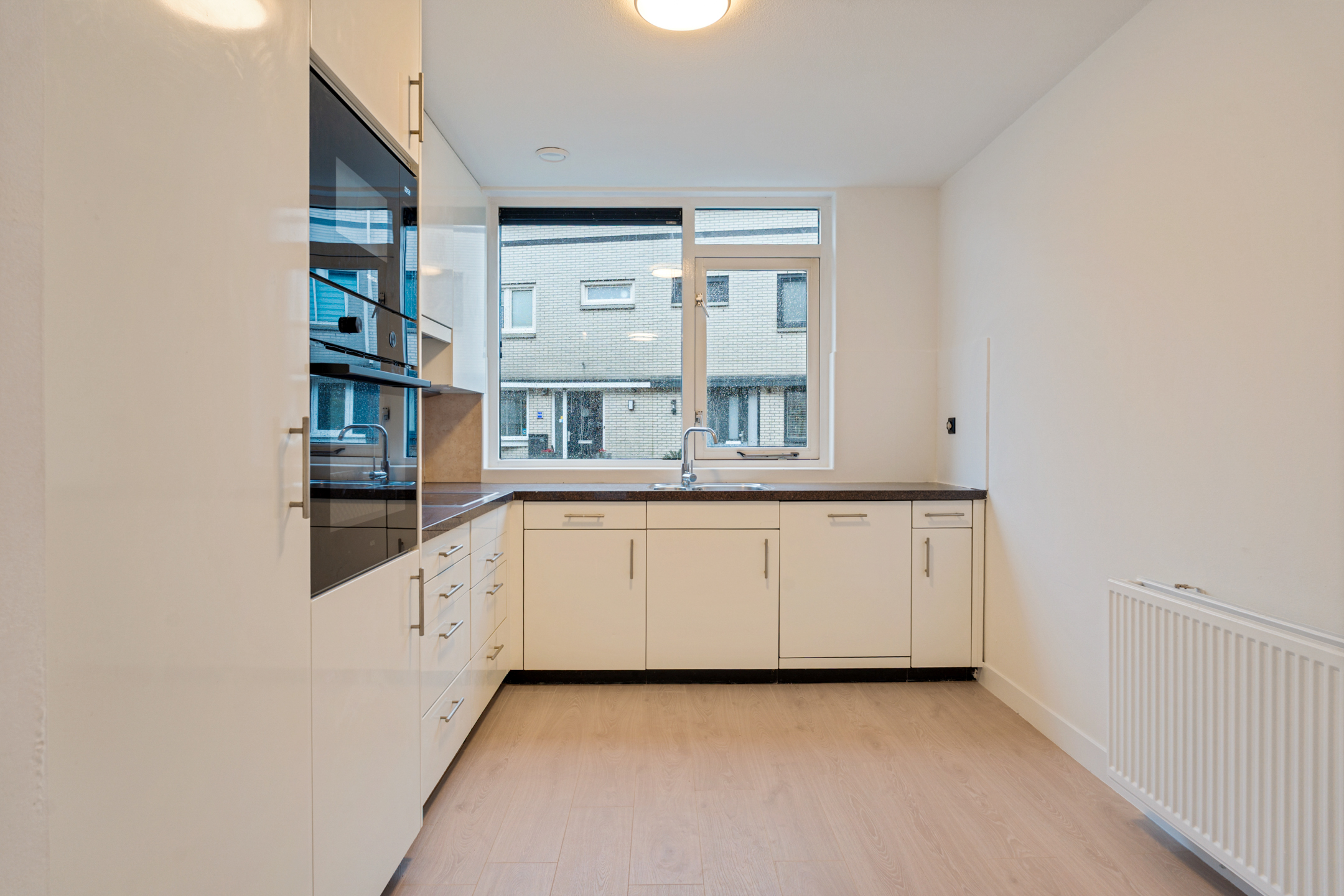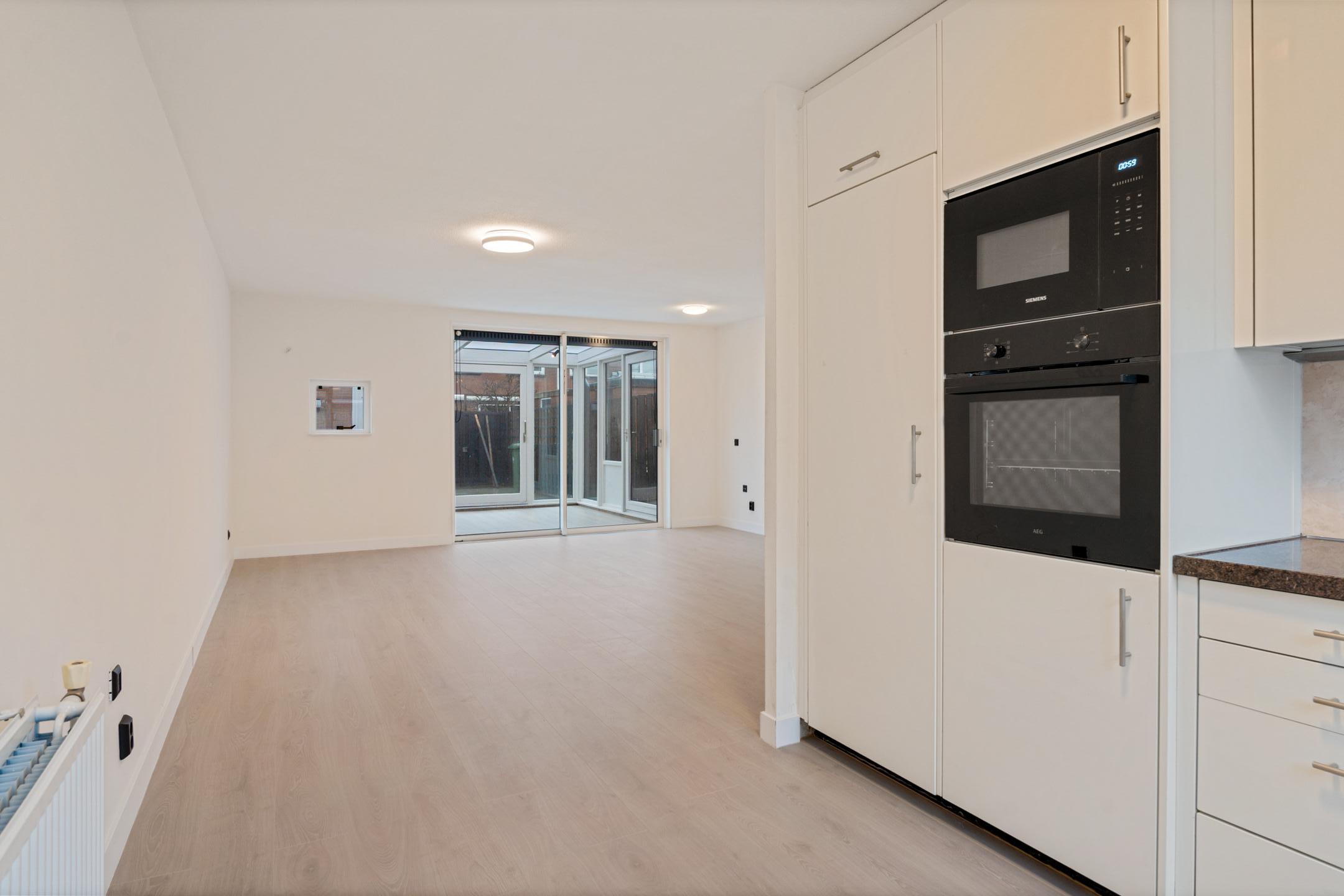 De open keuken aan de voorzijde is netjes uitgevoerd en voorzien van diverse inbouwapparatuur, waaronder een nieuwe afzuigkap, oven en magnetron.