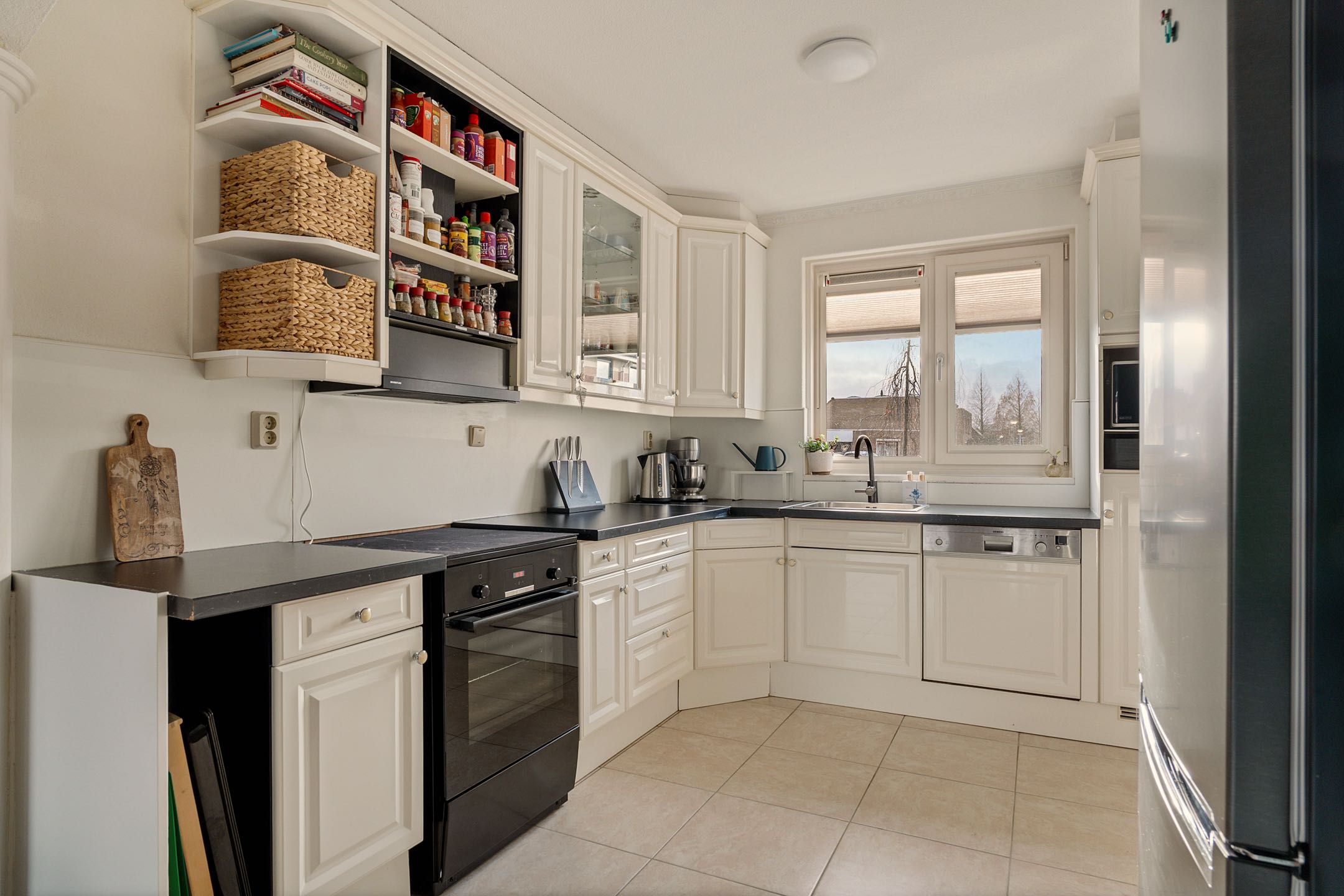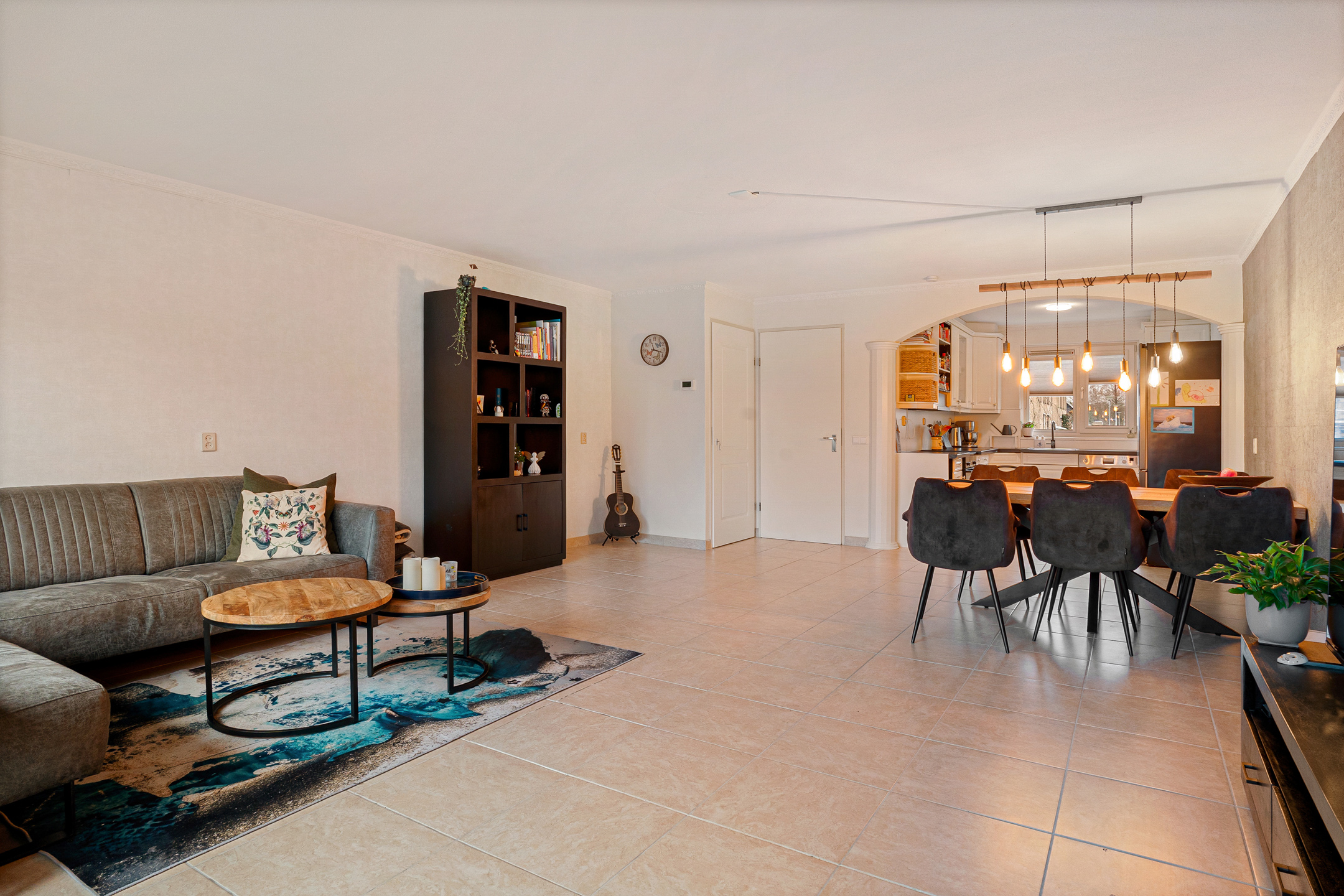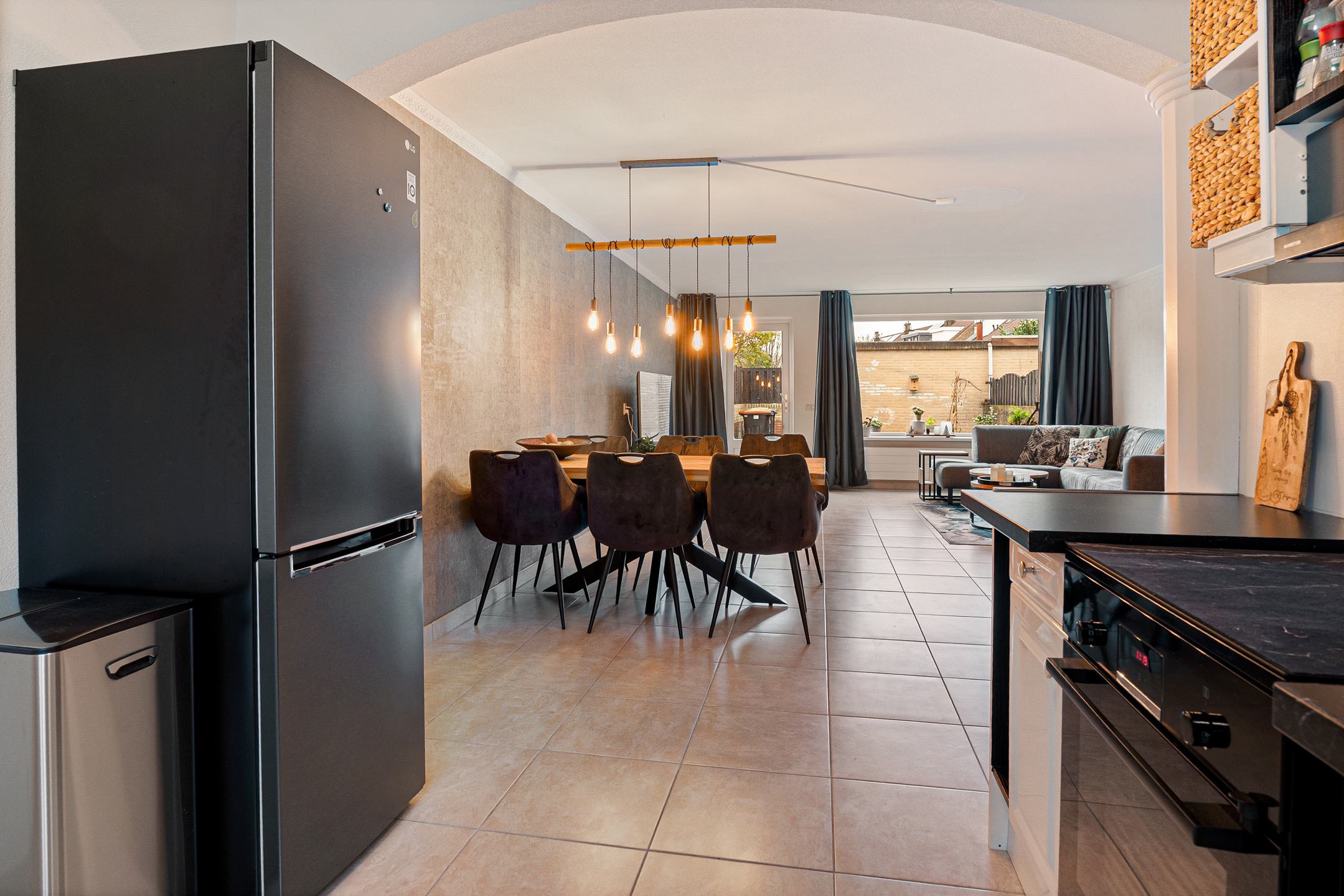 De zeer royale woonkamer is aan de tuinzijde gelegen en dankzij de uitbouw heerlijk ruim en licht. De plavuizen vloer met vloerverwarming zorgt voor extra comfort en een verzorgde uitstraling. Daarnaast is er een praktische trapkast aanwezig. Aan de voorzijde van de woning bevindt zich de keuken, uitgevoerd in een hoekopstelling en voorzien van diverse inbouwapparatuur, met prettig vrij uitzicht.