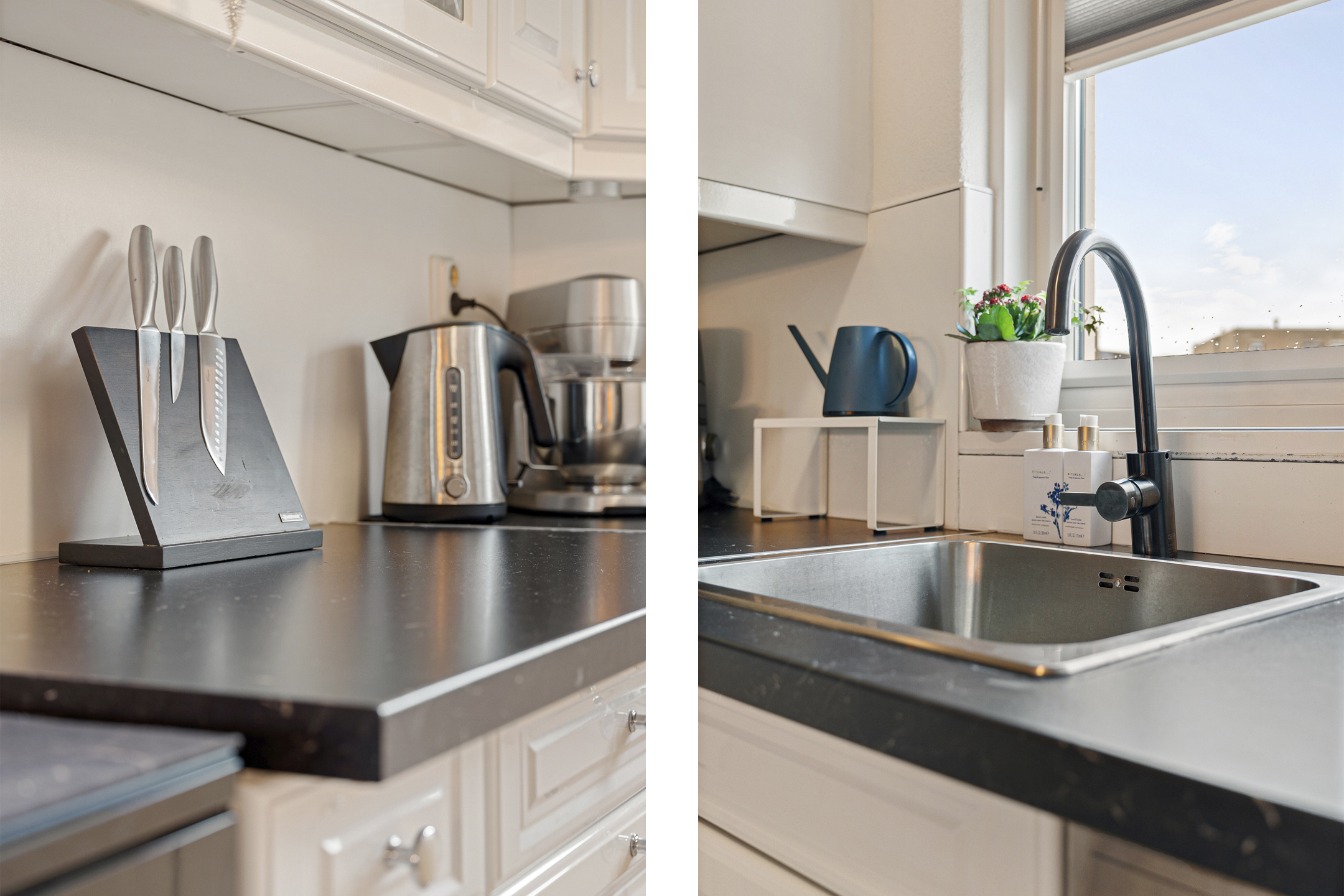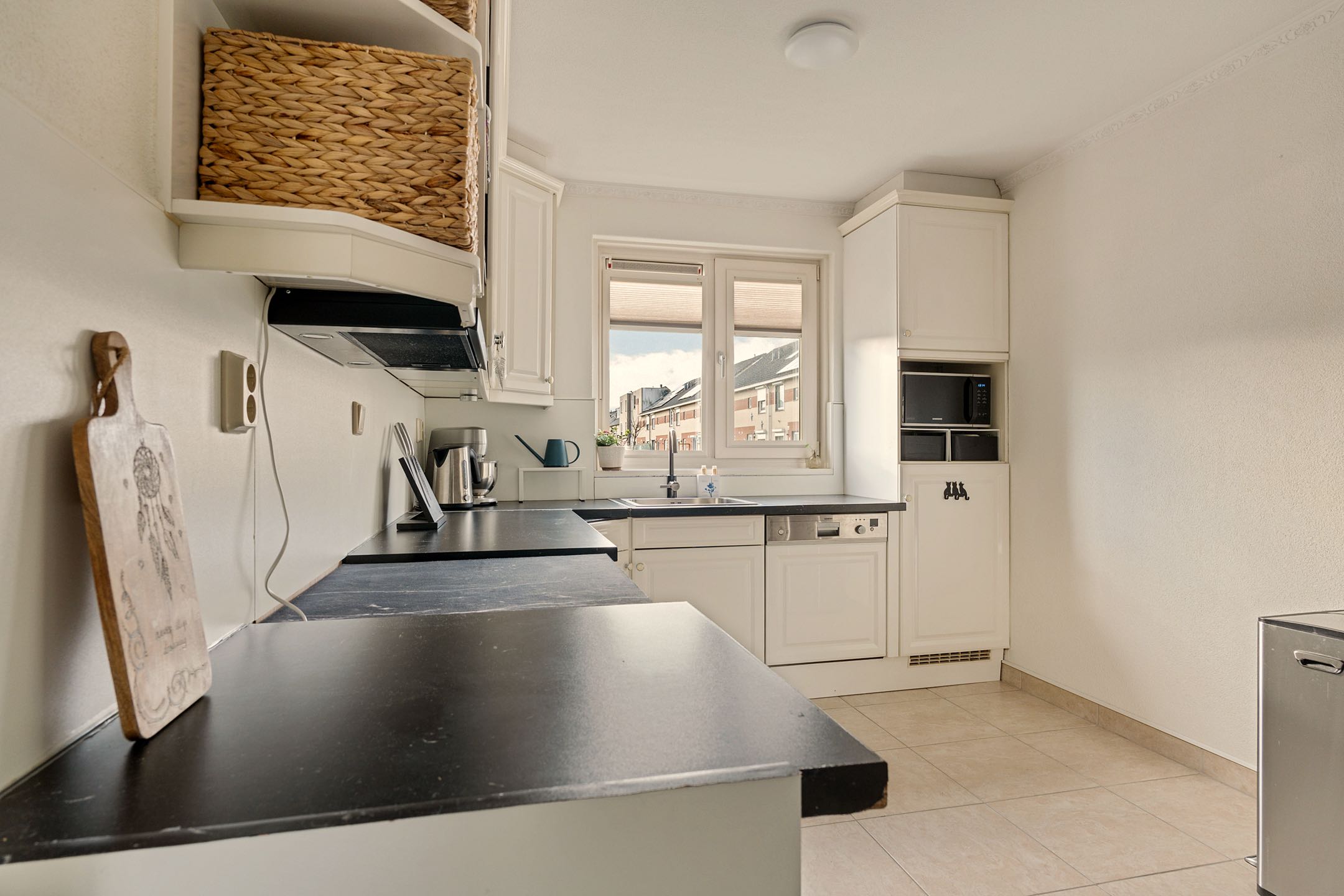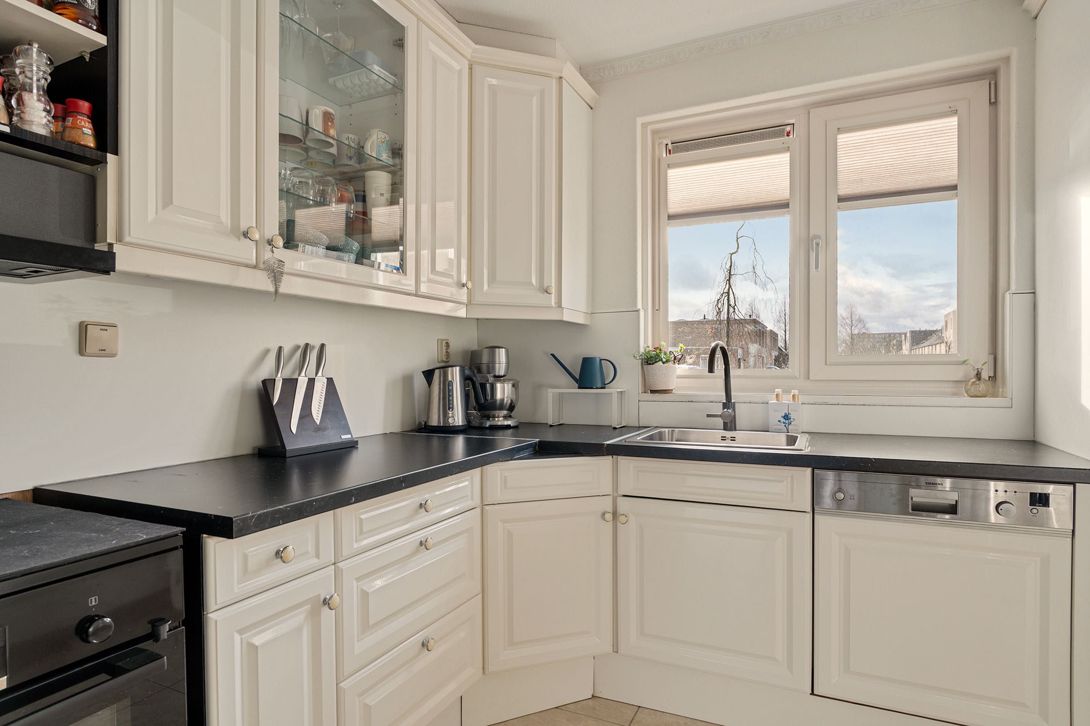 De zeer royale woonkamer is aan de tuinzijde gelegen en dankzij de uitbouw heerlijk ruim en licht. De plavuizen vloer met vloerverwarming zorgt voor extra comfort en een verzorgde uitstraling. Daarnaast is er een praktische trapkast aanwezig. Aan de voorzijde van de woning bevindt zich de keuken, uitgevoerd in een hoekopstelling en voorzien van diverse inbouwapparatuur, met prettig vrij uitzicht.