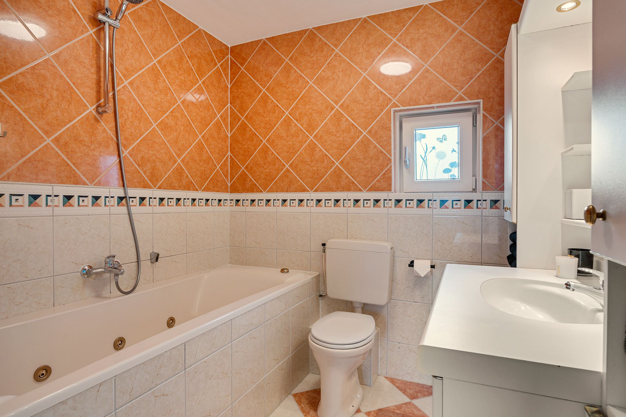 De overloop is afgewerkt met een laminaatvloer en biedt toegang tot drie slaapkamers van goed formaat, allen voorzien van laminaatvloeren. De volledig betegelde badkamer is ingericht met een ligbad/douchecombinatie, een wastafelmeubel en een tweede toilet.