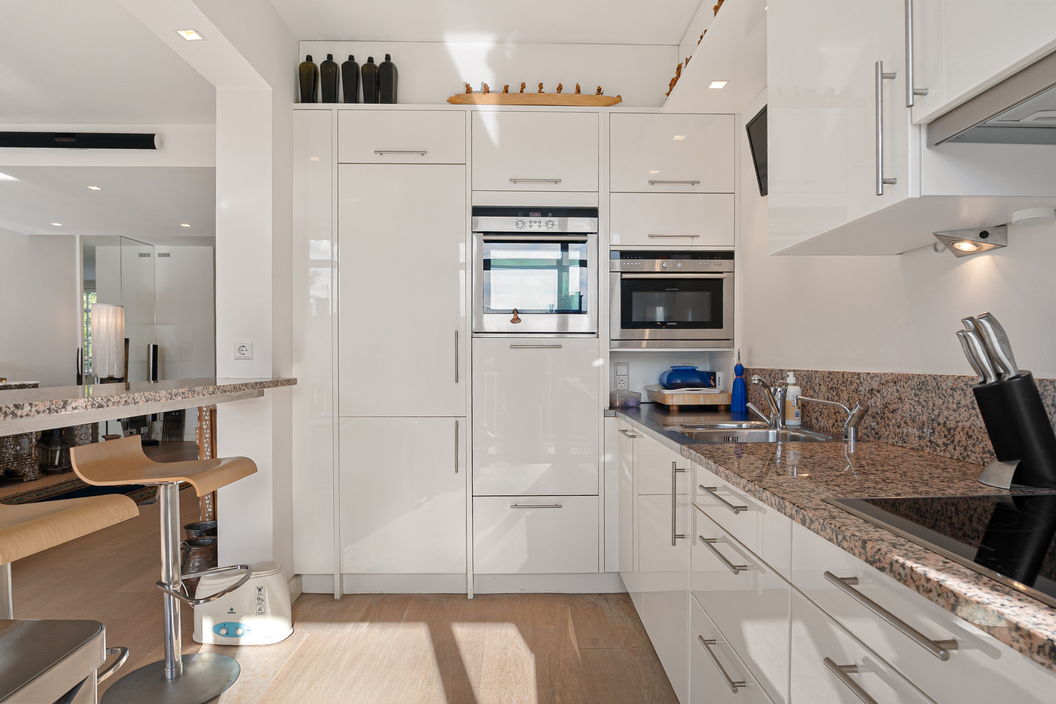 De hoofdslaapkamer beschikt over een maatwerk kastenwand met ingebouwde TV en biedt directe toegang tot het balkon. Voor extra comfort is deze kamer voorzien van een airco-unit. De open keuken is uitgevoerd met Siemens inbouwapparatuur, een vaatwasser op heuphoogte en een gezellige bar. Zowel de hoofdslaapkamer als de leefkeuken en woonkamer hebben toegang tot het royale balkon op het zuidwesten.